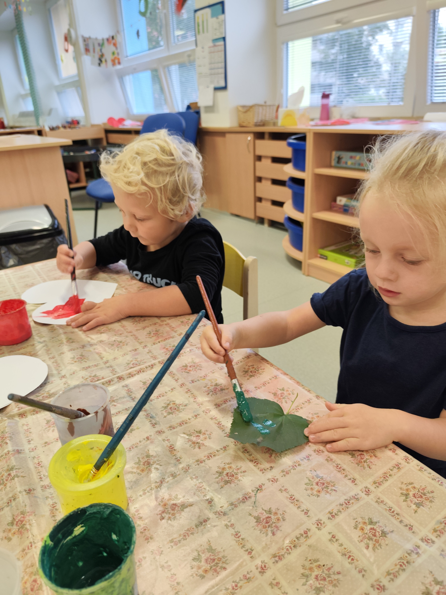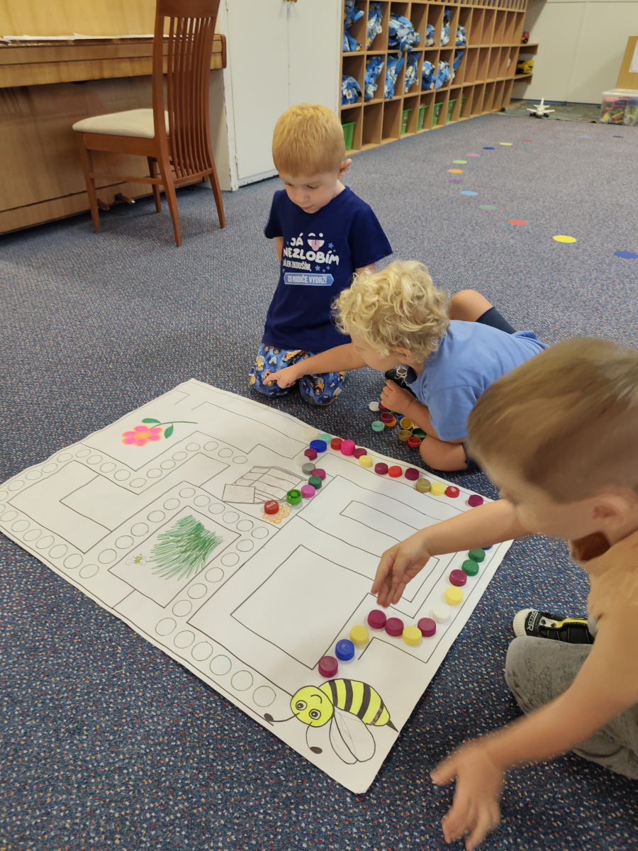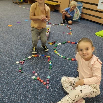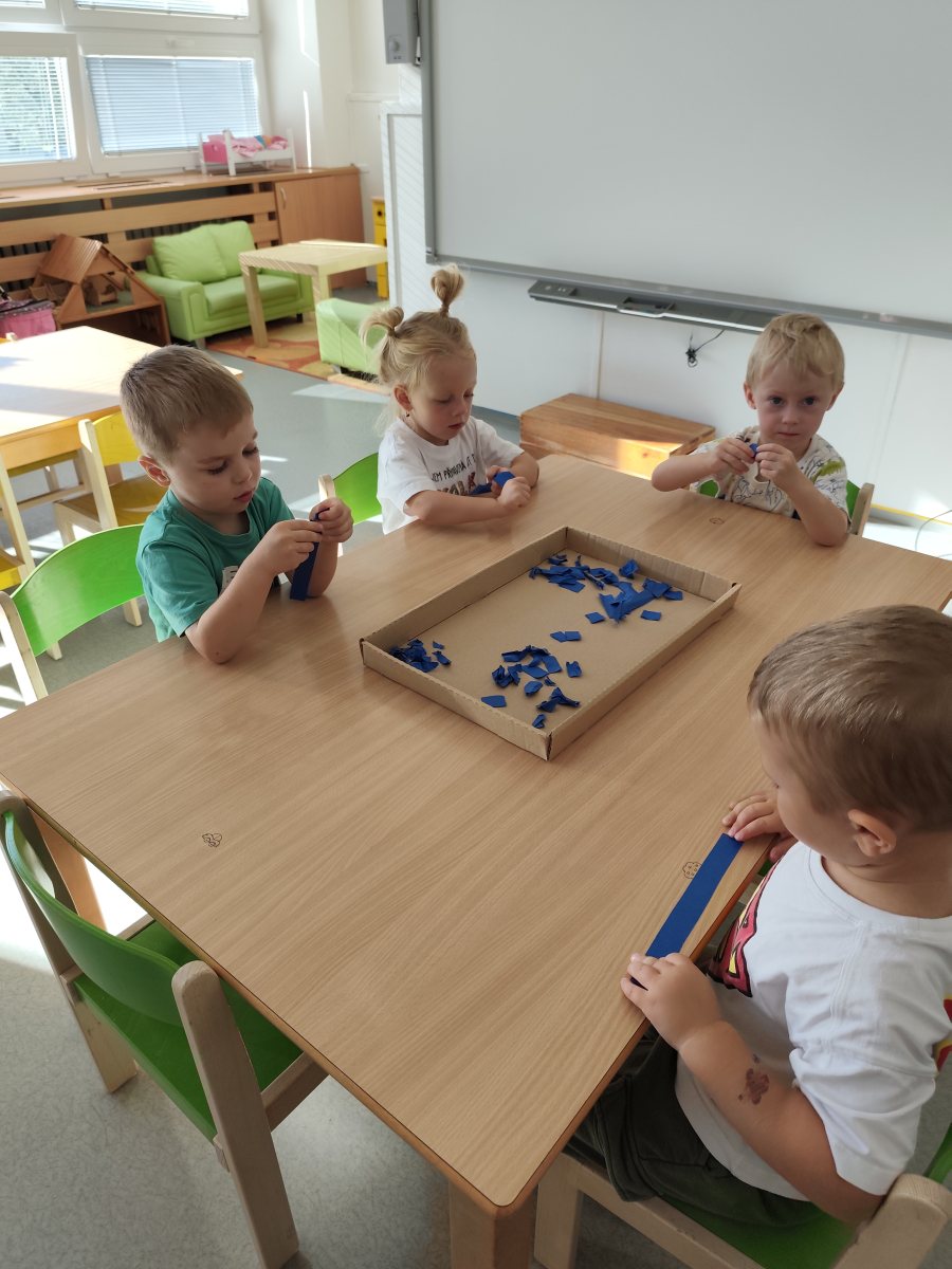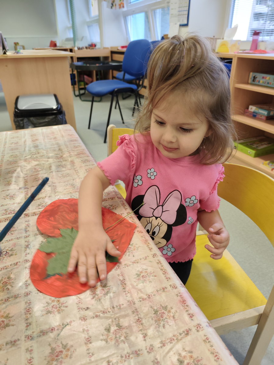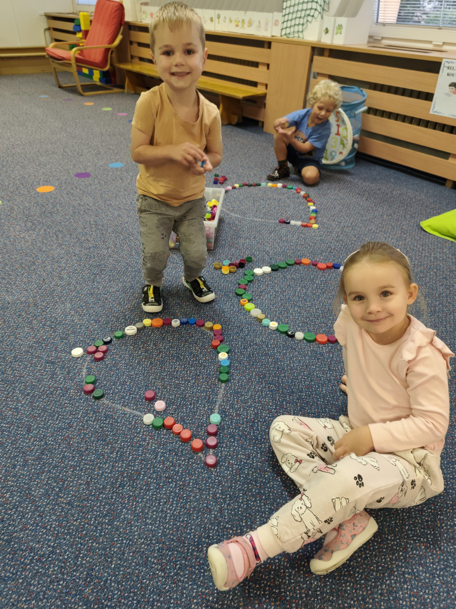 S dětmi jsem se i nadále sbližovali s prostředím školky a seznamovali se s pravidly, které nám pomáhají s tím, jak se chovat ve školce. Jedním z pravidel o kterém jsme si povídali bylo třeba "Hračkové" ke kterému, jsem se naučili i písničku. Ke "Kapičkovému" pravidlu jsme si zase natrhali barevný papír k tvoření společné práce (Kapka). Výtvarně se děti ještě vyřadili malbou srdíčka a obtiskem listů, který jsme šli společně hledat během pobytu venku. Děti si také naučili novo hru, obušku z pytle ven, kterou si hned oblíbily. K procvičení prstíku, jsme využívali různé hry a aktivity jako např. vytváření obrázků nebo hledání cesty v bludišti s pomocí PET víček, ale také přiřazování kolíčků a navlékání korálků během smyslohraní. Novým zážitkem bylo pro některé děti odšťavňování a následné ochutnávání.
