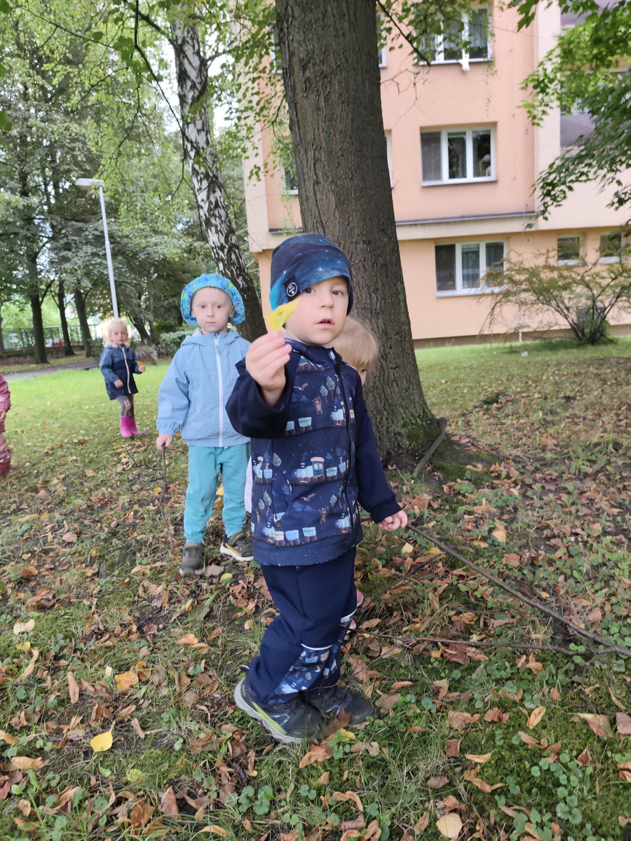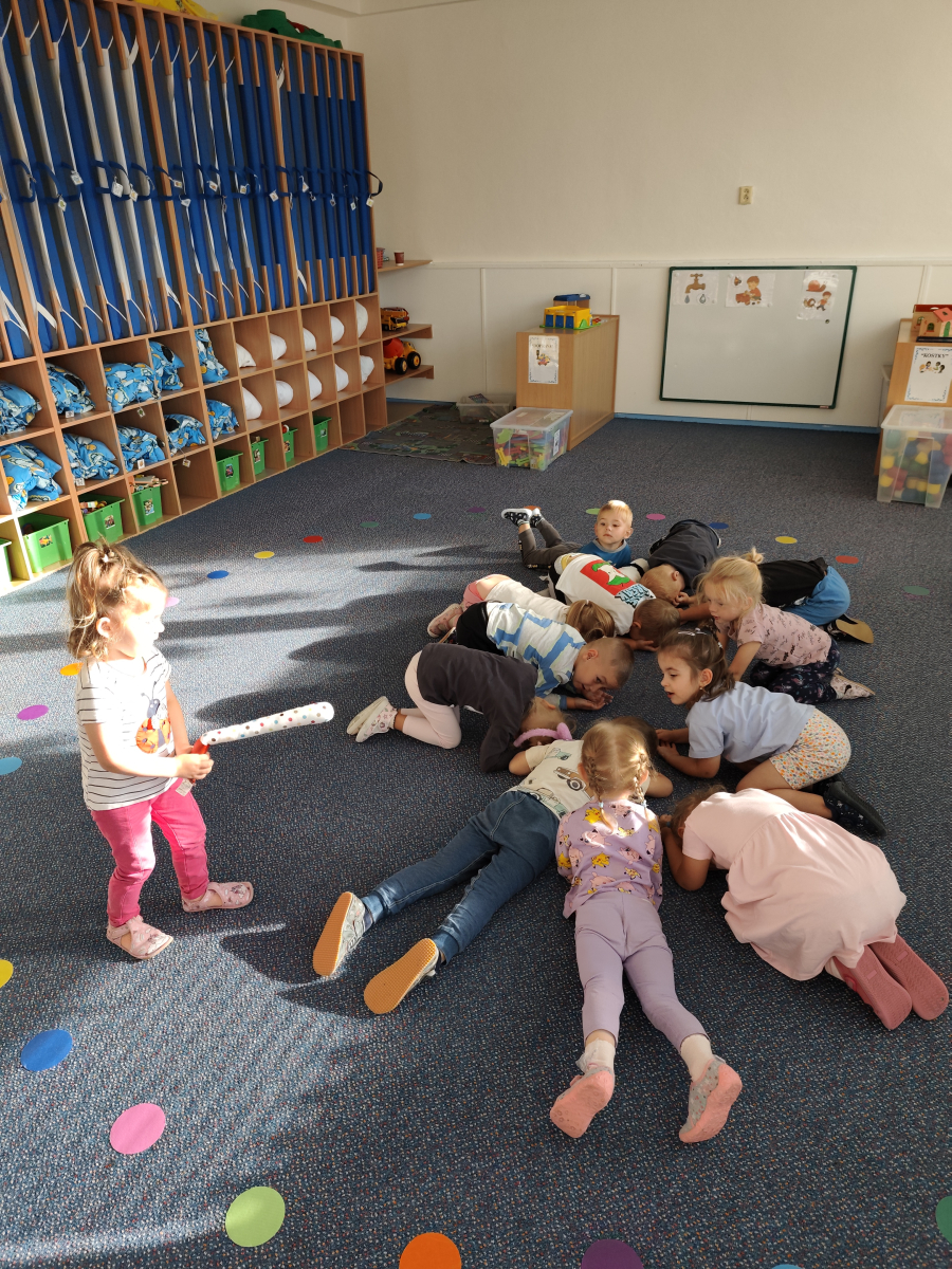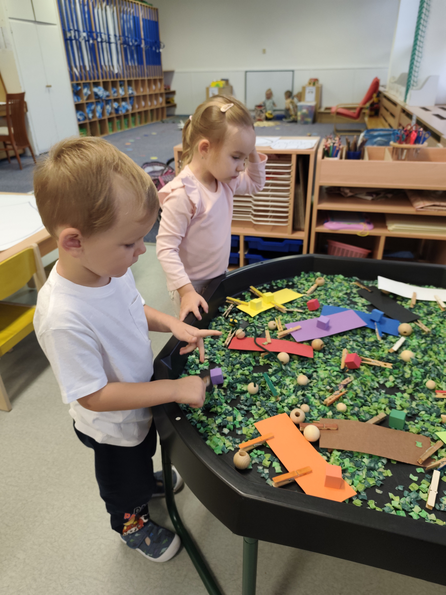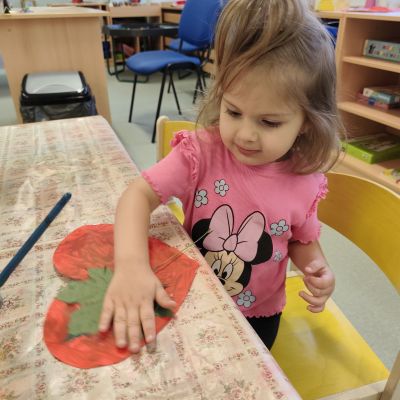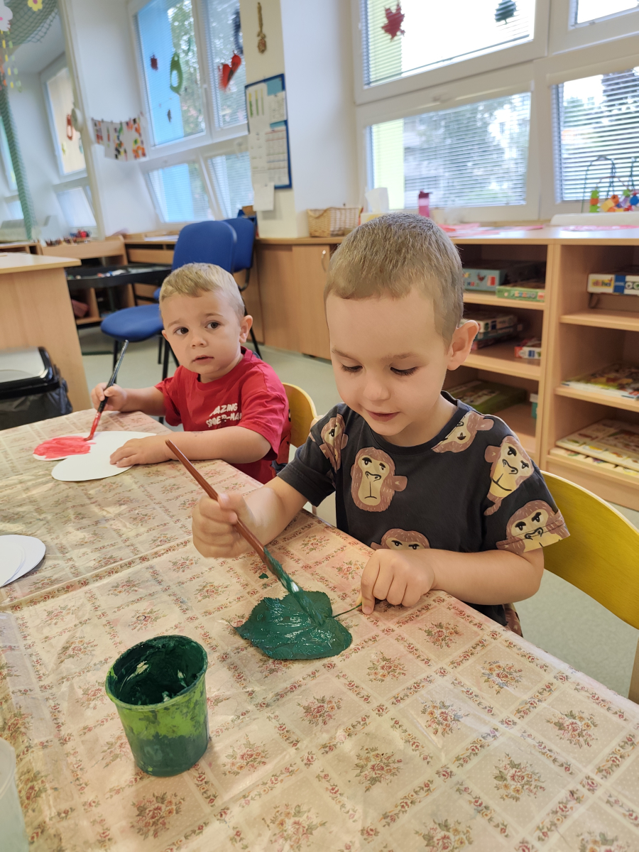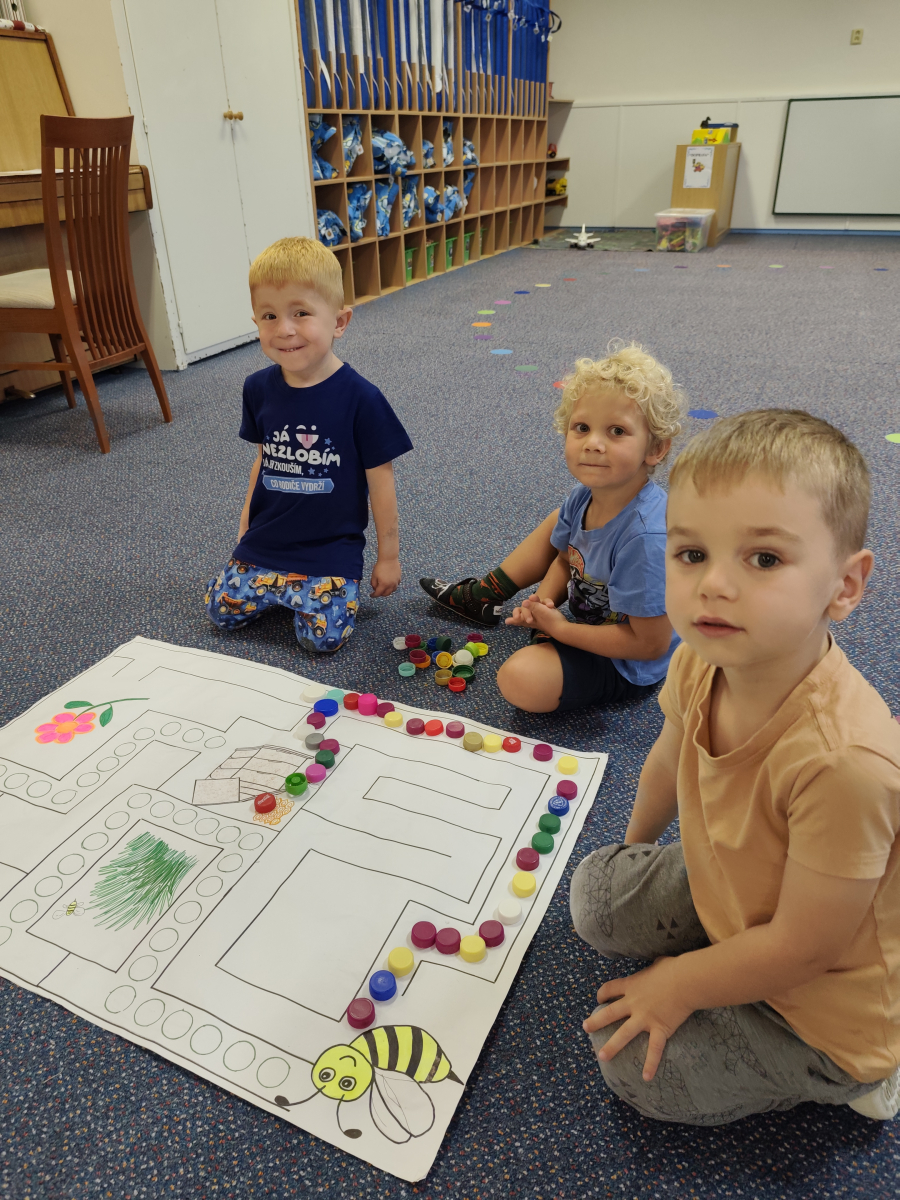 S dětmi jsem se i nadále sbližovali s prostředím školky a seznamovali se s pravidly, které nám pomáhají s tím, jak se chovat ve školce. Jedním z pravidel o kterém jsme si povídali bylo třeba "Hračkové" ke kterému, jsem se naučili i písničku. Ke "Kapičkovému" pravidlu jsme si zase natrhali barevný papír k tvoření společné práce (Kapka). Výtvarně se děti ještě vyřadili malbou srdíčka a obtiskem listů, který jsme šli společně hledat během pobytu venku. Děti si také naučili novo hru, obušku z pytle ven, kterou si hned oblíbily. K procvičení prstíku, jsme využívali různé hry a aktivity jako např. vytváření obrázků nebo hledání cesty v bludišti s pomocí PET víček, ale také přiřazování kolíčků a navlékání korálků během smyslohraní. Novým zážitkem bylo pro některé děti odšťavňování a následné ochutnávání.