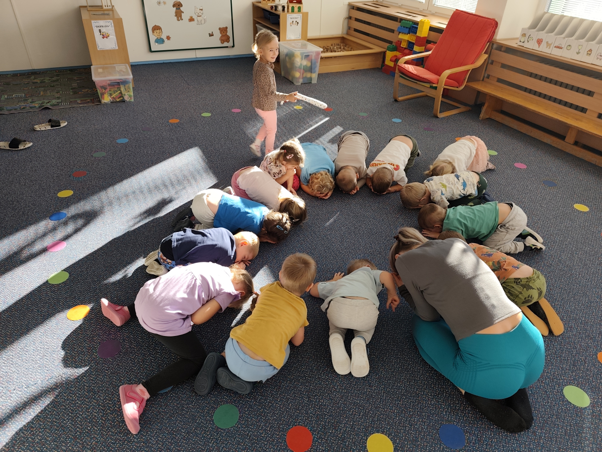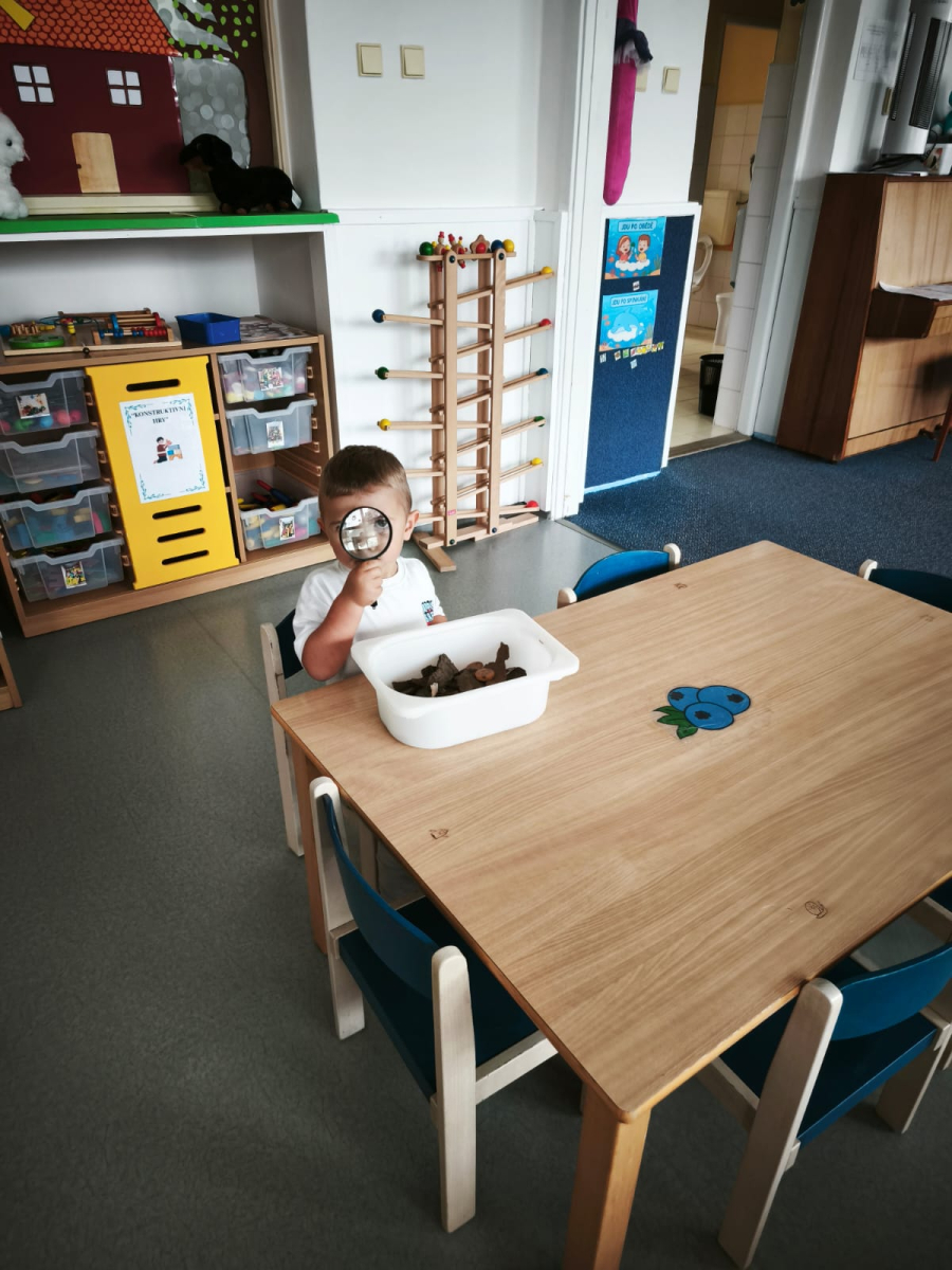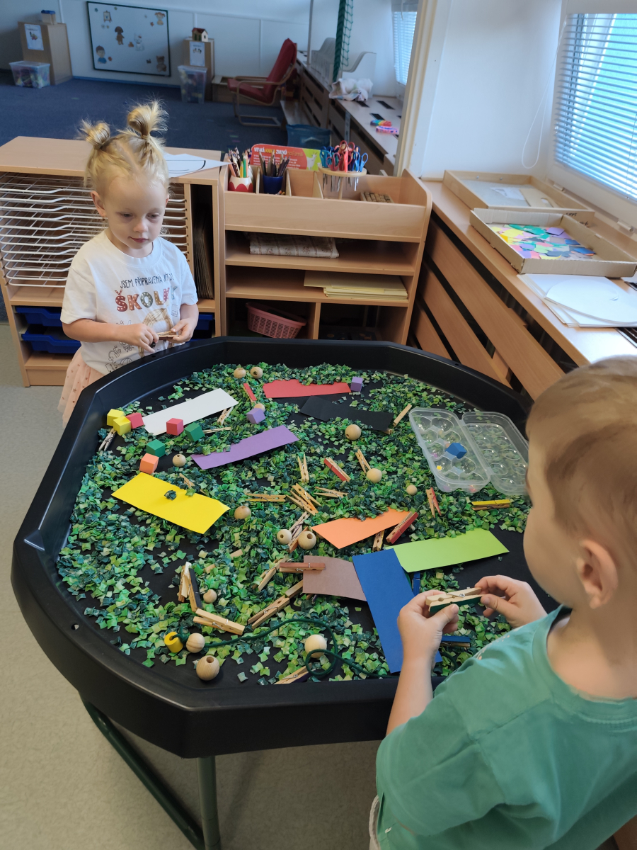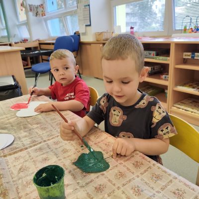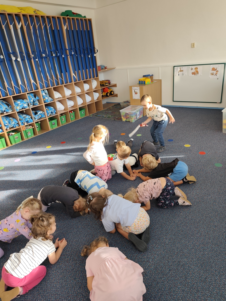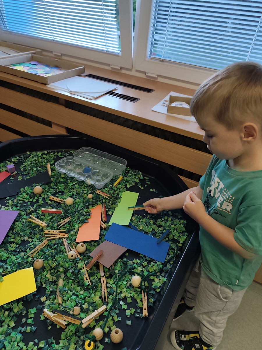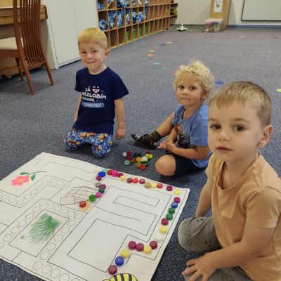 S dětmi jsem se i nadále sbližovali s prostředím školky a seznamovali se s pravidly, které nám pomáhají s tím, jak se chovat ve školce. Jedním z pravidel o kterém jsme si povídali bylo třeba "Hračkové" ke kterému, jsem se naučili i písničku. Ke "Kapičkovému" pravidlu jsme si zase natrhali barevný papír k tvoření společné práce (Kapka). Výtvarně se děti ještě vyřadili malbou srdíčka a obtiskem listů, který jsme šli společně hledat během pobytu venku. Děti si také naučili novo hru, obušku z pytle ven, kterou si hned oblíbily. K procvičení prstíku, jsme využívali různé hry a aktivity jako např. vytváření obrázků nebo hledání cesty v bludišti s pomocí PET víček, ale také přiřazování kolíčků a navlékání korálků během smyslohraní. Novým zážitkem bylo pro některé děti odšťavňování a následné ochutnávání.