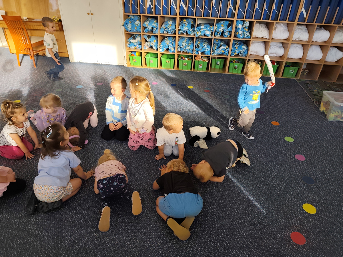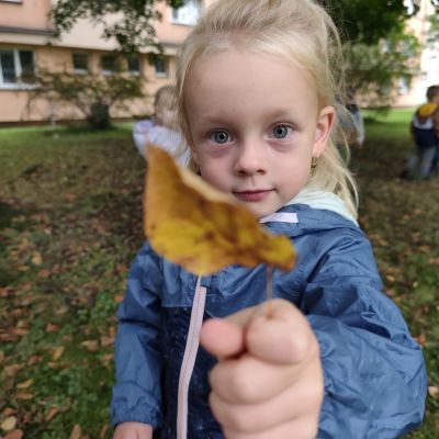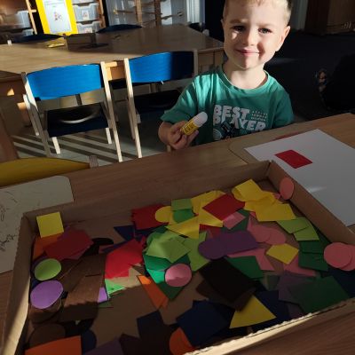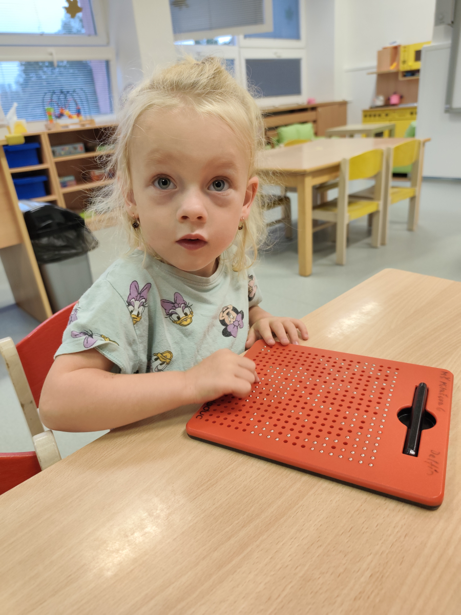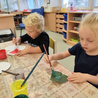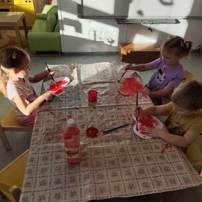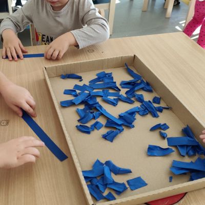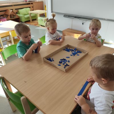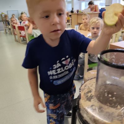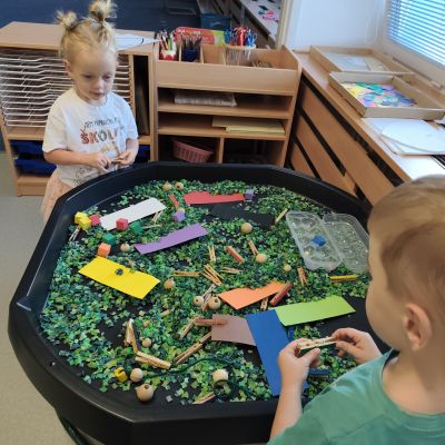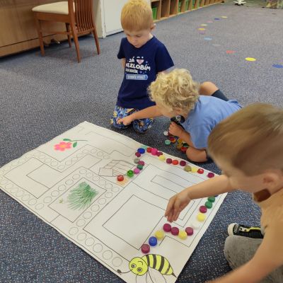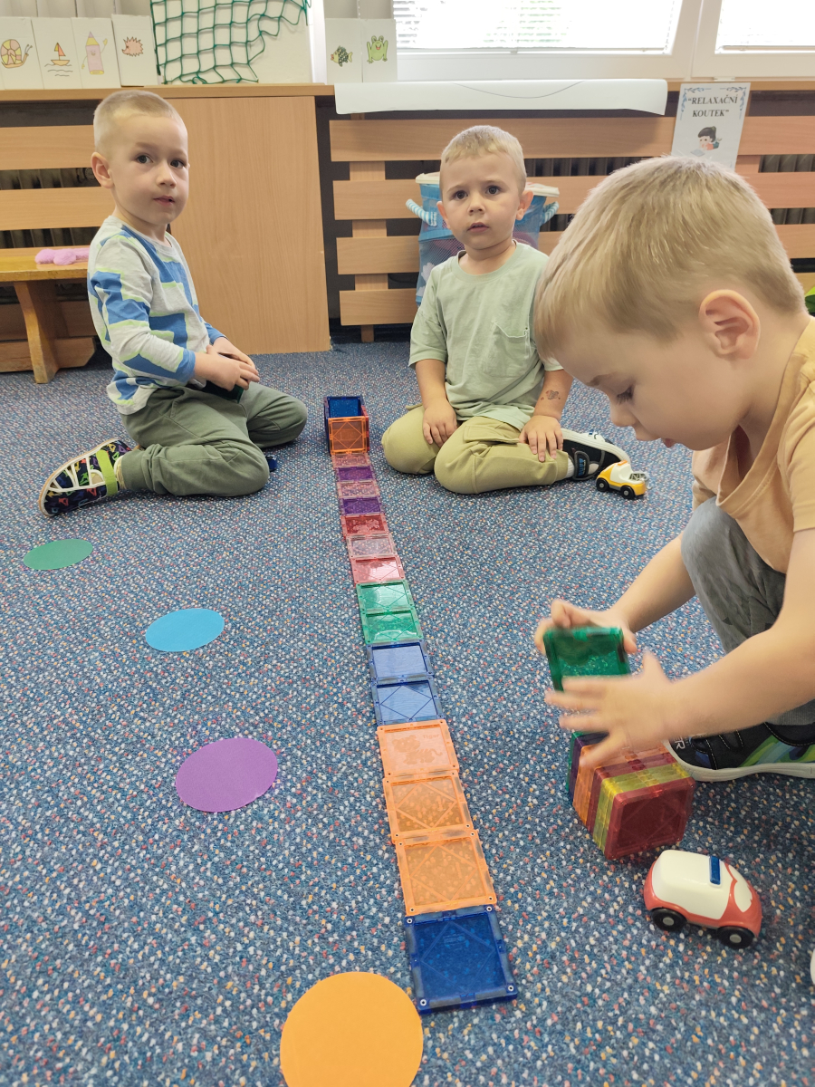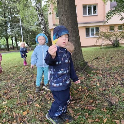 S dětmi jsem se i nadále sbližovali s prostředím školky a seznamovali se s pravidly, které nám pomáhají s tím, jak se chovat ve školce. Jedním z pravidel o kterém jsme si povídali bylo třeba "Hračkové" ke kterému, jsem se naučili i písničku. Ke "Kapičkovému" pravidlu jsme si zase natrhali barevný papír k tvoření společné práce (Kapka). Výtvarně se děti ještě vyřadili malbou srdíčka a obtiskem listů, který jsme šli společně hledat během pobytu venku. Děti si také naučili novo hru, obušku z pytle ven, kterou si hned oblíbily. K procvičení prstíku, jsme využívali různé hry a aktivity jako např. vytváření obrázků nebo hledání cesty v bludišti s pomocí PET víček, ale také přiřazování kolíčků a navlékání korálků během smyslohraní. Novým zážitkem bylo pro některé děti odšťavňování a následné ochutnávání.