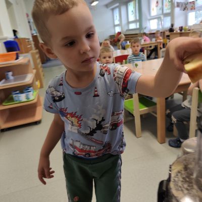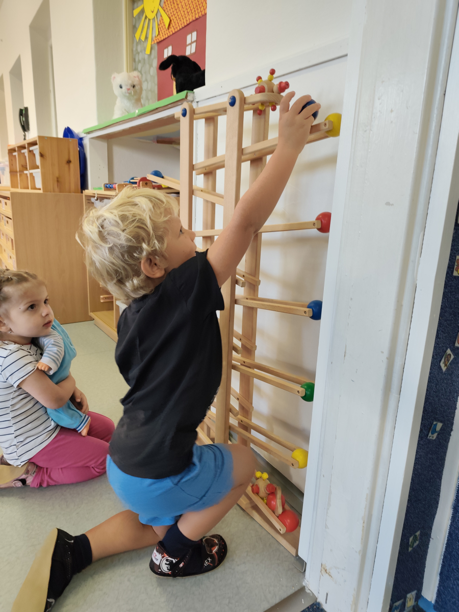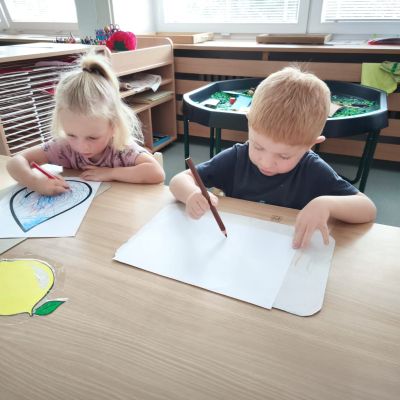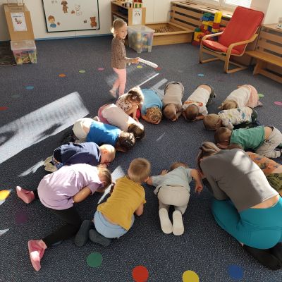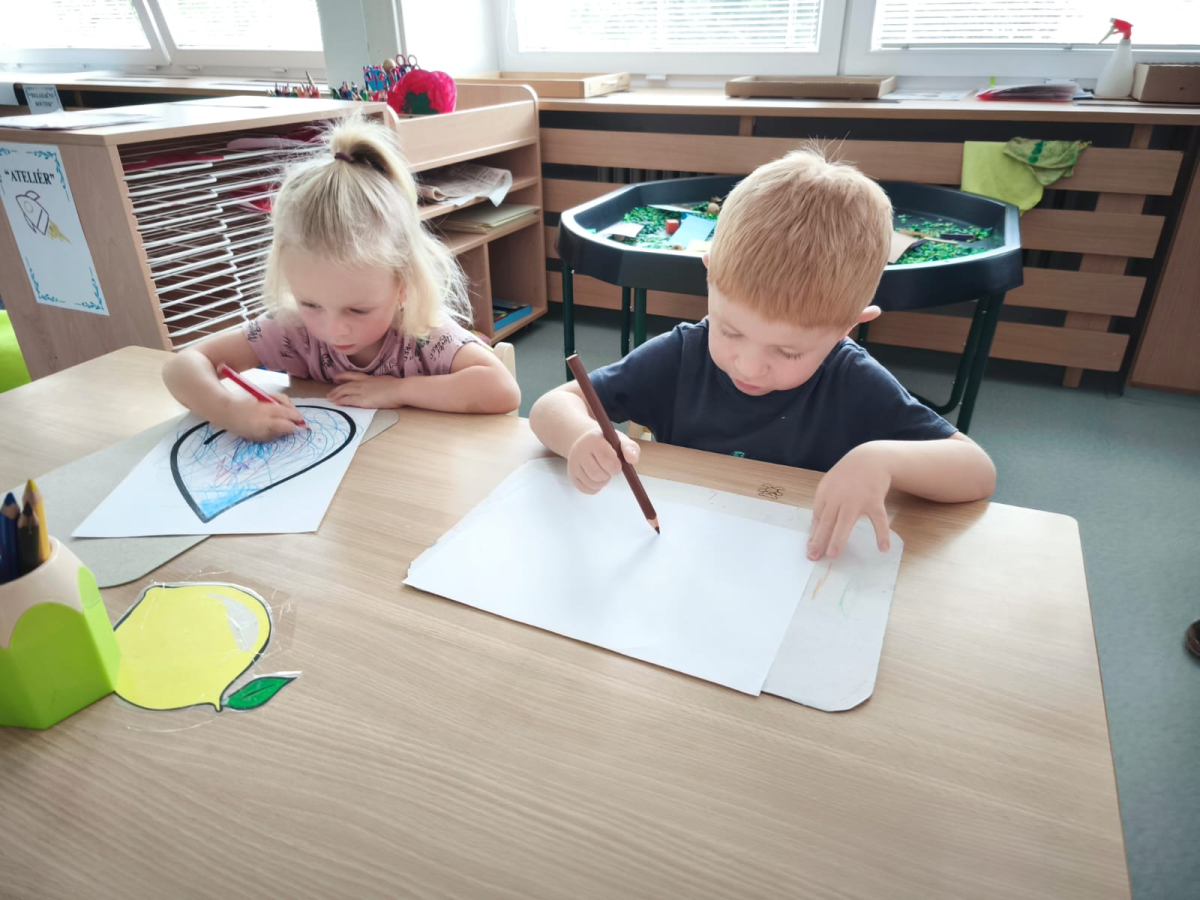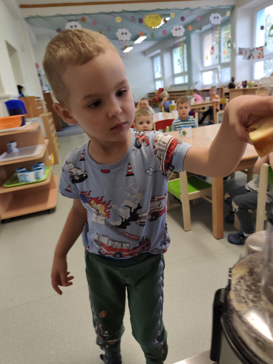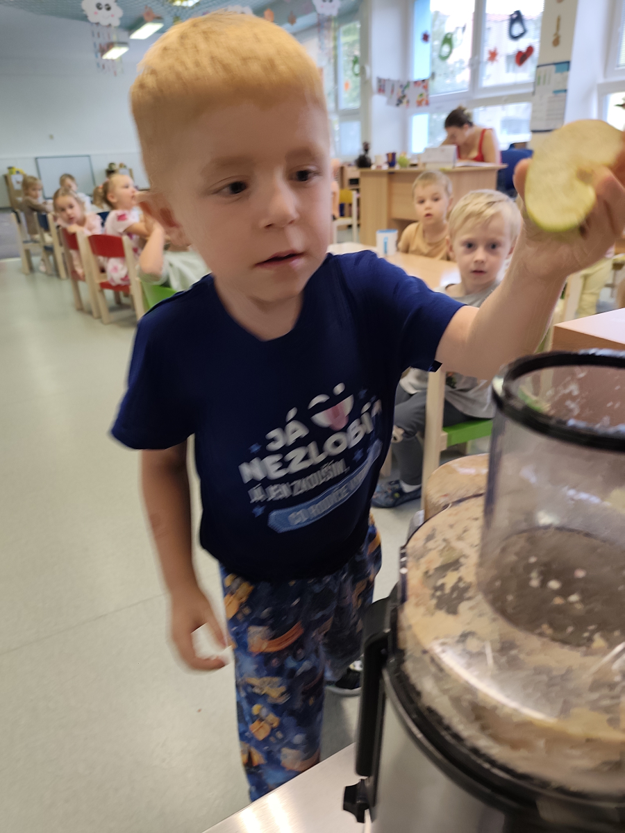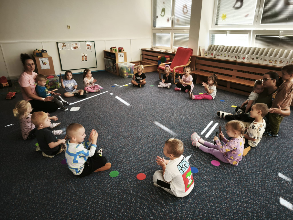 S dětmi jsem se i nadále sbližovali s prostředím školky a seznamovali se s pravidly, které nám pomáhají s tím, jak se chovat ve školce. Jedním z pravidel o kterém jsme si povídali bylo třeba "Hračkové" ke kterému, jsem se naučili i písničku. Ke "Kapičkovému" pravidlu jsme si zase natrhali barevný papír k tvoření společné práce (Kapka). Výtvarně se děti ještě vyřadili malbou srdíčka a obtiskem listů, který jsme šli společně hledat během pobytu venku. Děti si také naučili novo hru, obušku z pytle ven, kterou si hned oblíbily. K procvičení prstíku, jsme využívali různé hry a aktivity jako např. vytváření obrázků nebo hledání cesty v bludišti s pomocí PET víček, ale také přiřazování kolíčků a navlékání korálků během smyslohraní. Novým zážitkem bylo pro některé děti odšťavňování a následné ochutnávání.
