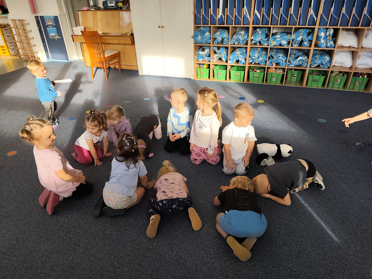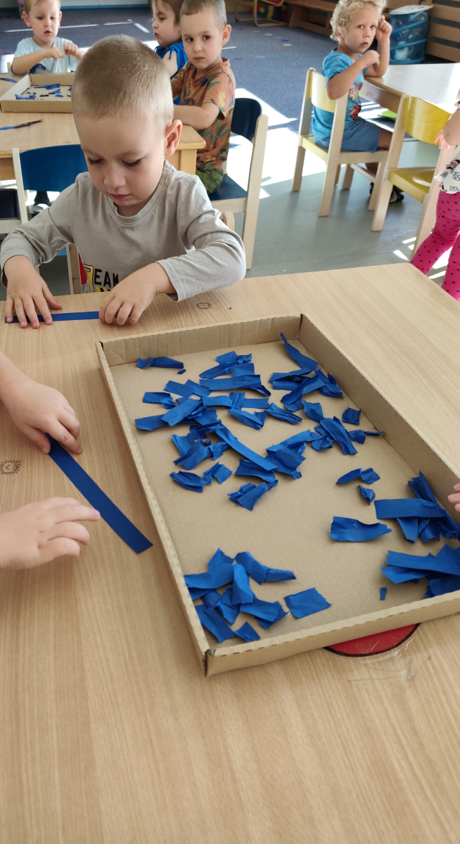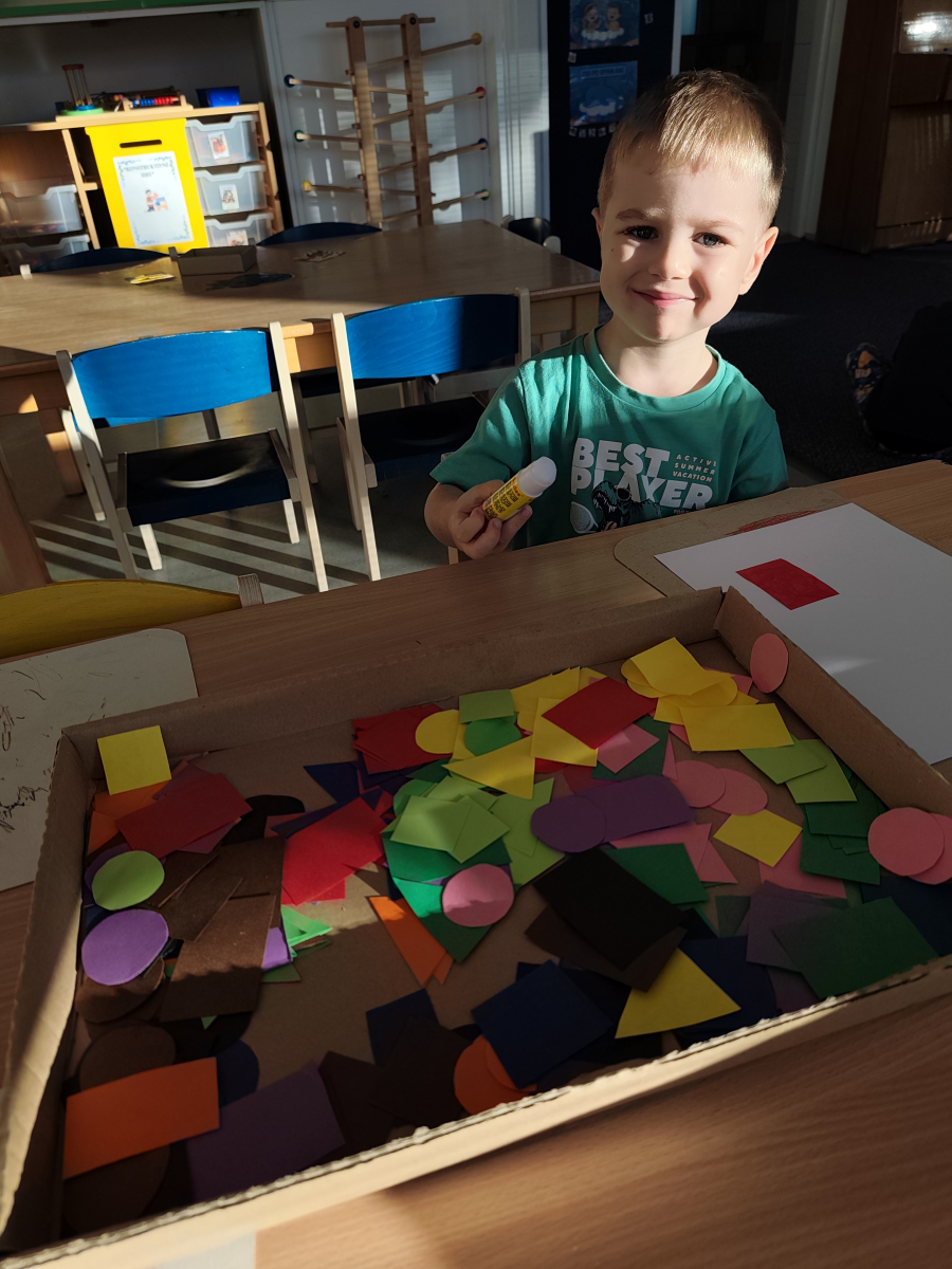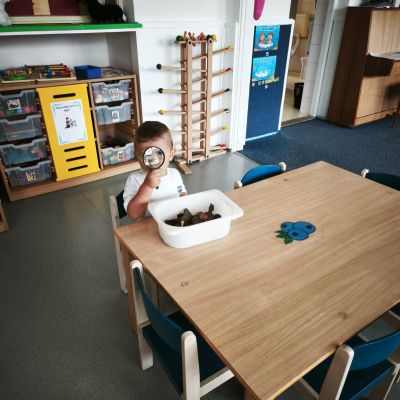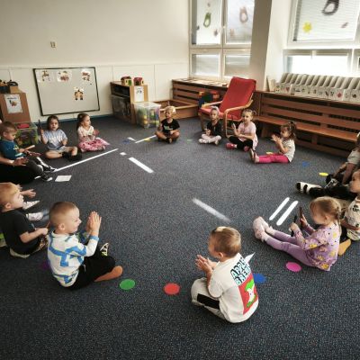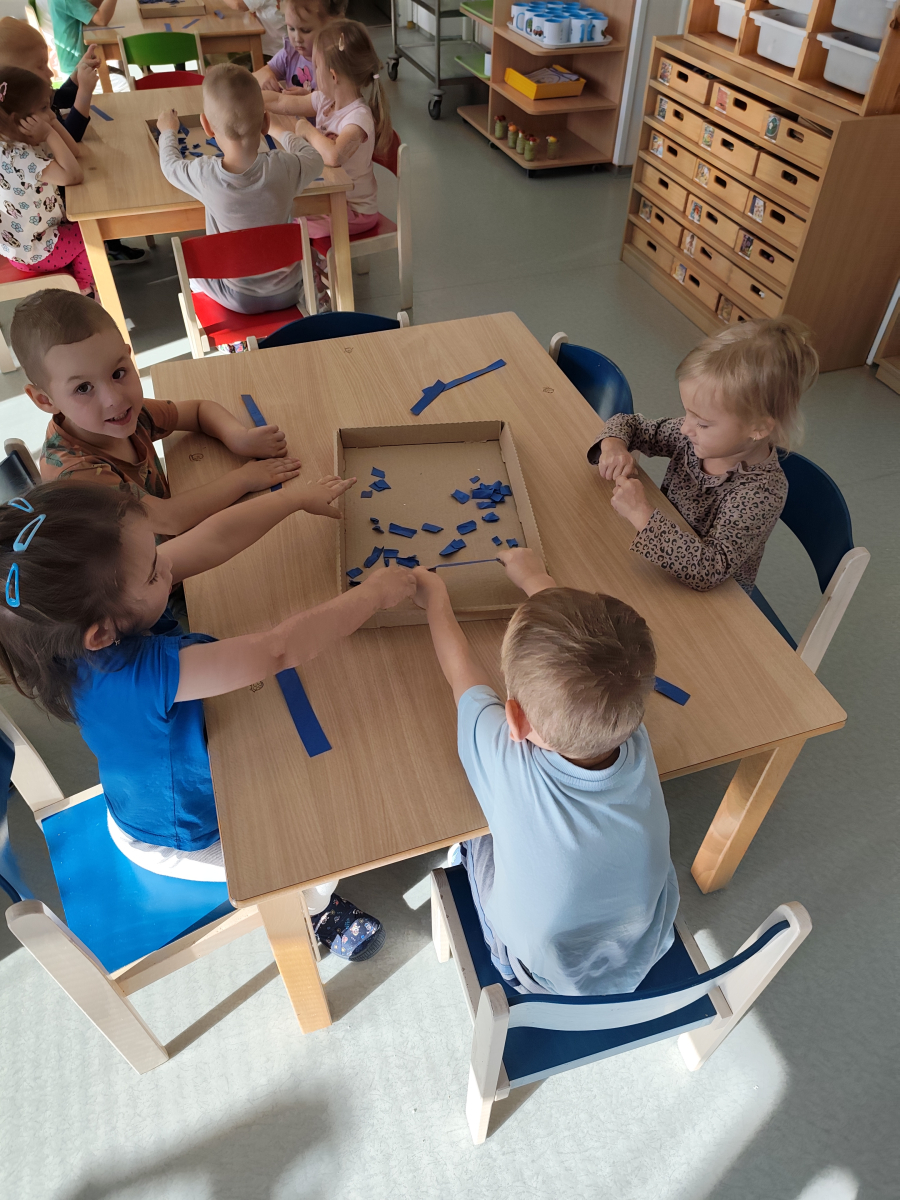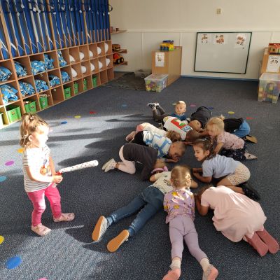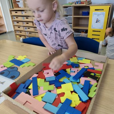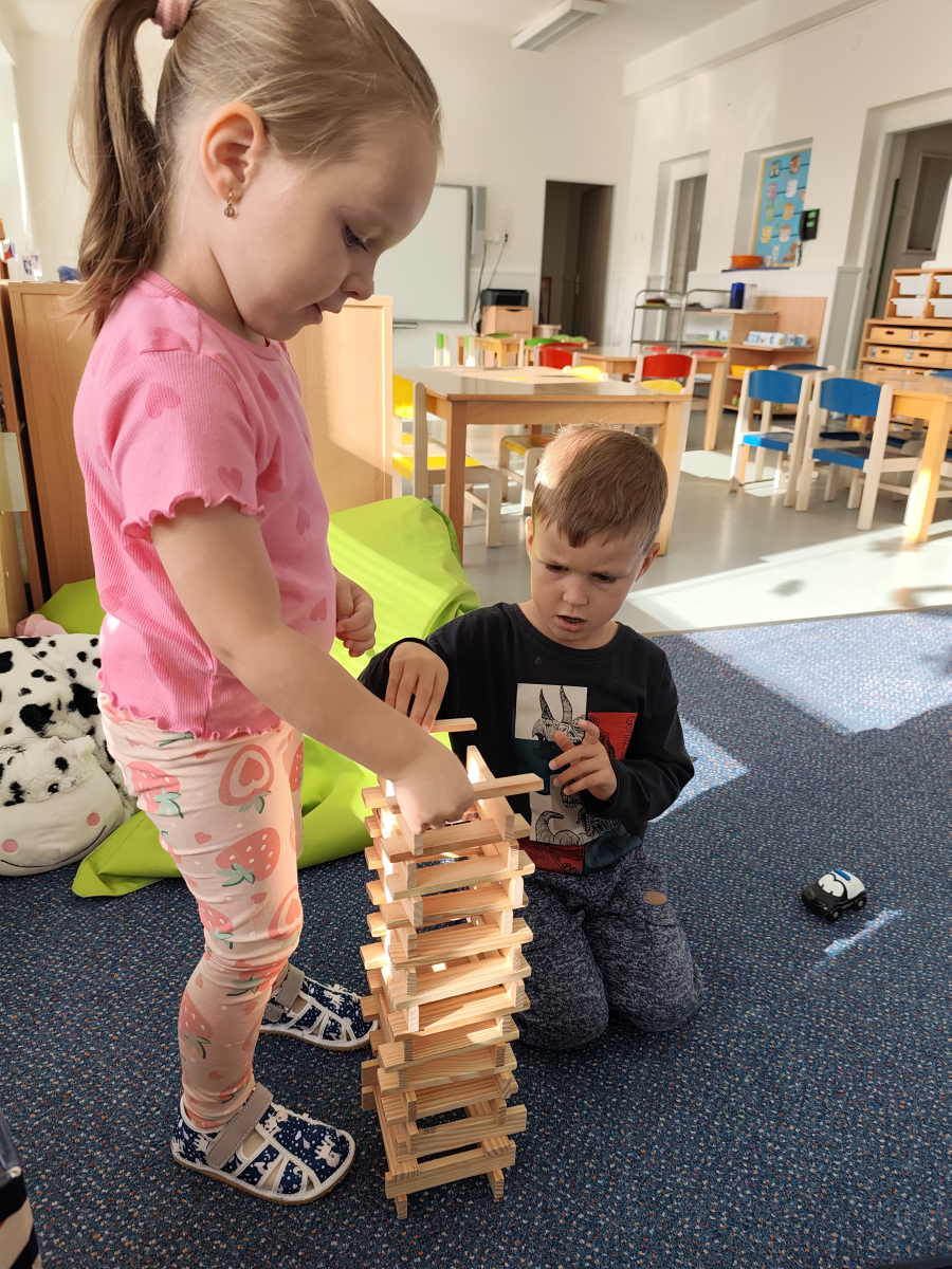 S dětmi jsem se i nadále sbližovali s prostředím školky a seznamovali se s pravidly, které nám pomáhají s tím, jak se chovat ve školce. Jedním z pravidel o kterém jsme si povídali bylo třeba "Hračkové" ke kterému, jsem se naučili i písničku. Ke "Kapičkovému" pravidlu jsme si zase natrhali barevný papír k tvoření společné práce (Kapka). Výtvarně se děti ještě vyřadili malbou srdíčka a obtiskem listů, který jsme šli společně hledat během pobytu venku. Děti si také naučili novo hru, obušku z pytle ven, kterou si hned oblíbily. K procvičení prstíku, jsme využívali různé hry a aktivity jako např. vytváření obrázků nebo hledání cesty v bludišti s pomocí PET víček, ale také přiřazování kolíčků a navlékání korálků během smyslohraní. Novým zážitkem bylo pro některé děti odšťavňování a následné ochutnávání.