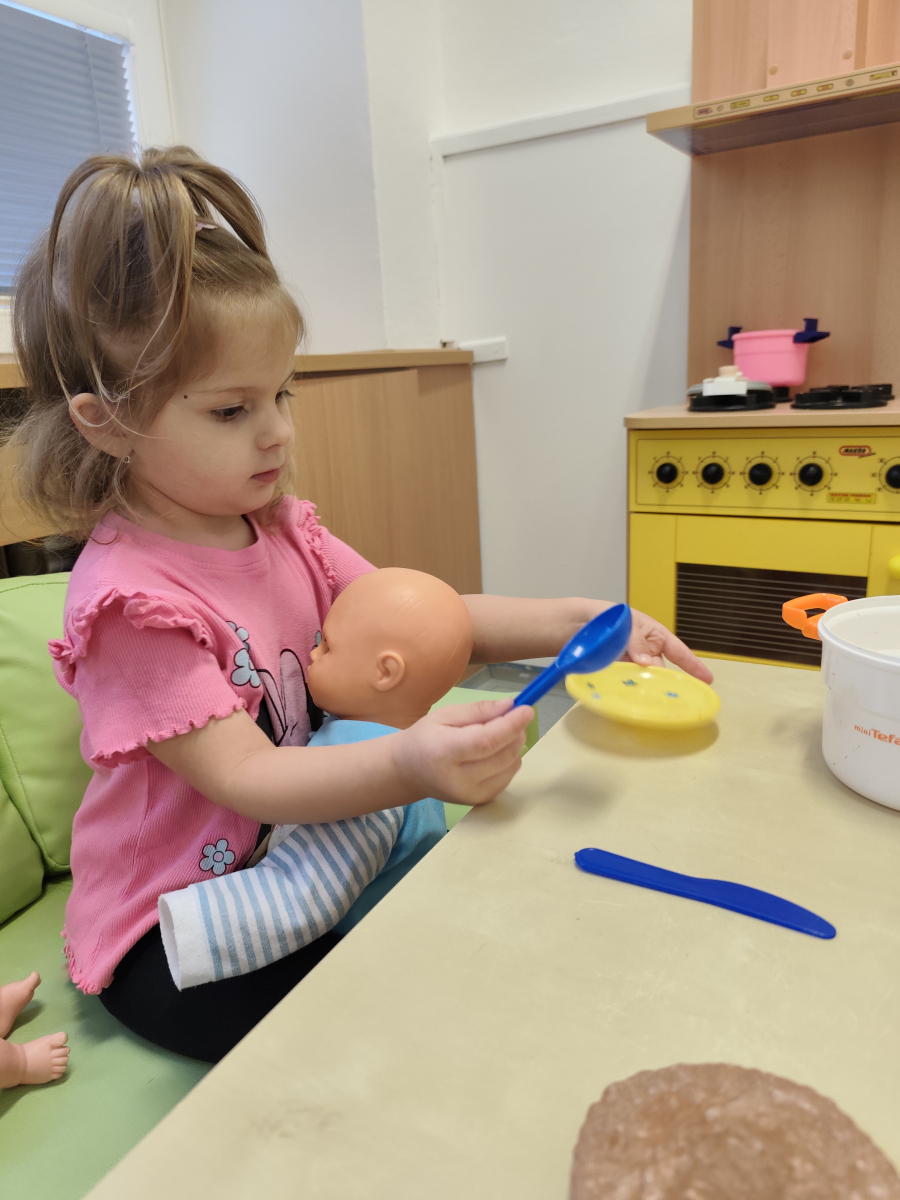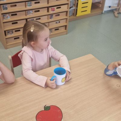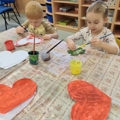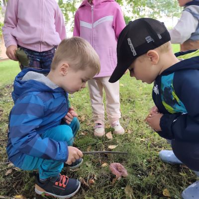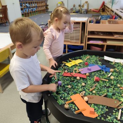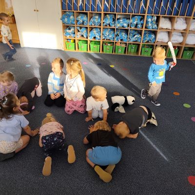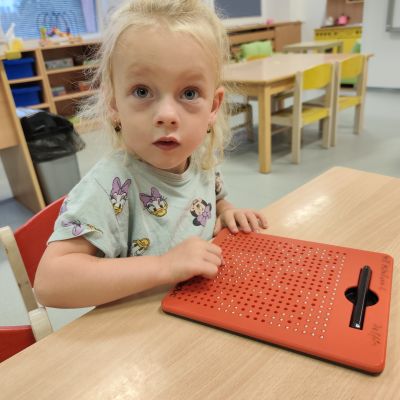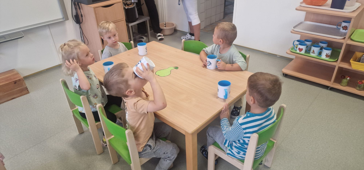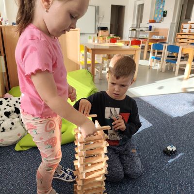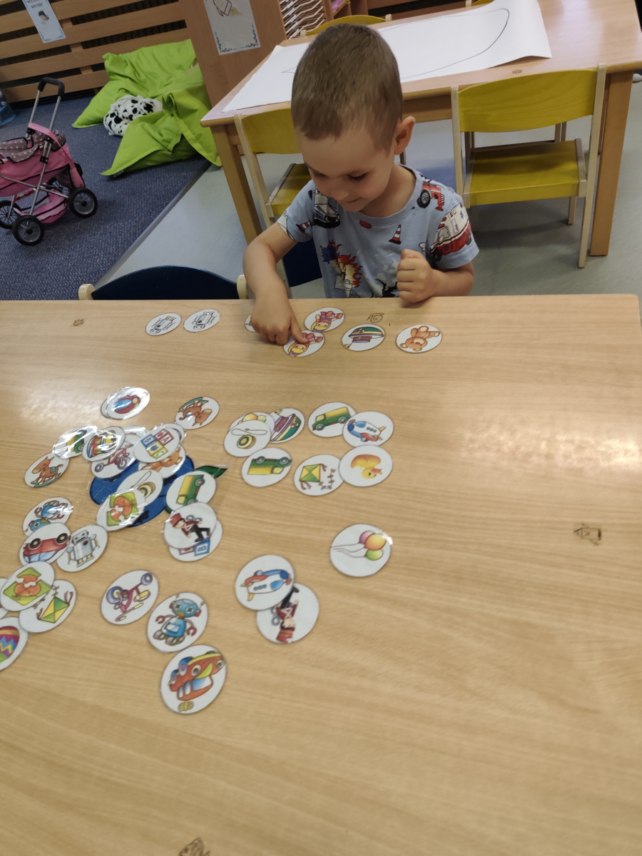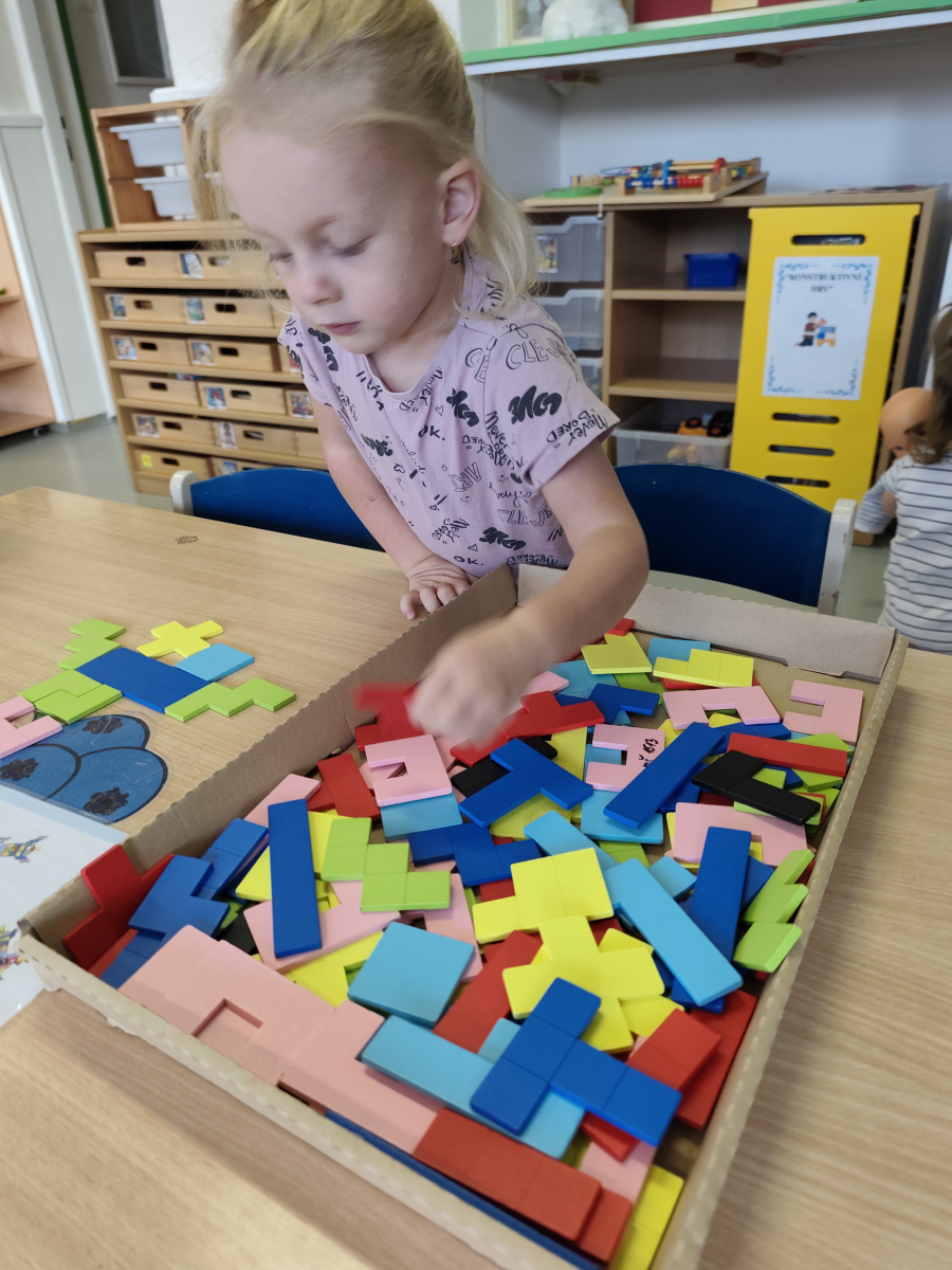 S dětmi jsem se i nadále sbližovali s prostředím školky a seznamovali se s pravidly, které nám pomáhají s tím, jak se chovat ve školce. Jedním z pravidel o kterém jsme si povídali bylo třeba "Hračkové" ke kterému, jsem se naučili i písničku. Ke "Kapičkovému" pravidlu jsme si zase natrhali barevný papír k tvoření společné práce (Kapka). Výtvarně se děti ještě vyřadili malbou srdíčka a obtiskem listů, který jsme šli společně hledat během pobytu venku. Děti si také naučili novo hru, obušku z pytle ven, kterou si hned oblíbily. K procvičení prstíku, jsme využívali různé hry a aktivity jako např. vytváření obrázků nebo hledání cesty v bludišti s pomocí PET víček, ale také přiřazování kolíčků a navlékání korálků během smyslohraní. Novým zážitkem bylo pro některé děti odšťavňování a následné ochutnávání.
