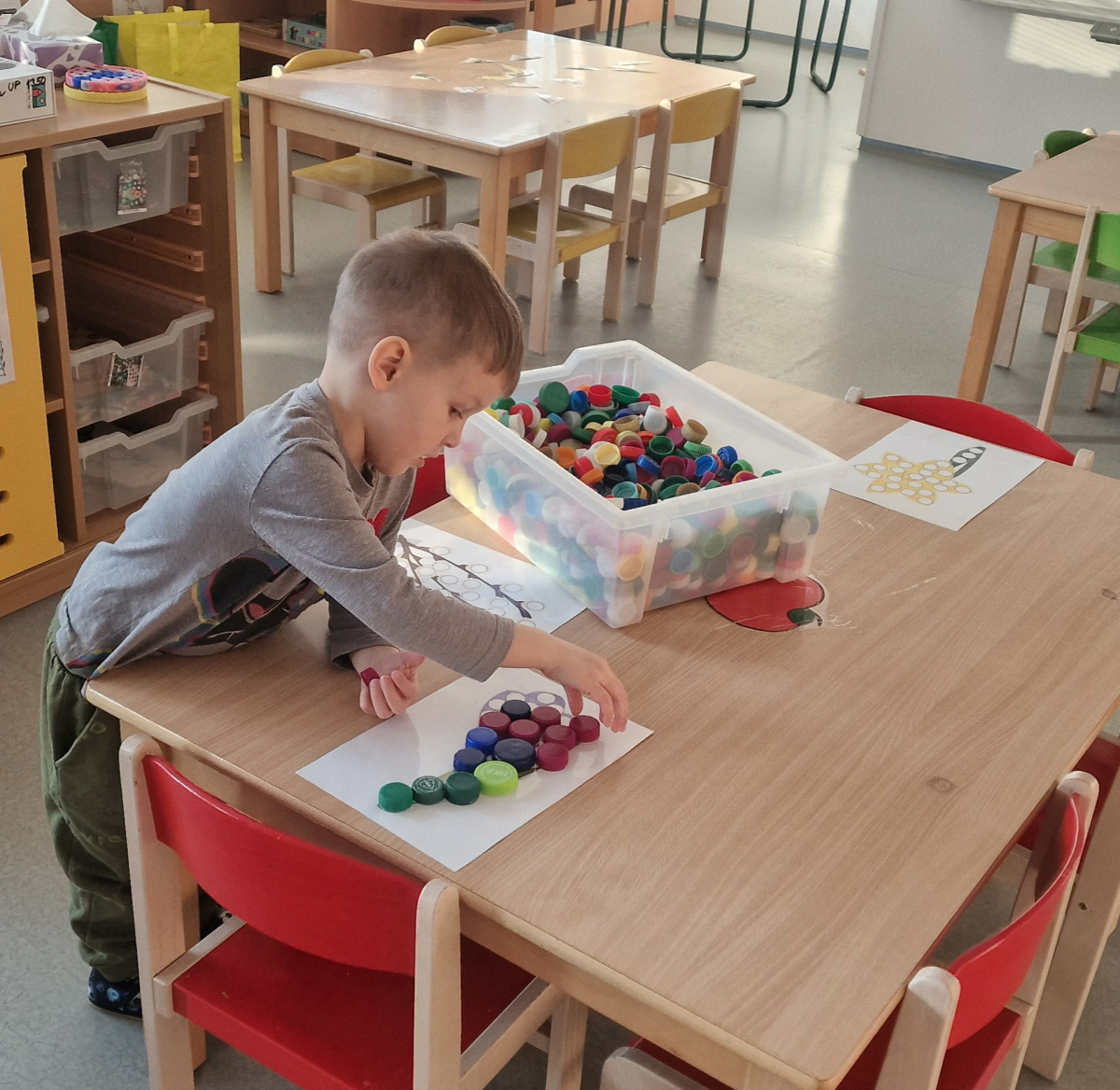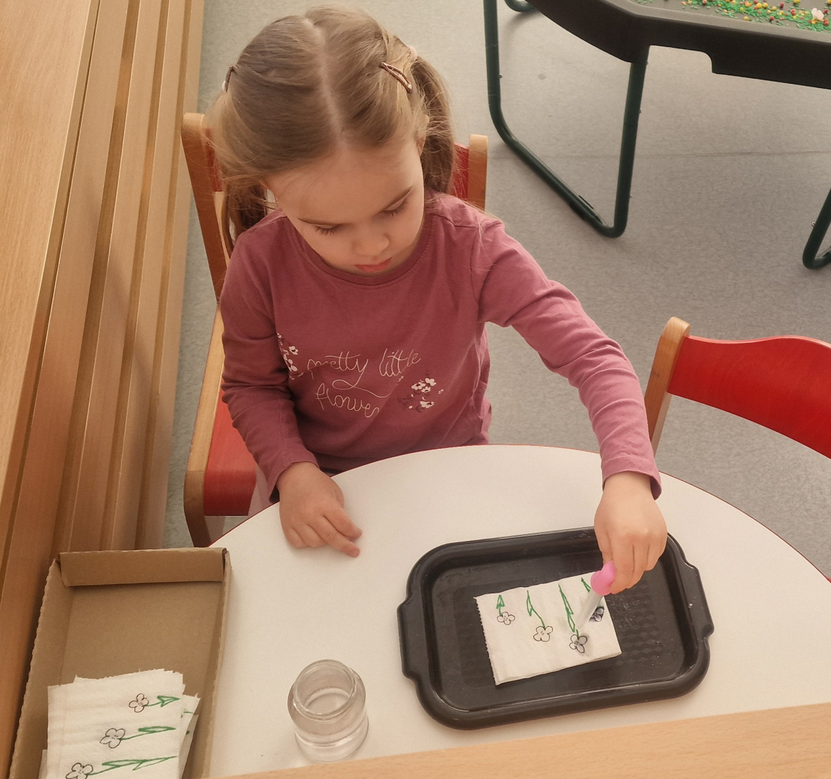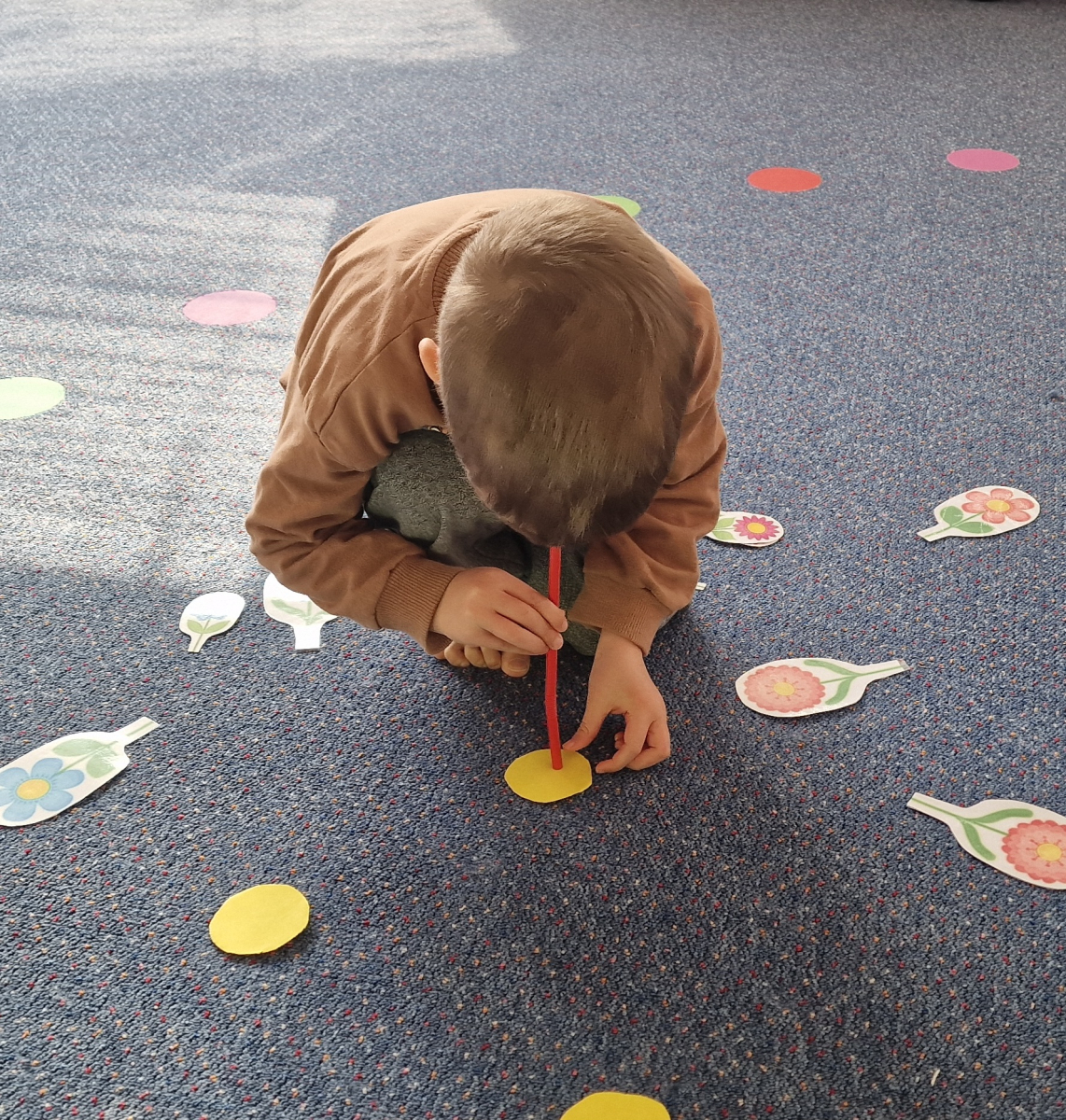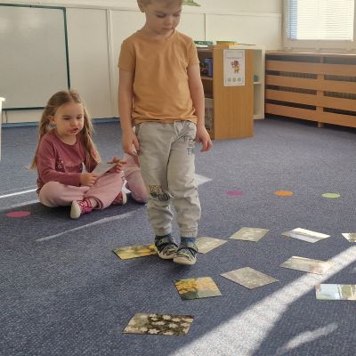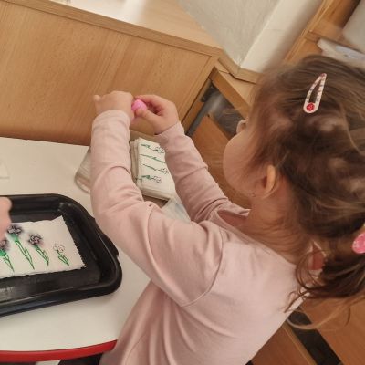 Při různých činnostech děti skládaly květiny z drobných prvků, pracovaly s puzzle, třídily předměty podle barev a rozvíjely tak jemnou motoriku, zrakové vnímání i logické myšlení. Ve výtvarných aktivitách tvořily jarní květiny různými technikami – malbou, lepením i otiskem dlaně.