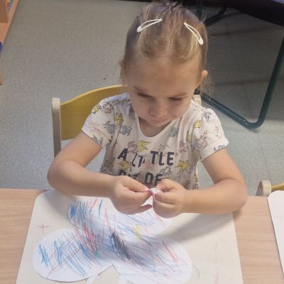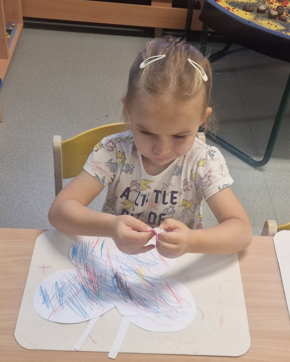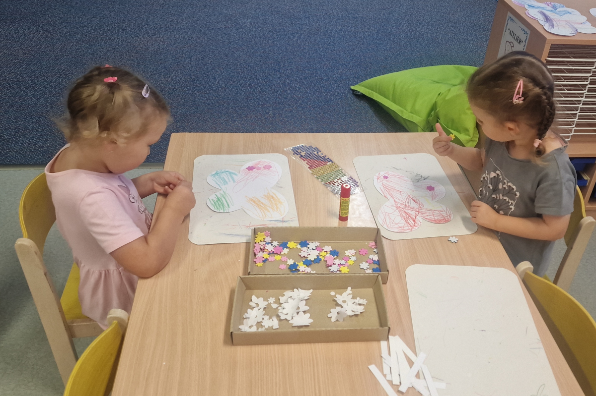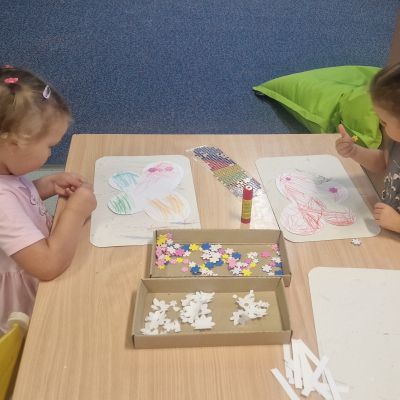 Vyrobili jsme si hned 2 motýlky - Jednoho barvami, které jsme poté obtiskli na druhou stranu a druhého jsme vymalovávali voskovkami a zdobily kytičkami a drahokami.