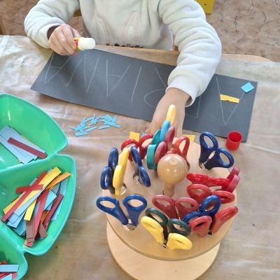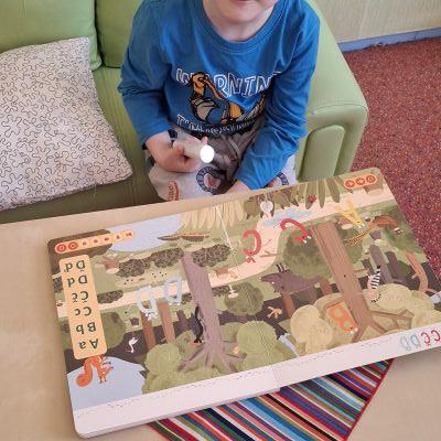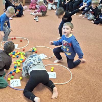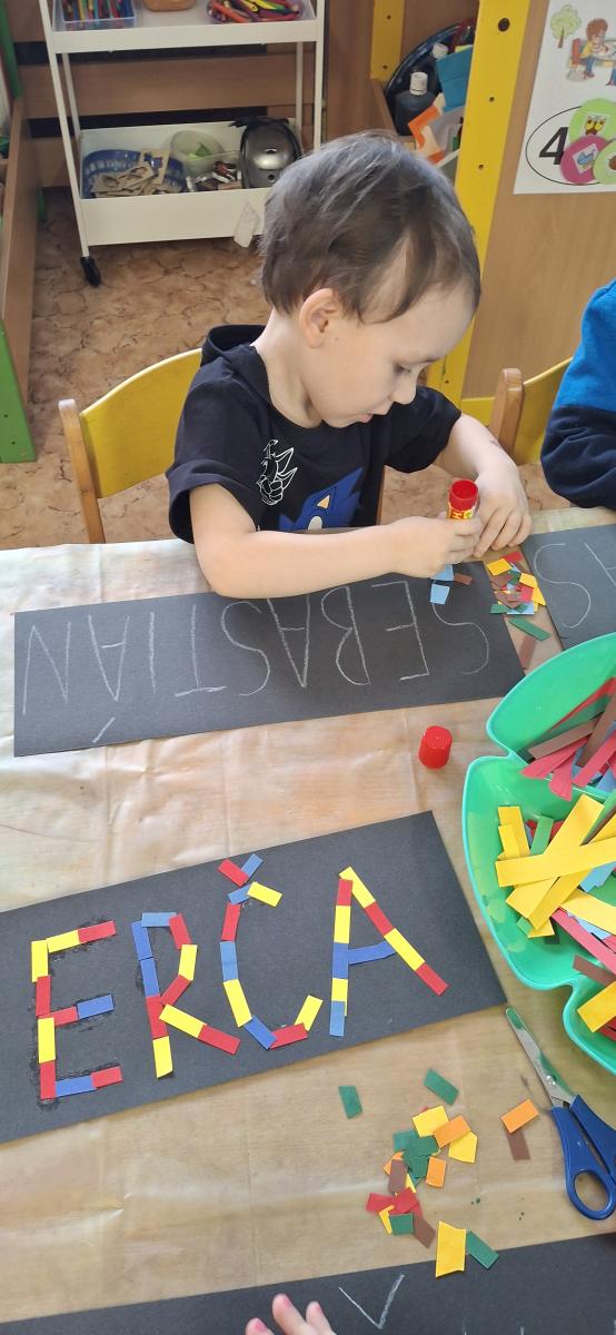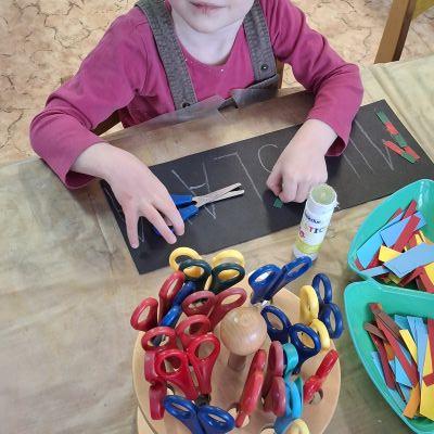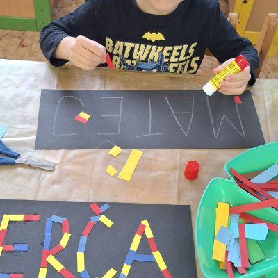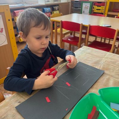V rámci pohybových her si děti vyzkoušely číselný vláček, kde se řadily podle posloupnosti, nebo písmenkový hon, při kterém trénovaly postřeh a zrakové vnímání. Velký úspěch měla také písmenková jóga, kdy děti vytvářely tvary písmen přímo svými těly. V našem tvořivém ateliéru se pak soustředily na vlastní jméno, které ztvárňovaly pomocí stříhání a lepení barevných papírů.