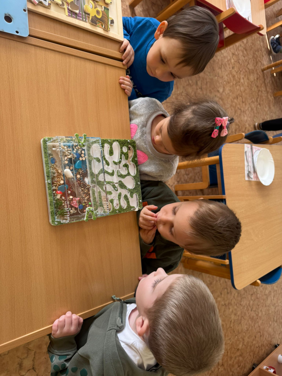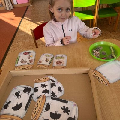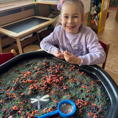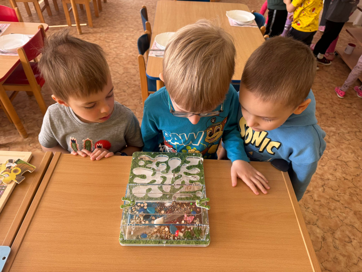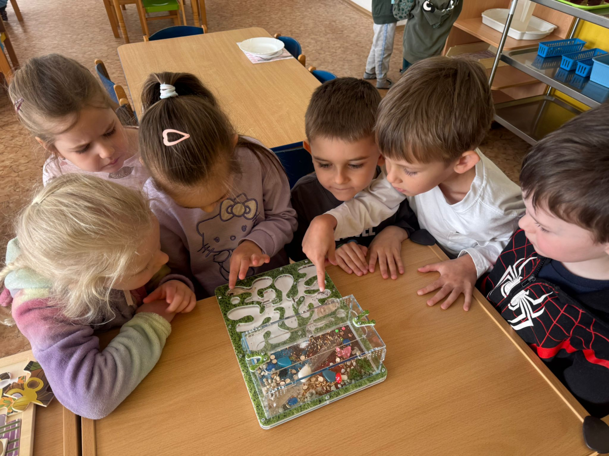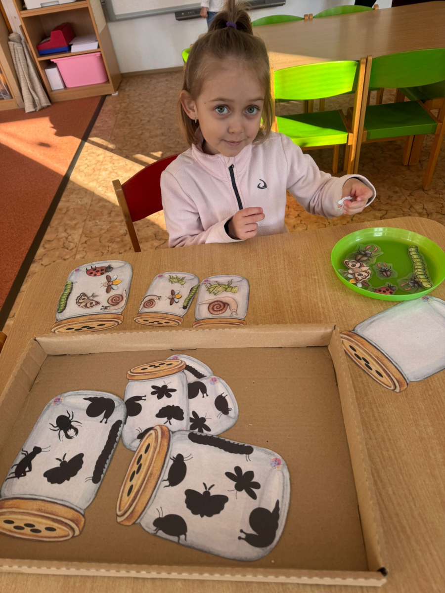 Děti si vyzkoušely smyslové hry (hledání hmyzu v rýži), procvičovaly logiku při skládání obrázků a počítaly tečky na beruškách. Rozvíjely jemnou motoriku při práci s kolíčky, bambulkami i výtvarném tvoření „Kdo se schovává v trávě“.