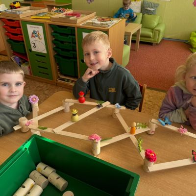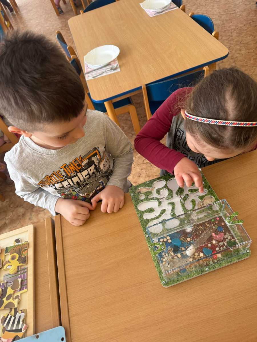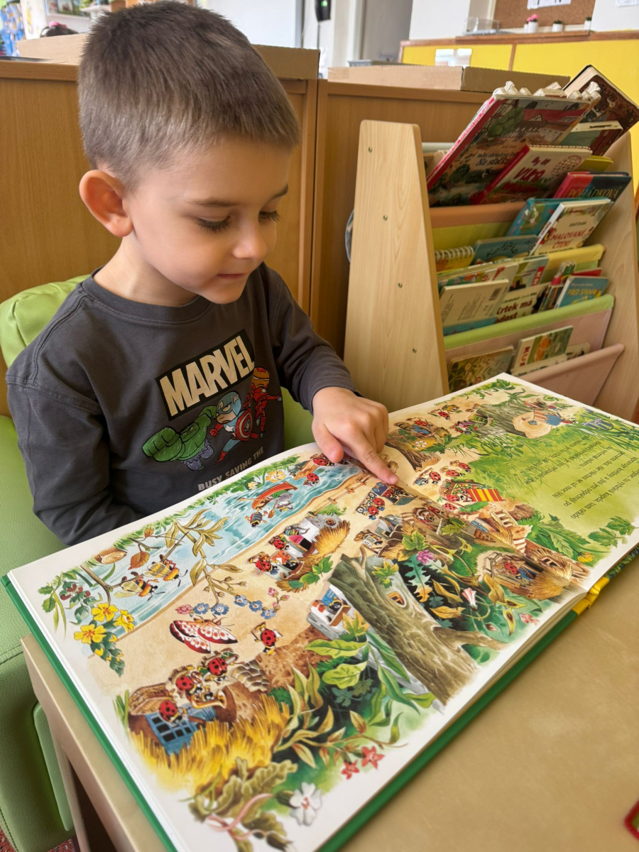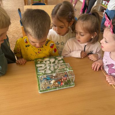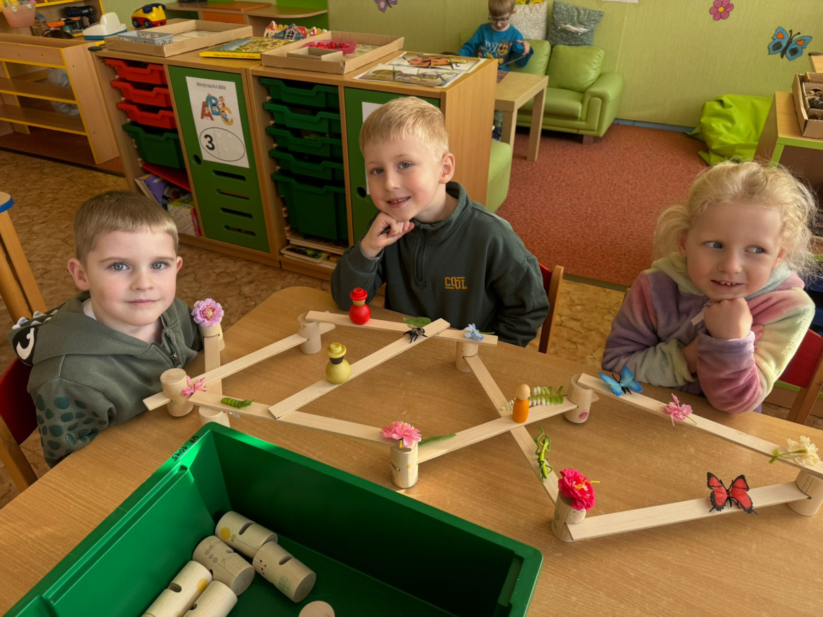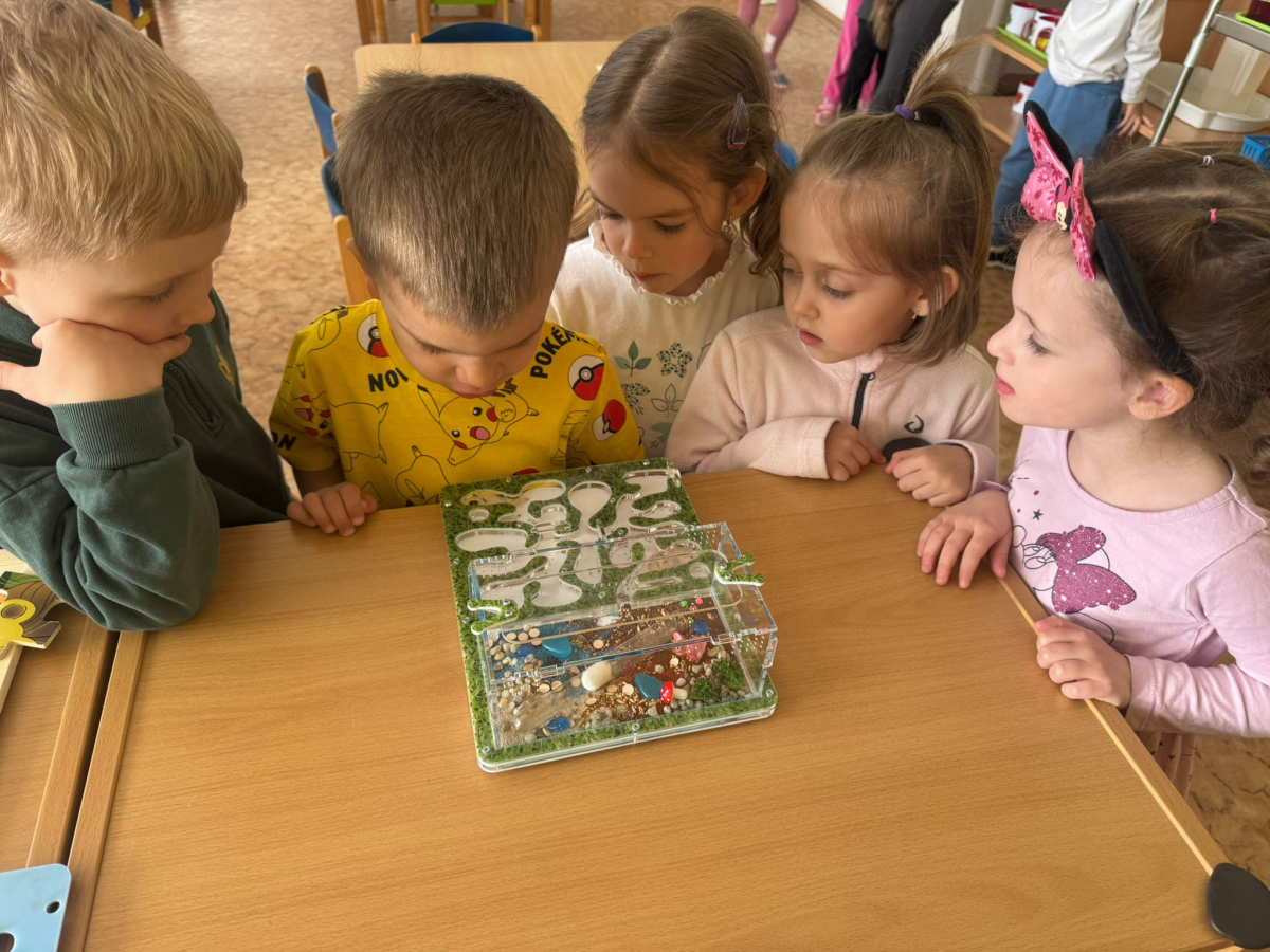 Děti si vyzkoušely smyslové hry (hledání hmyzu v rýži), procvičovaly logiku při skládání obrázků a počítaly tečky na beruškách. Rozvíjely jemnou motoriku při práci s kolíčky, bambulkami i výtvarném tvoření „Kdo se schovává v trávě“.