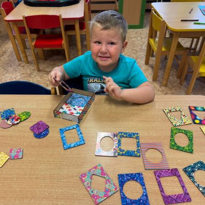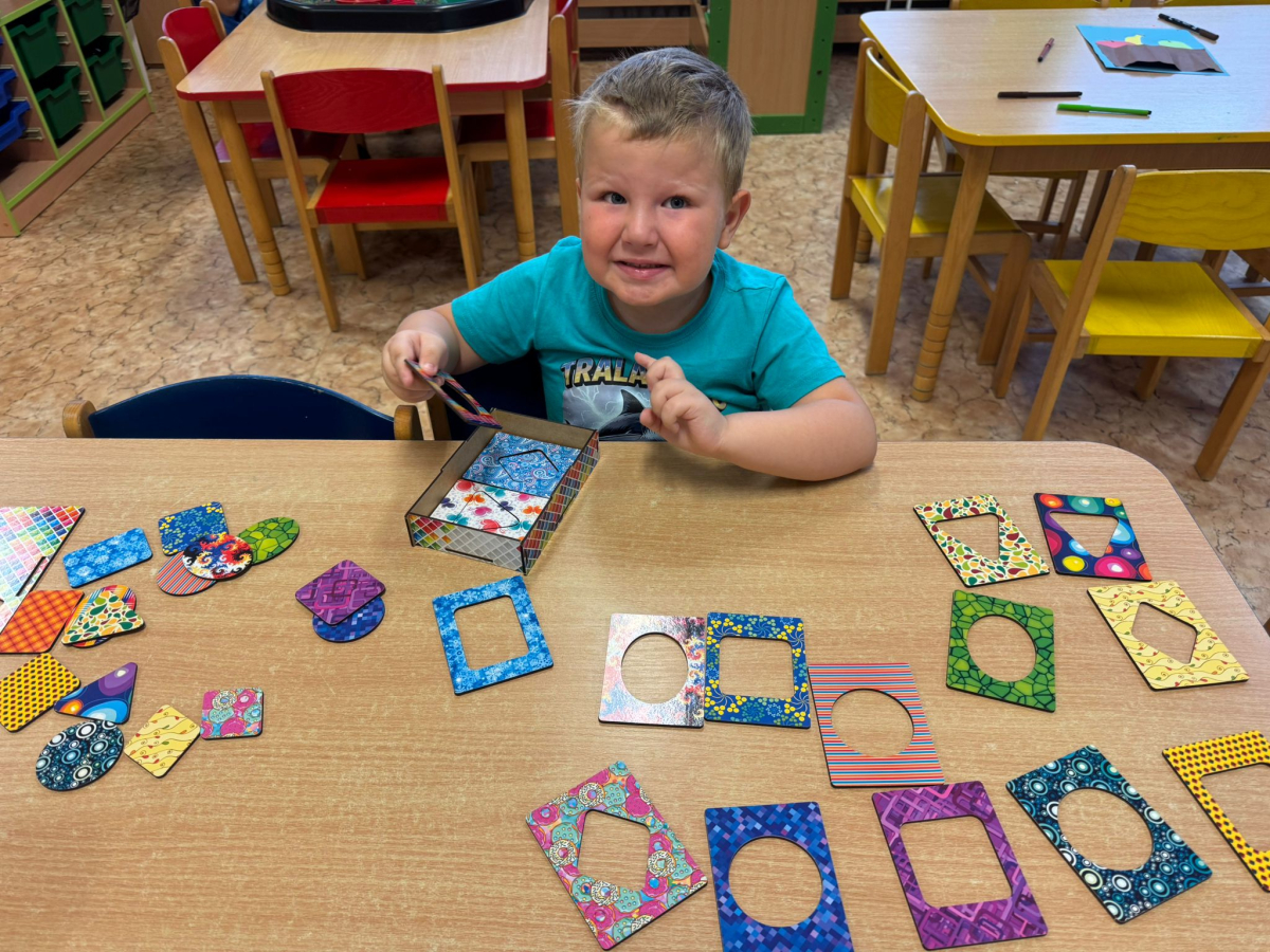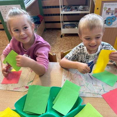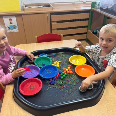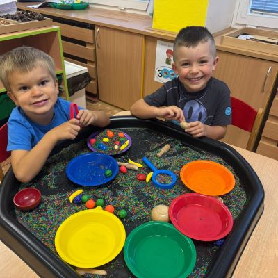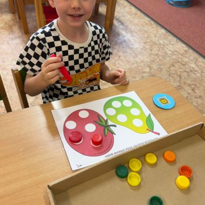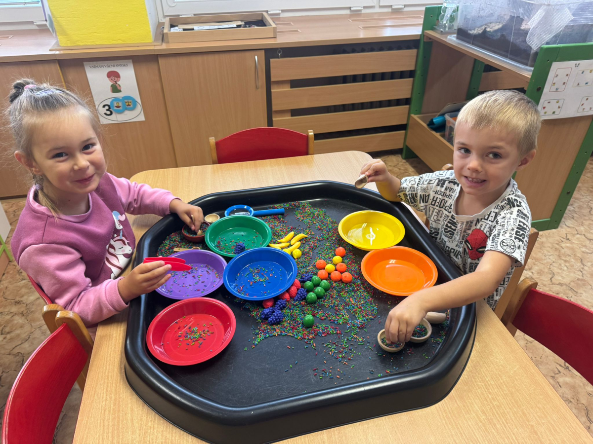 Na smyslovém tácu si děti vyzkoušely třídění barevné rýže, ovoce a zeleniny do misek, přesýpání a zkoumání lupou. V výtvarce děti stříhaly, lepily a tvořily obrázky košíček s ovocem.