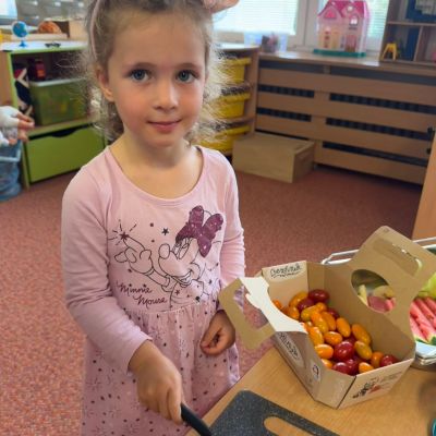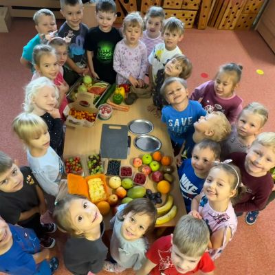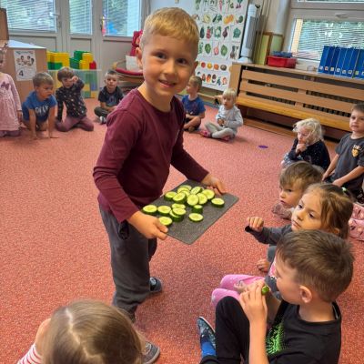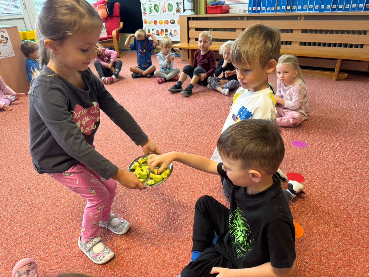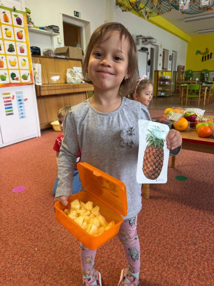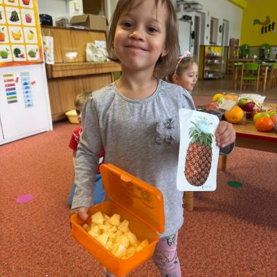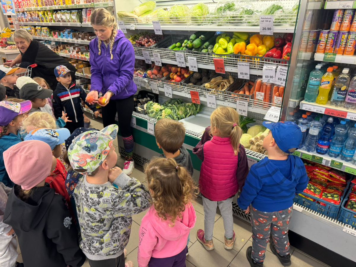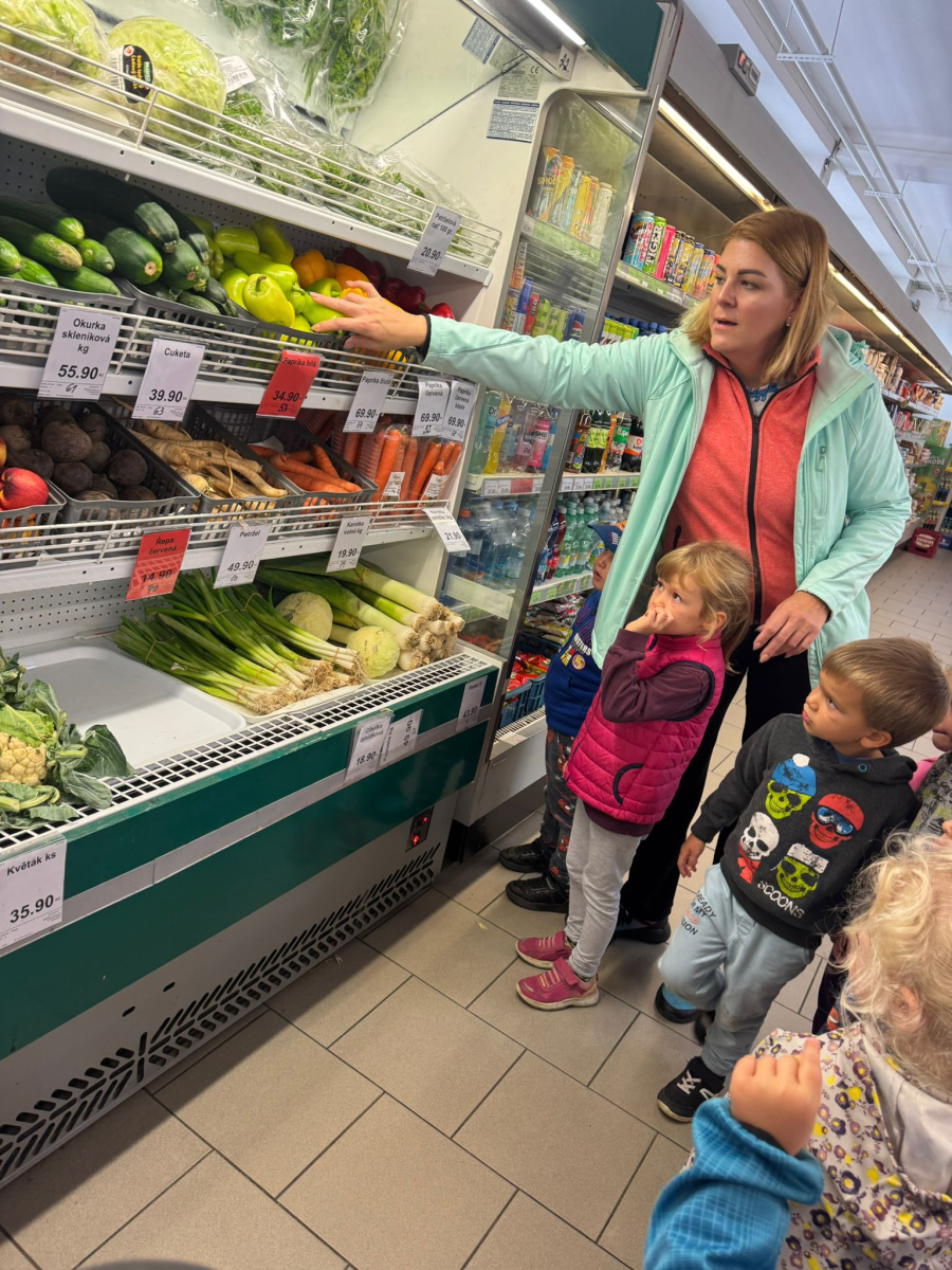 Velkým zážitkem byla návštěva obchodu Hruška, kde děti objevovaly, kolik druhů ovoce a zeleniny se dá v obchodě najít, a povídali jsme si o tom, odkud se do obchodu dostávají. Také jsme podnikli procházku do lesa a na závěr týdne proběhl náš Ovocno-zeleninový den – děti přinesly z domova různé druhy ovoce a zeleniny, společně jsme ochutnávali, poznávali chutě i vůně a zakončili jsme to multivitamínovou šťávou z odšťavňování.