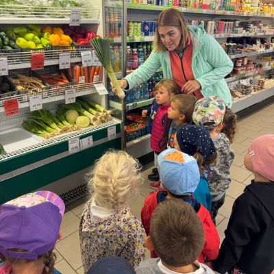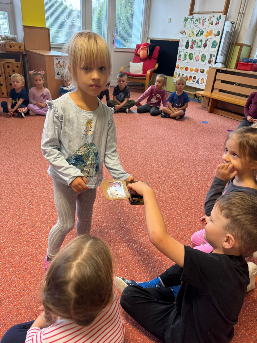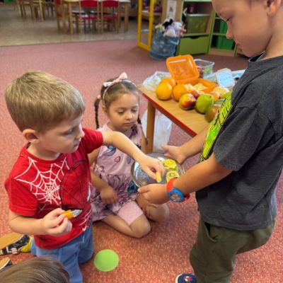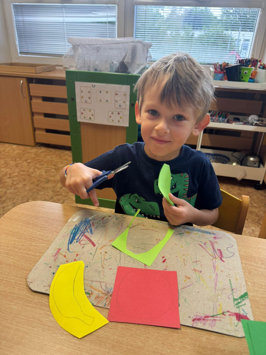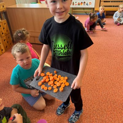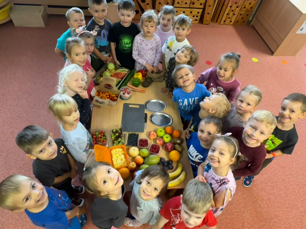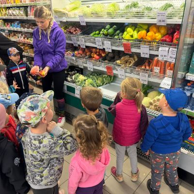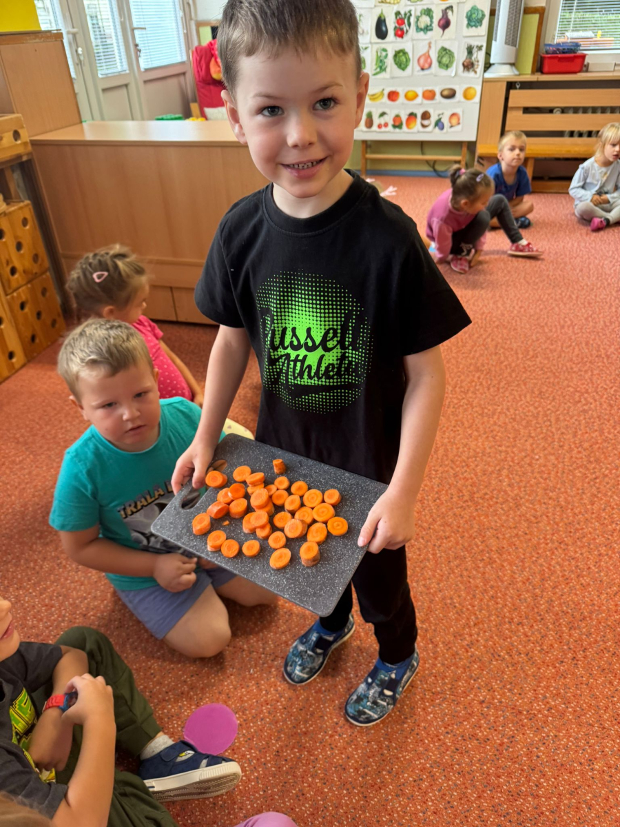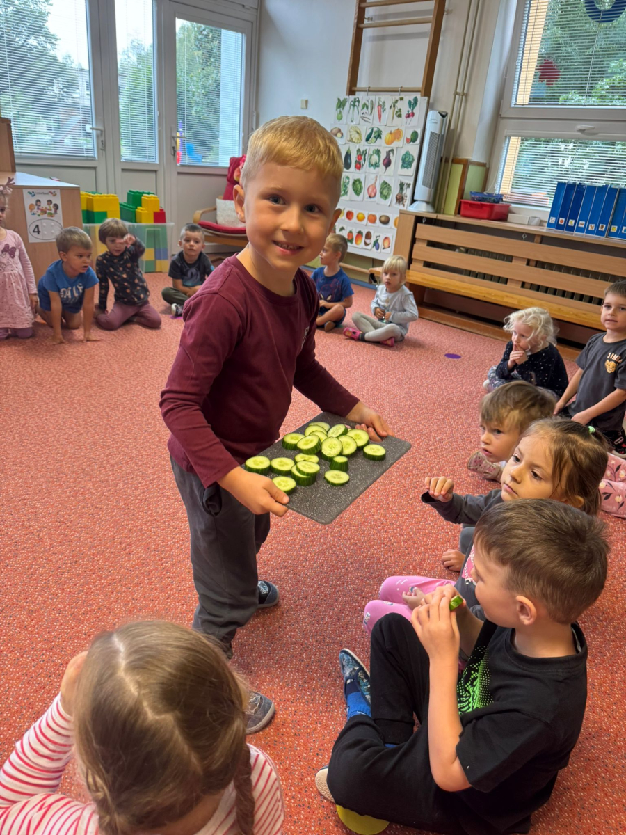 Velkým zážitkem byla návštěva obchodu Hruška, kde děti objevovaly, kolik druhů ovoce a zeleniny se dá v obchodě najít, a povídali jsme si o tom, odkud se do obchodu dostávají. Také jsme podnikli procházku do lesa a na závěr týdne proběhl náš Ovocno-zeleninový den – děti přinesly z domova různé druhy ovoce a zeleniny, společně jsme ochutnávali, poznávali chutě i vůně a zakončili jsme to multivitamínovou šťávou z odšťavňování.