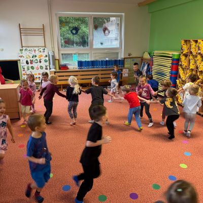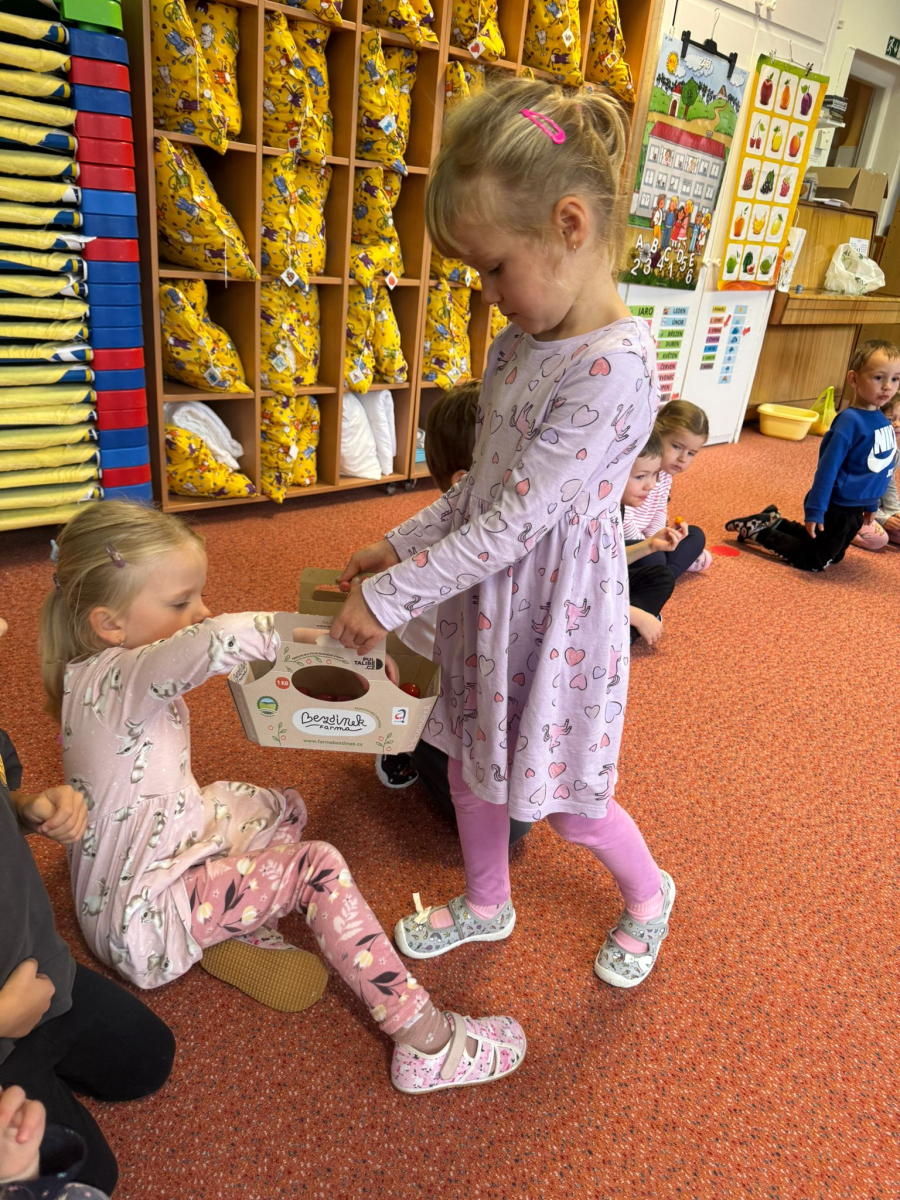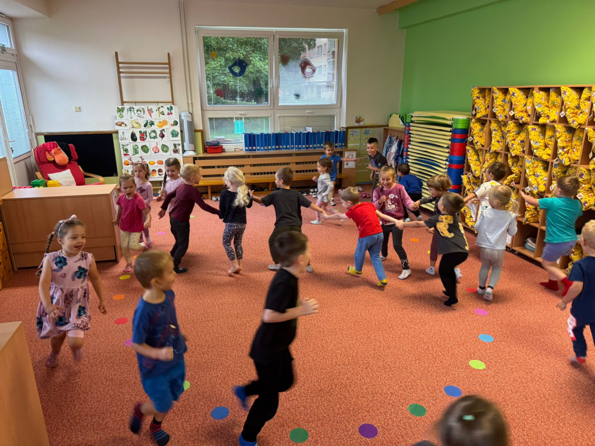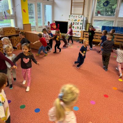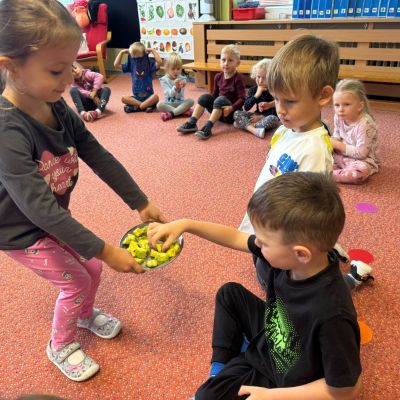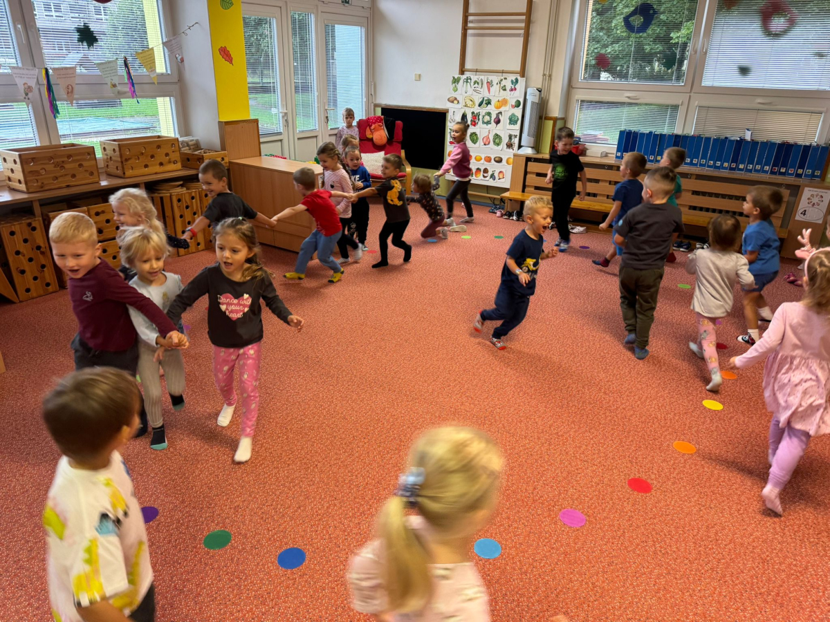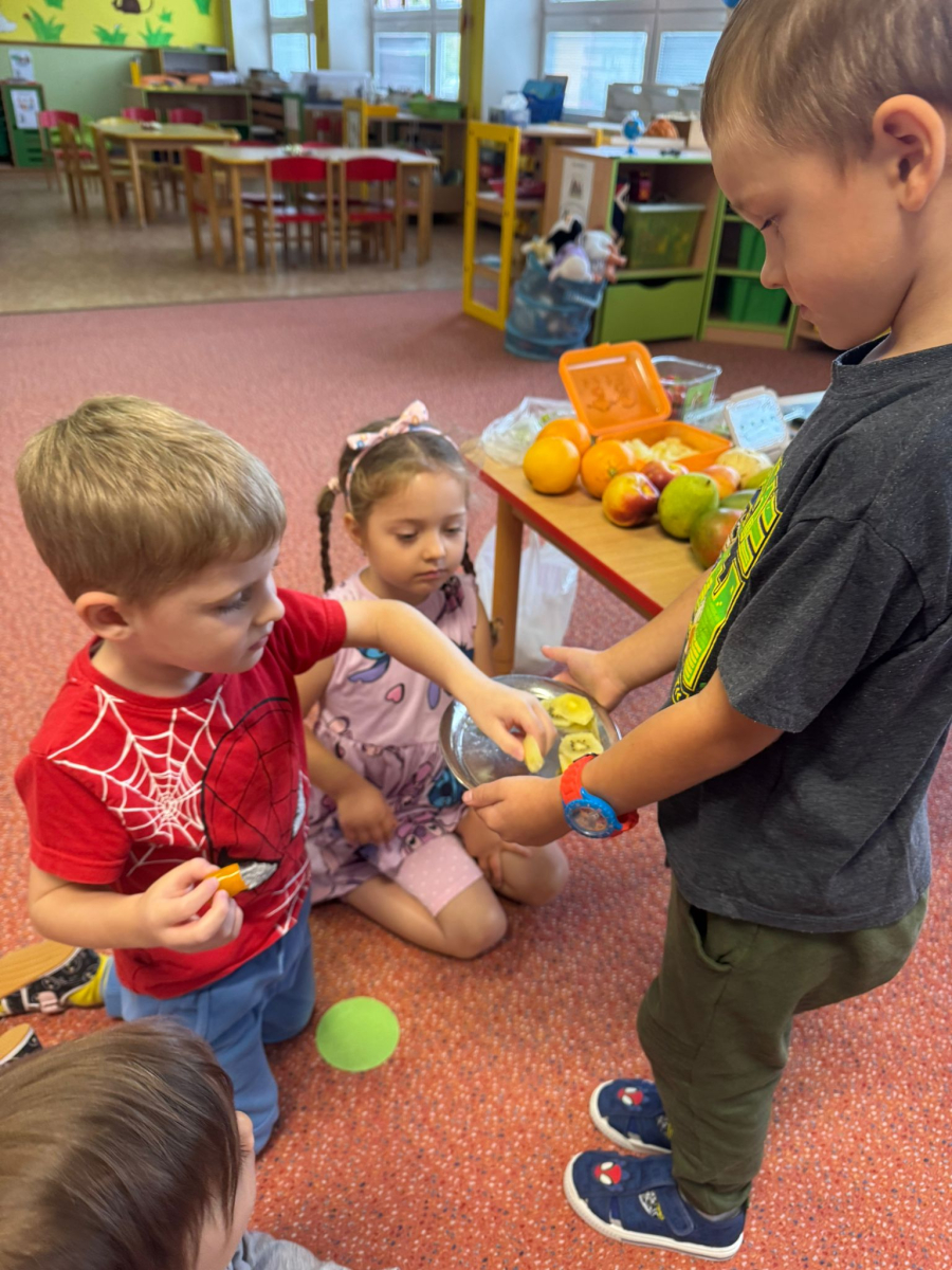 Společně jsme si zahráli různé pohybové hry, například „Na jablíčka a hrušky“, „Na zahradě“, nebo „Strom a plod“, kde si děti samy vyzkoušely být stromem i ovocem.