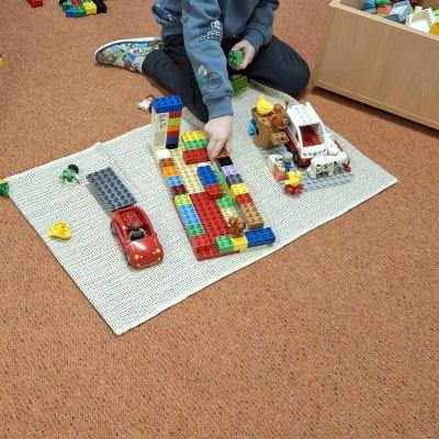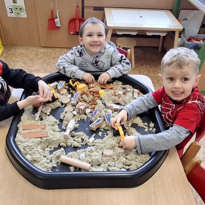 V uplynulém týdnu jsme si povídali o tématu Povolání. Navázali jsme na předchozí týden a dále si upevňovali názvy profesí, jejich náčiní i prostředí, kde pracují. Děti si vyzkoušely role stavitelů, kadeřníků, popelářů a dalších – stavěly z kostek i kinetického písku, zdolávaly překážkovou dráhu „na stavbě“, přenášely „cihly“, třídily „odpadky“ a hrály si na kadeřnický salón.