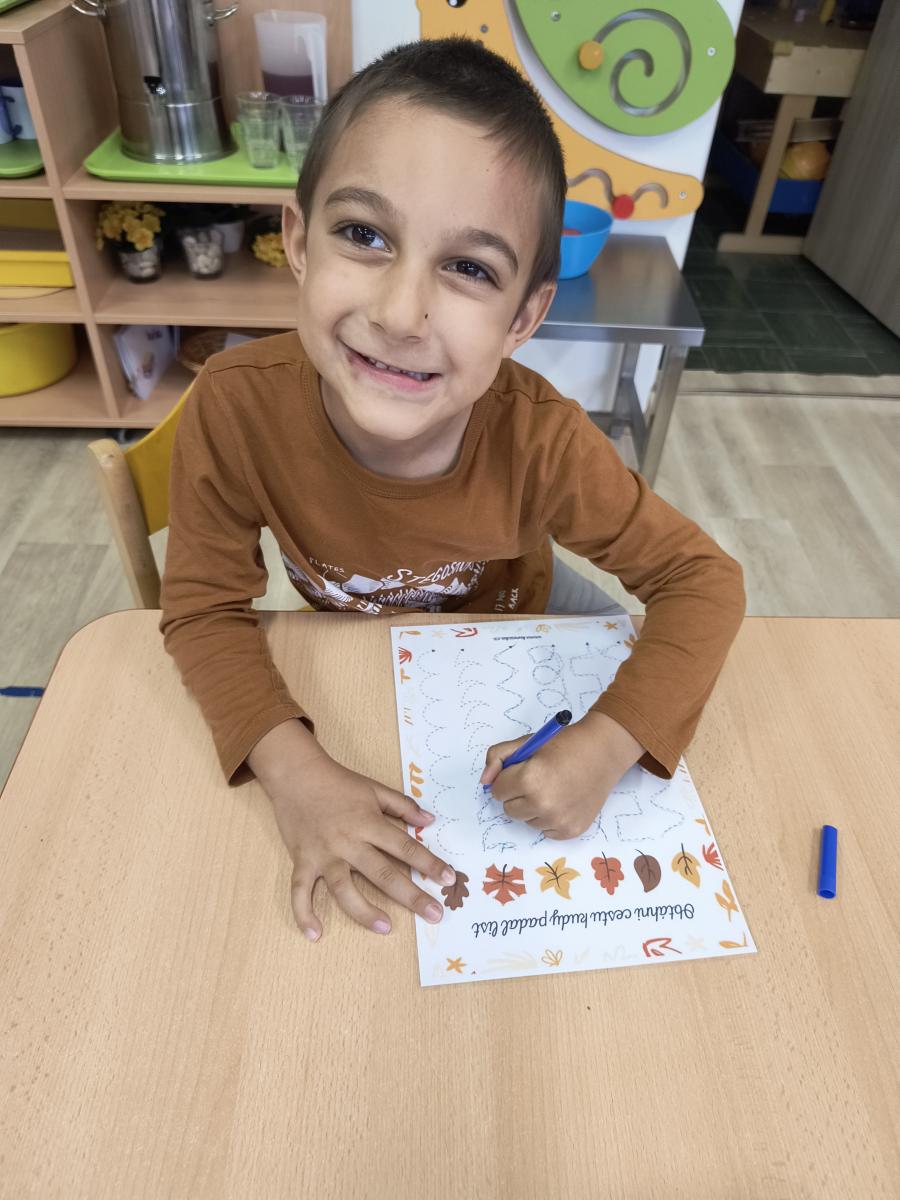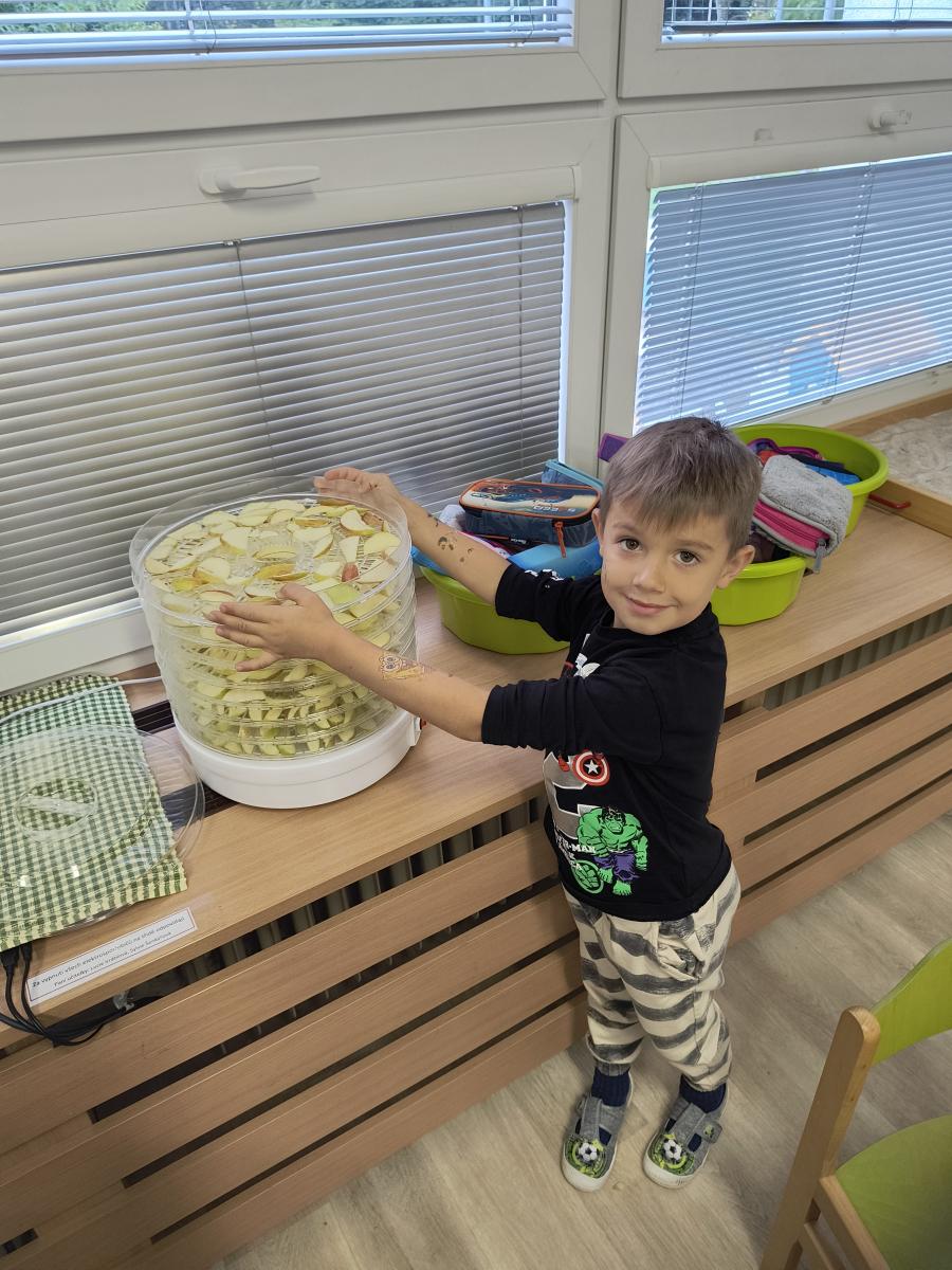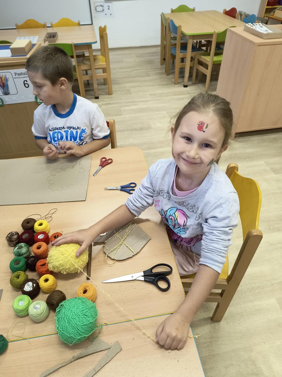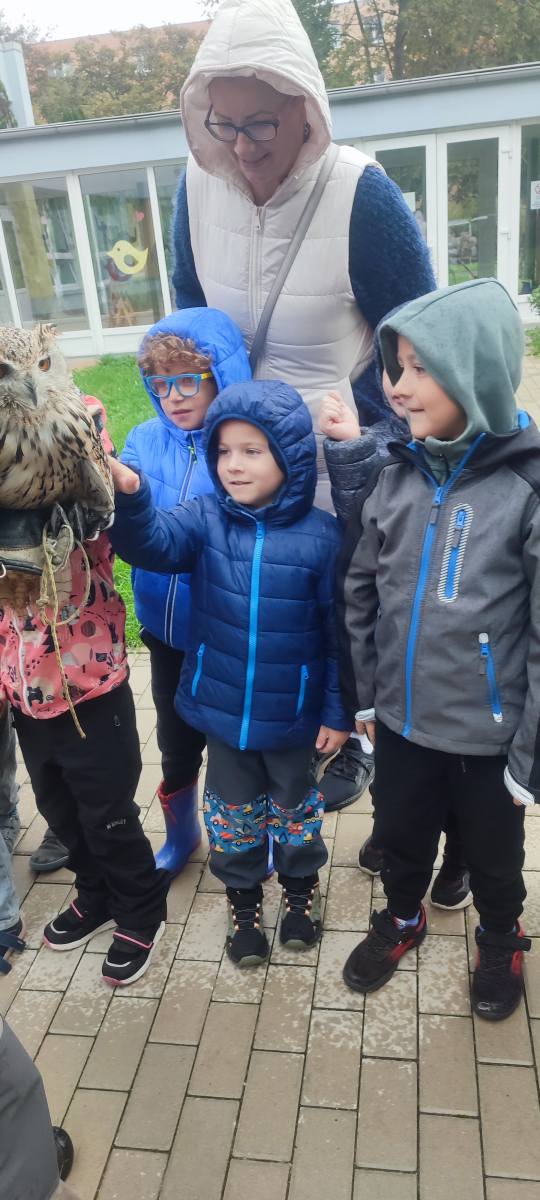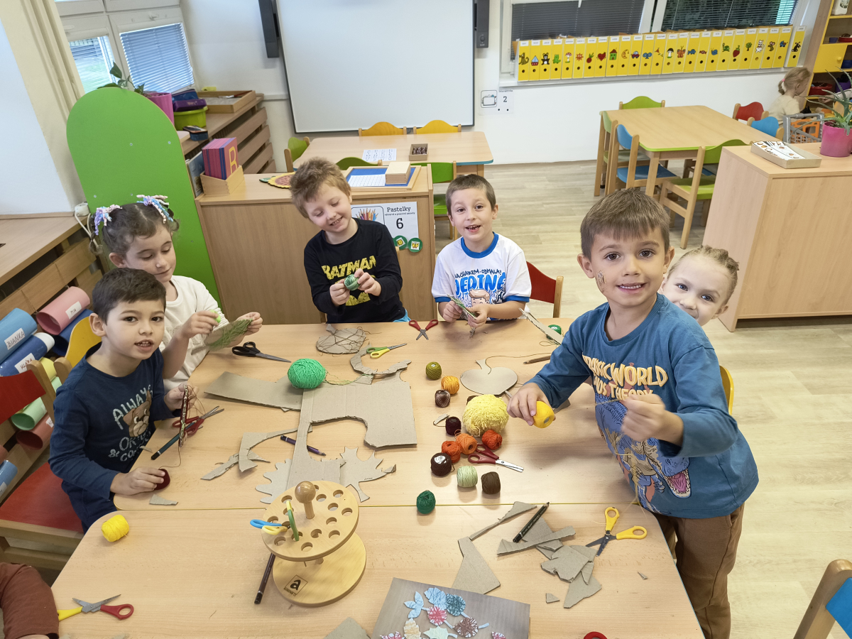 Tento týden sme pokračovali v podzimním tématu. Vyrazili jsme na výlet do ZOO, kde jsme si prohlédli zvířata a dozvěděli se nové zajímavosti. Na školní zahradě jsme měli možnost vidět přehlídku dravého ptactva – děti pozorovaly sovu, výra, puštíka, poštolku a další dravce zblízka a dozvěděly se, jak žijí. V rámci grafomotorických cvičení jsme trénovali kreslení podzimních tvarů, listů a plodů. Zahráli jsme si na detektivy při hledání stínů podzimního listí a plodů – děti si procvičily zrakovou pozornost i představivost. Při tvoření jsme obkreslovali tvary listů, vystřihovali je a omotávali bavlnkami v podzimních barvách – vznikly krásné barevné dekorace. Z nasbíraných kaštanů jsme se pustili do zábavného učení a sestavovali jsme abecedu. A protože k podzimu patří i dobroty, společně jsme sušili jablíčka na křížaly – děti si vyzkoušely, jak se dá ovoce zpracovat na zimní zásoby.