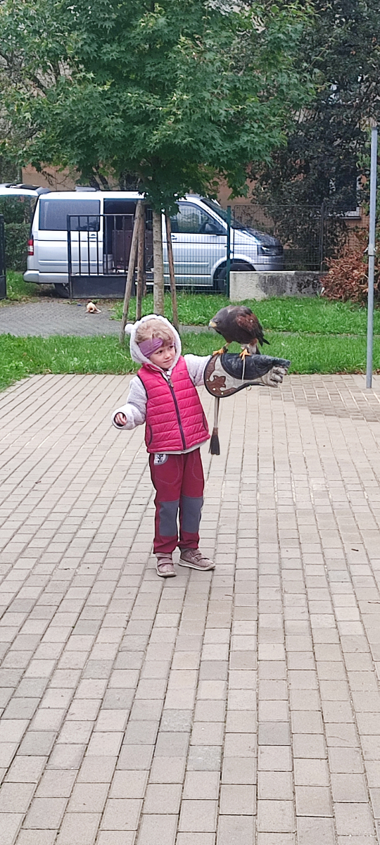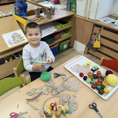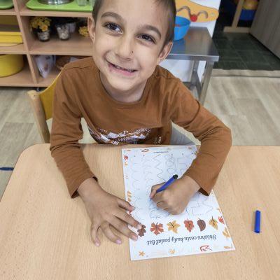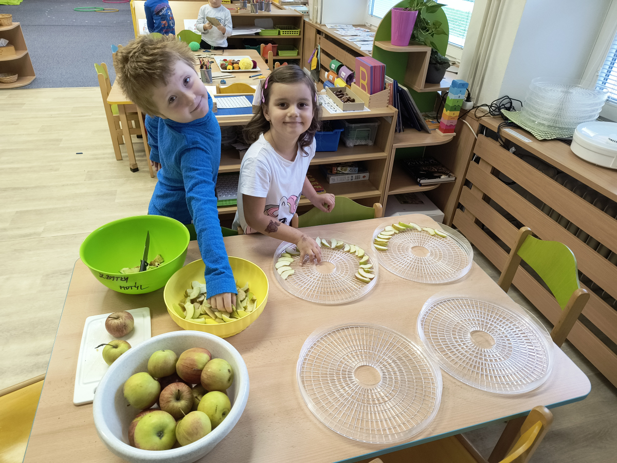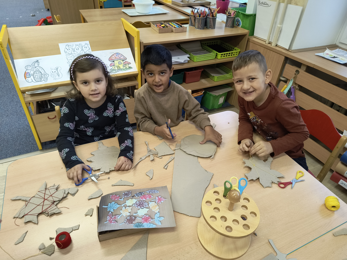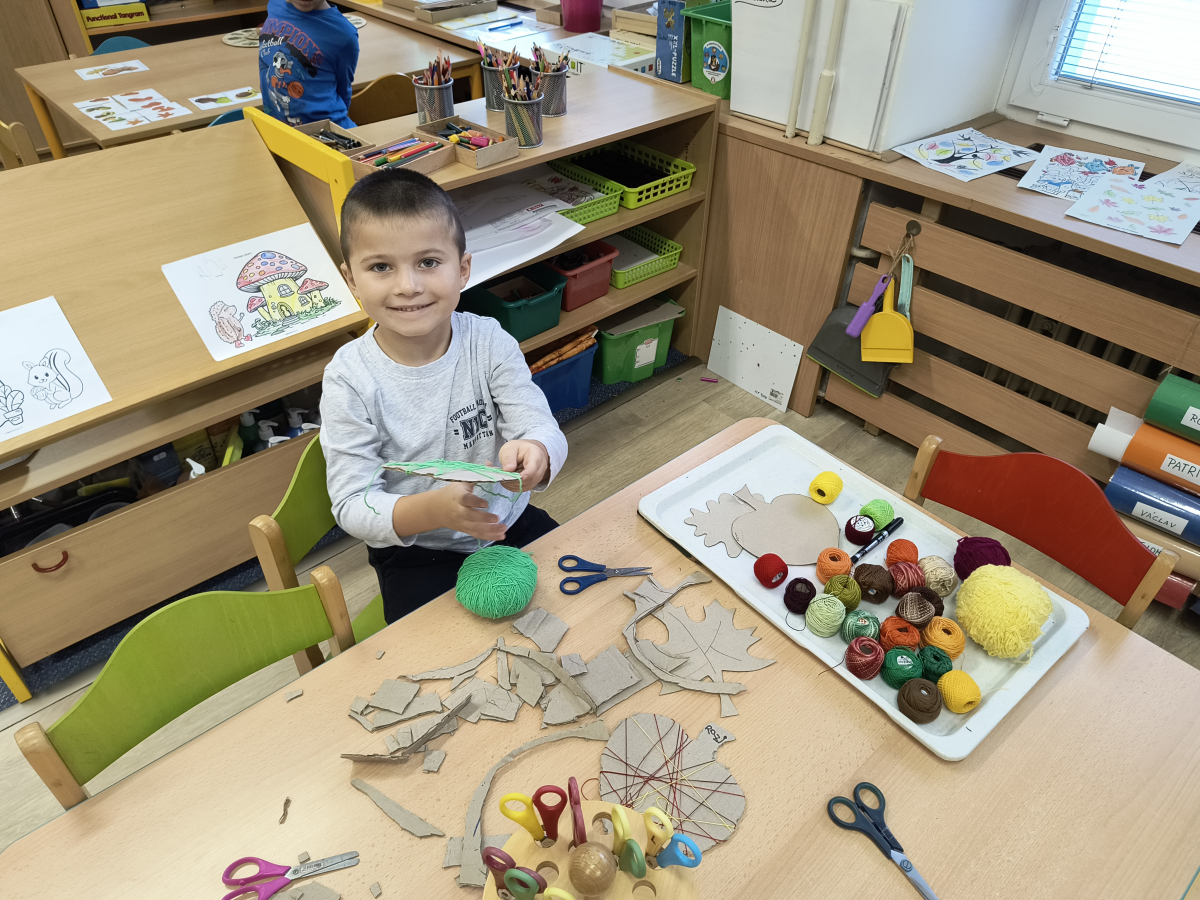 Tento týden sme pokračovali v podzimním tématu. Vyrazili jsme na výlet do ZOO, kde jsme si prohlédli zvířata a dozvěděli se nové zajímavosti. Na školní zahradě jsme měli možnost vidět přehlídku dravého ptactva – děti pozorovaly sovu, výra, puštíka, poštolku a další dravce zblízka a dozvěděly se, jak žijí. V rámci grafomotorických cvičení jsme trénovali kreslení podzimních tvarů, listů a plodů. Zahráli jsme si na detektivy při hledání stínů podzimního listí a plodů – děti si procvičily zrakovou pozornost i představivost. Při tvoření jsme obkreslovali tvary listů, vystřihovali je a omotávali bavlnkami v podzimních barvách – vznikly krásné barevné dekorace. Z nasbíraných kaštanů jsme se pustili do zábavného učení a sestavovali jsme abecedu. A protože k podzimu patří i dobroty, společně jsme sušili jablíčka na křížaly – děti si vyzkoušely, jak se dá ovoce zpracovat na zimní zásoby.