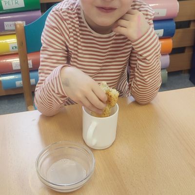 V tomto týdnu jsme se s dětmi vydali do světa, kde je všechno trochu jinak – do světa naruby. Hned první den nás čekala popletená svačinka – rohlík byl připravený v hrníčku a pití jsme měli v misce. I pokyny zněly opačně než obvykle – „křič“ místo „buď potichu“ nebo jiné obrácené instrukce. Děti reagovaly naprosto skvěle, až jsme si s paní učitelkami říkaly, jestli to takhle nenecháme nastálo! ???? To byla teprve legrace a velké překvapení.