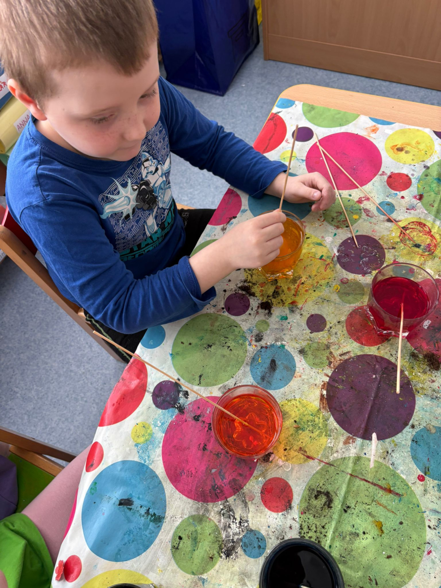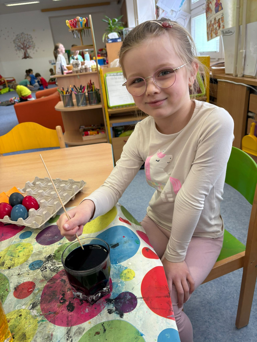 Ve výtvarných činnostech děti tvořily velikonoční motivy – sázely osení, barvily vajíčka a vyráběly jarní dekorace. Pomocí různých technik, barev a materiálů rozvíjely svou fantazii, tvořivost, jemnou motoriku i schopnost soustředění.