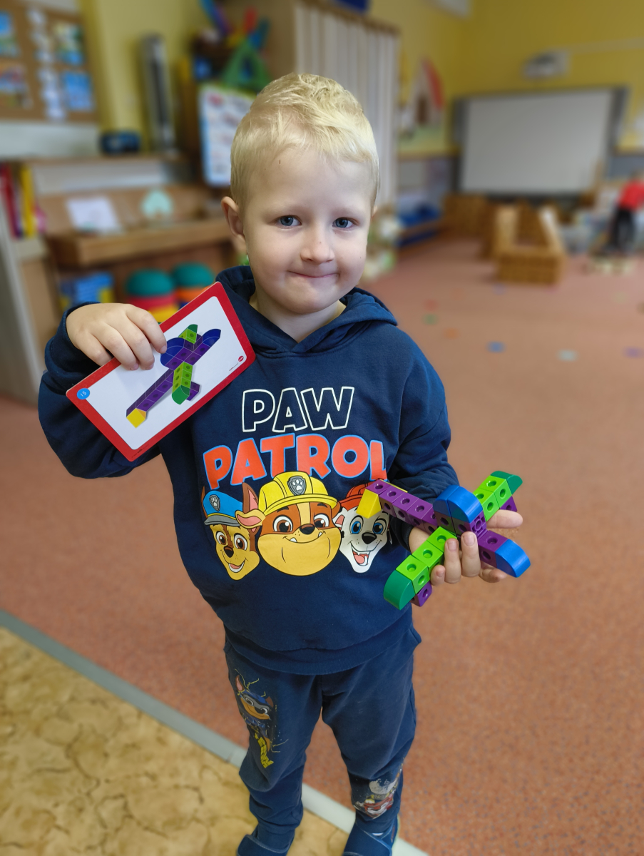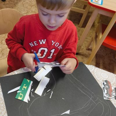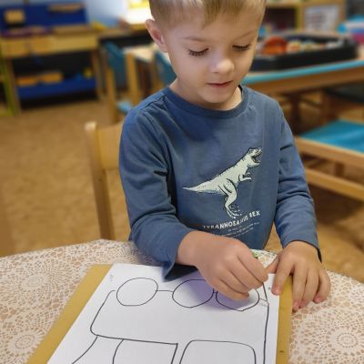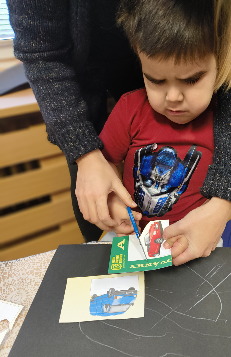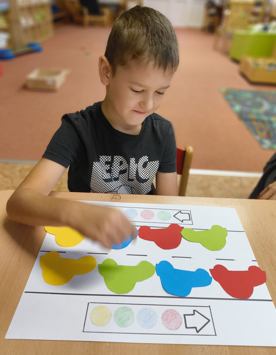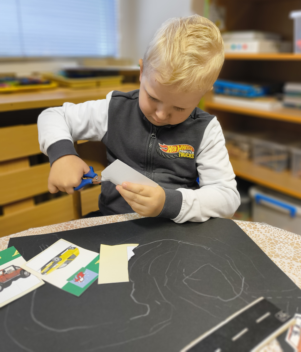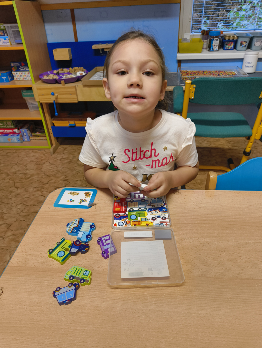 Pokračovali jsme v tématu dopravní prostředky, zaměřili jsme se na rozhovory, popis obrázku ve větách, užívání předložek, množného čísla. Zkusili jsme si zapamatovat 3 slova, krátký text a znovu ho převyprávět. Vypichovali jsme, kreslili jsme cestu, vystřihovali jsme auta. Kreslili jsme jedním tahem.Určovali jsme kam patří dopravní prostředky. Skládali jsme puzzle, garáže, a dopravní prostředky dle návodu z různých stavebnic. Cvičili jsme levopravou orientaci a barvy. Venku jsme se byli dívat na točnu tramvají v lese. Pozorovali, určovali a počítali jsme dopravní prostředky na velké cestě.