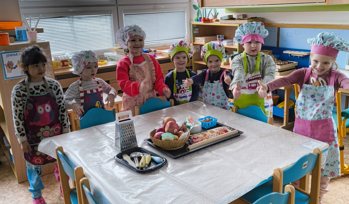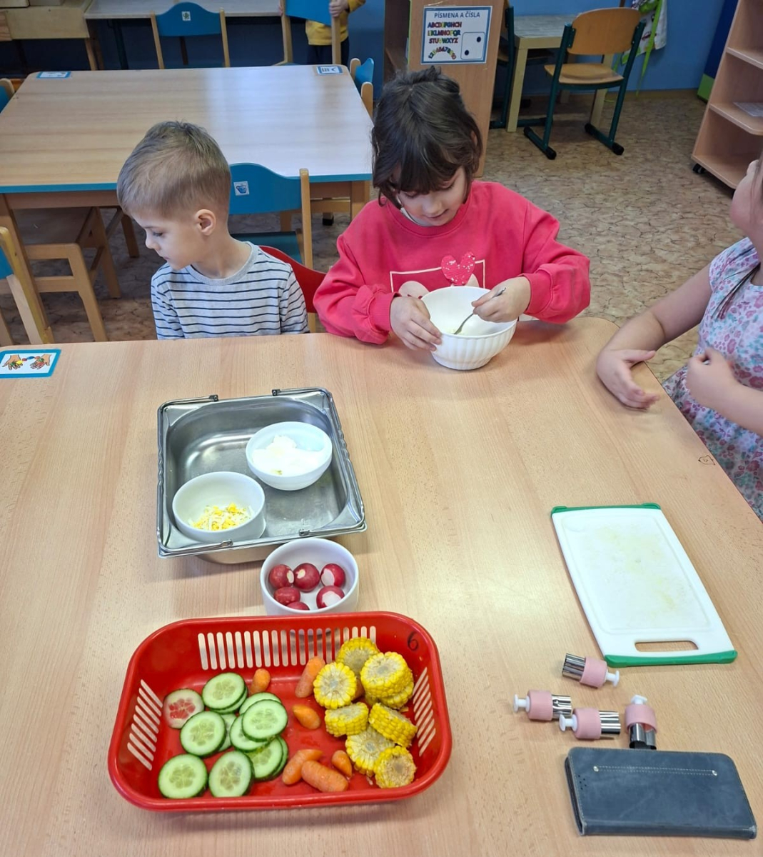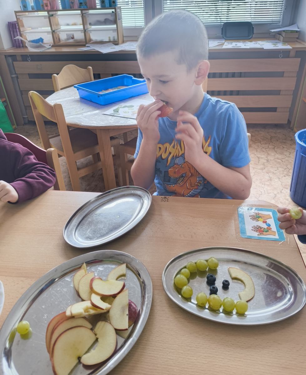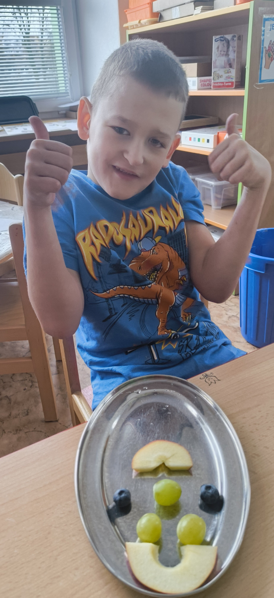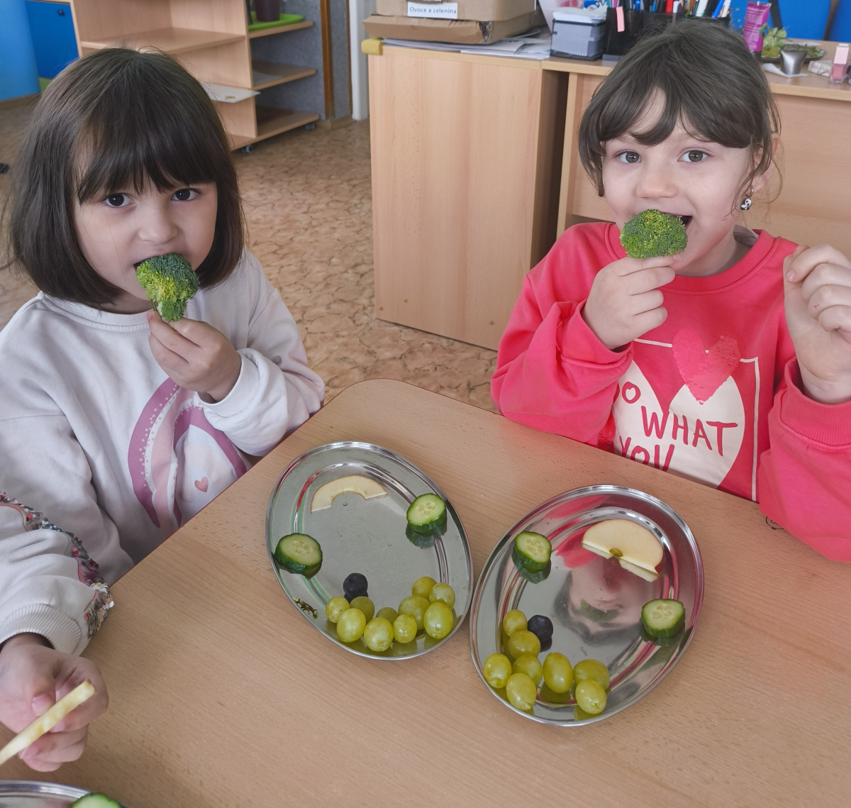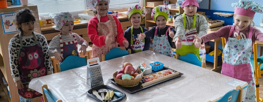 Každý den jsme si vyrobili něco dobrého. Vykrajovali jsme zeleninu pomocí vykrajovátek, sami jsme si udělali pomazánku.Vytvořili jsme si obličej pomocí ovoce a zeleniny. namíchali jsme si pruhovanou limonádu z ovocných sirupů a džusu. Upekli jsme si jablečné taštičky a štrůdl. Nejvíce nám chutnala zmrzlina, kterou jsme si vyrobili z jahod a pak jsme si vyrobili zmrzlinový pohár se šlehačkou, ovocem a posypem.