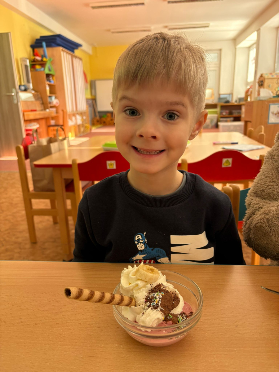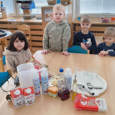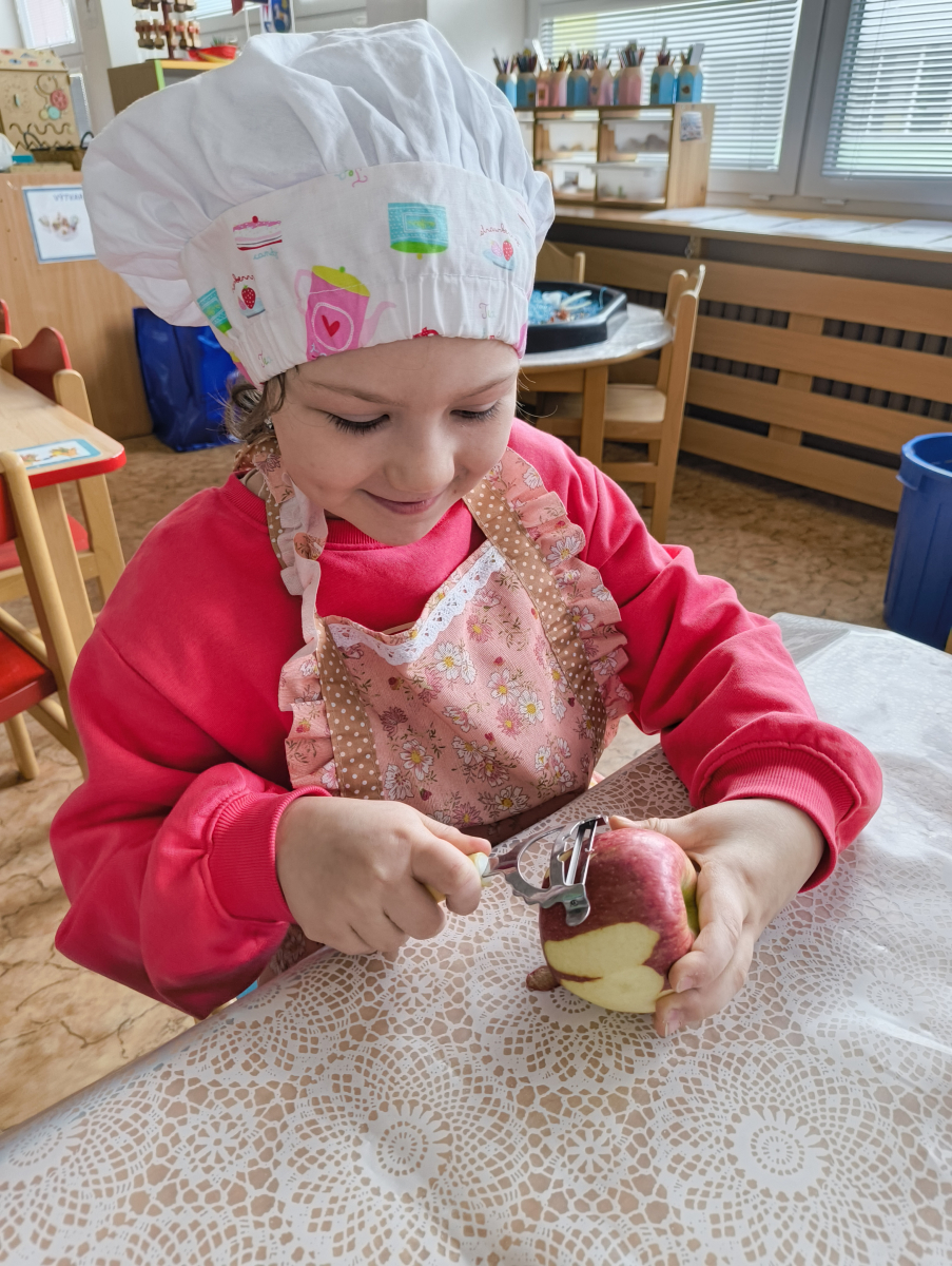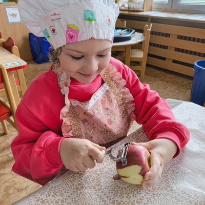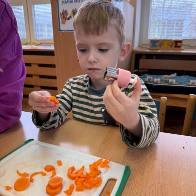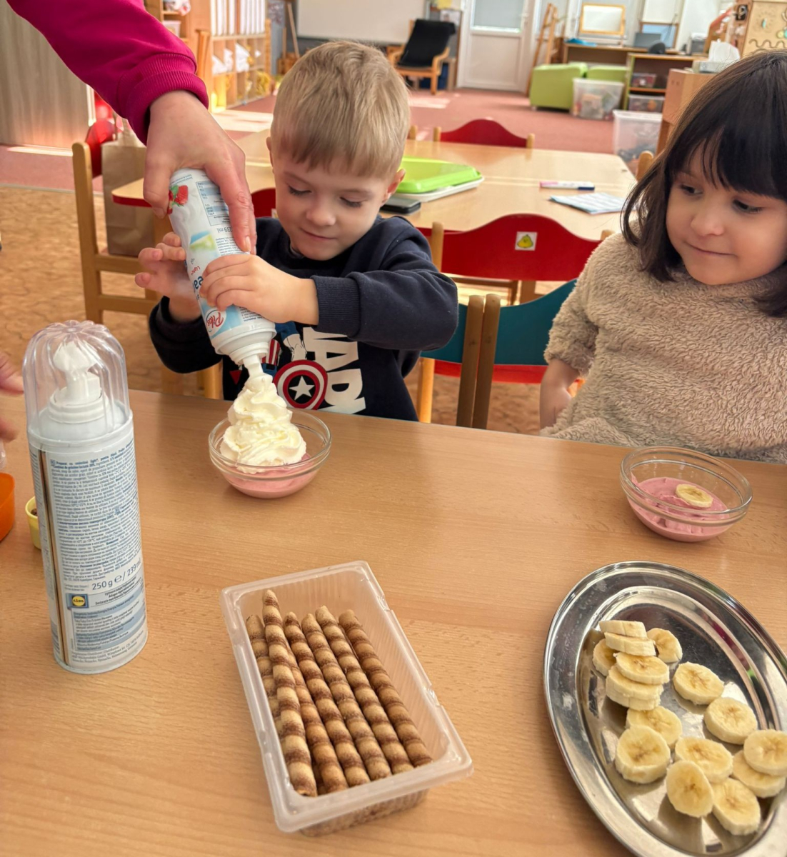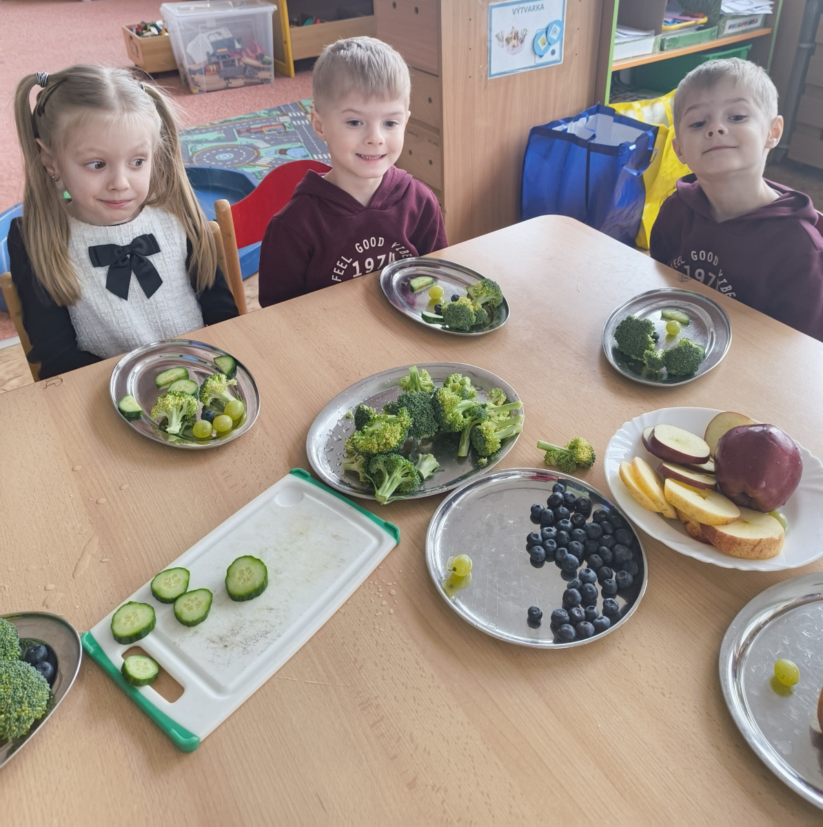 Každý den jsme si vyrobili něco dobrého. Vykrajovali jsme zeleninu pomocí vykrajovátek, sami jsme si udělali pomazánku.Vytvořili jsme si obličej pomocí ovoce a zeleniny. namíchali jsme si pruhovanou limonádu z ovocných sirupů a džusu. Upekli jsme si jablečné taštičky a štrůdl. Nejvíce nám chutnala zmrzlina, kterou jsme si vyrobili z jahod a pak jsme si vyrobili zmrzlinový pohár se šlehačkou, ovocem a posypem.