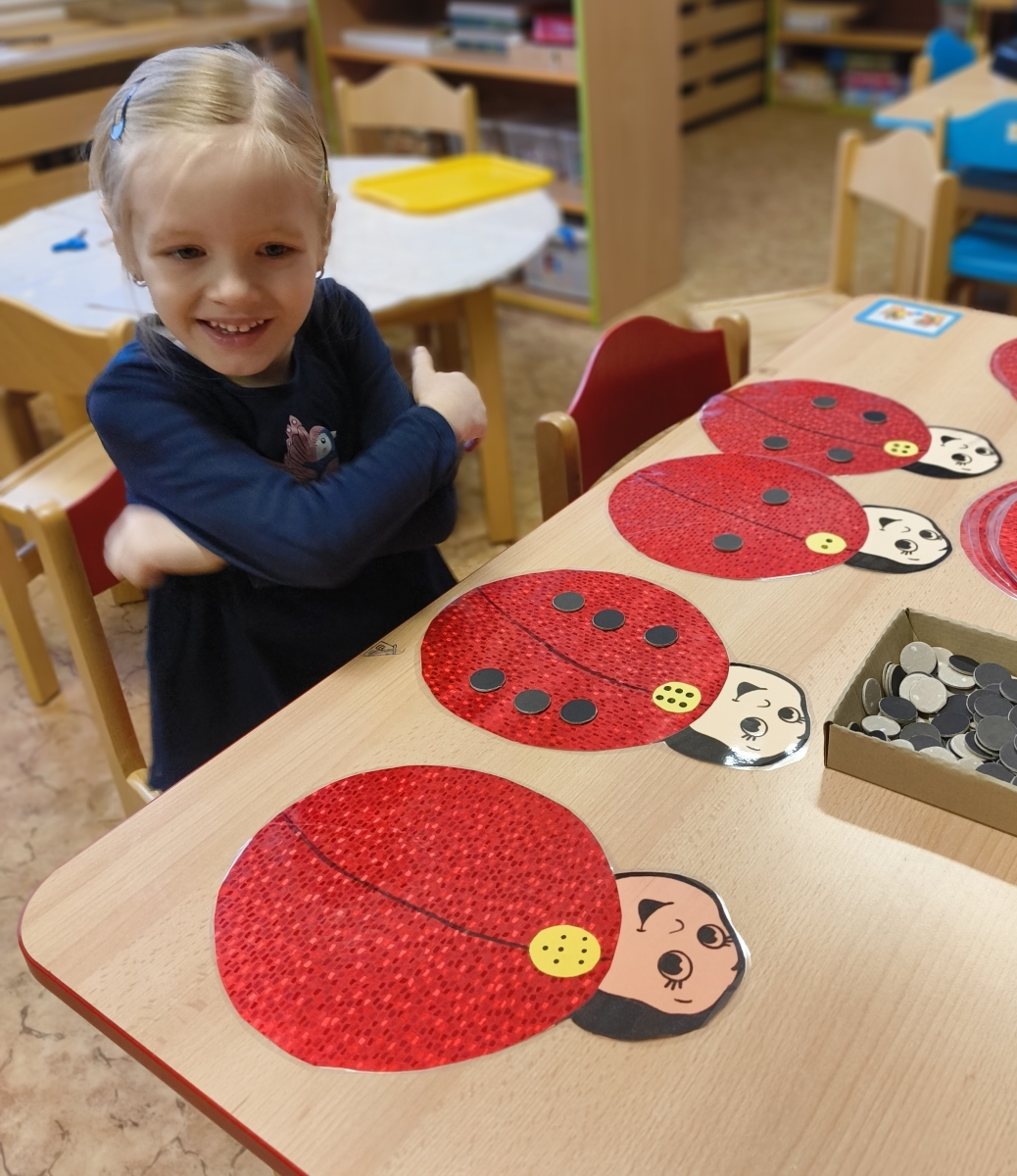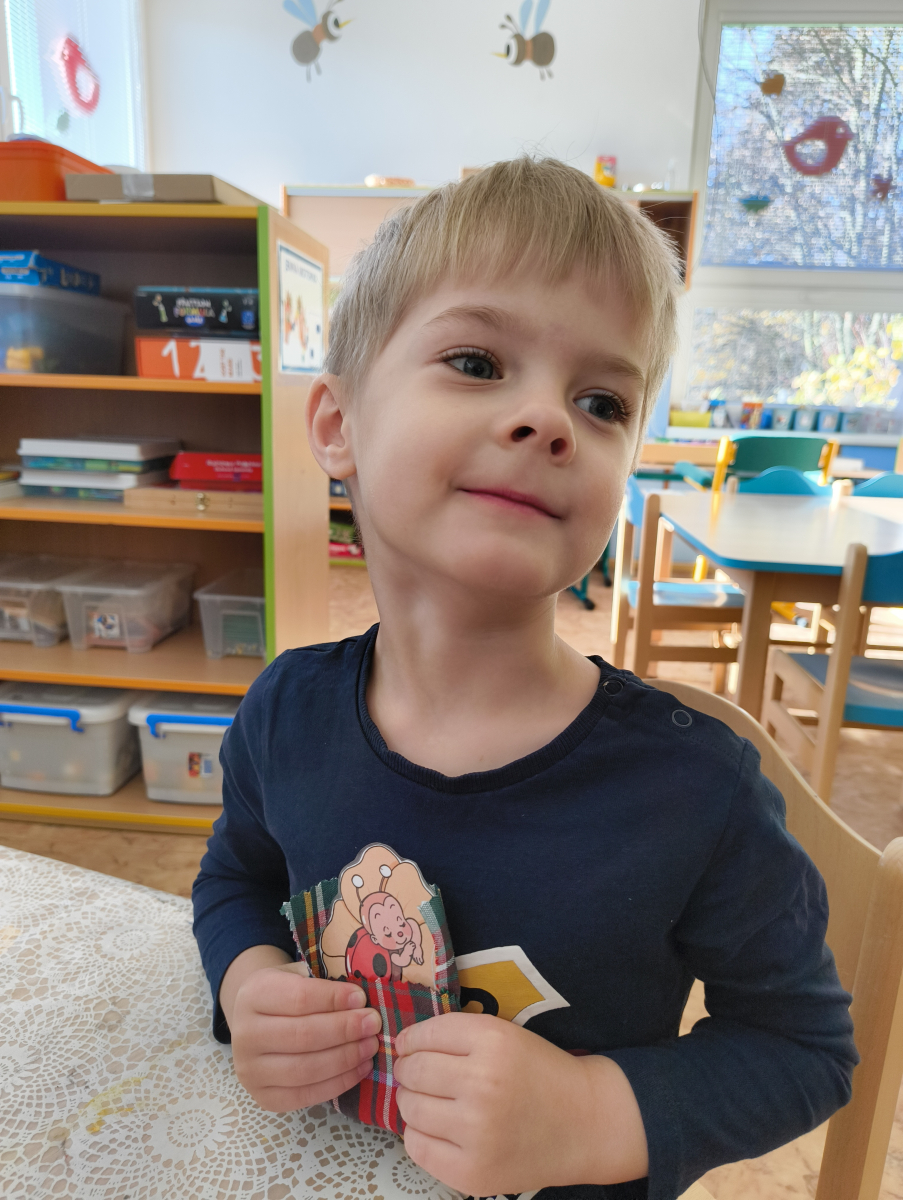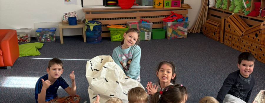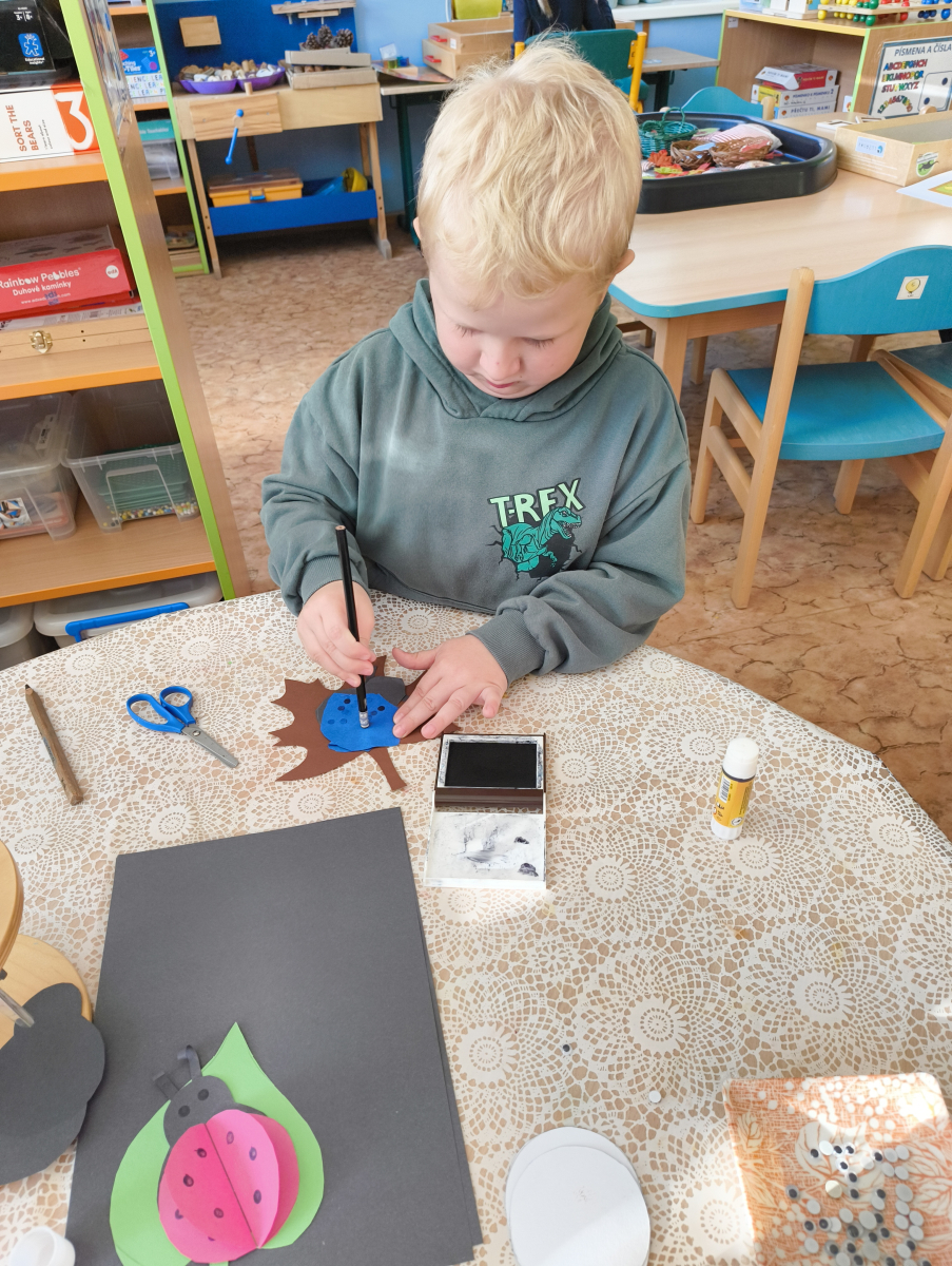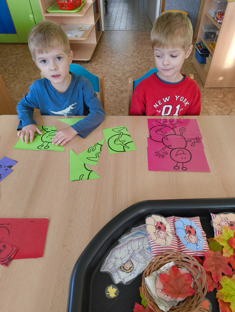 Povídlai jsme si o broučcích, proč jdou na podzim spát. Cvičili jsme s lucerničkami, hráli jsme si na boučky. Přenášeli jsme je do postýlek přes různé překážky. Cvičili jsme dětskou jógu. Šili jsme peřinku pro broučky, stříhali jsme látku.Vyrobili jsme lucerničky na broučkiádu. Kreslili jsme broučka podle předlohy. Foukali jsme do listí, hledali jsme broučky, třídili jsme je podle velikosti, barev, tvarů. Doplńovali jsme logickou řadu, hledali jsme odlišného broučka v řadě.Hledali jsme broučky v pískovničce. Učili jsme se písničku o maravenečkovi. Programovali jsme robotikcou včelu.Slavili jsme narozeniny kamaráda Vojtíška.