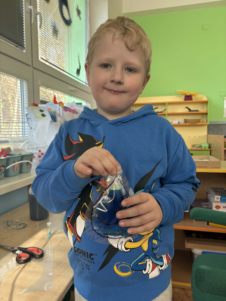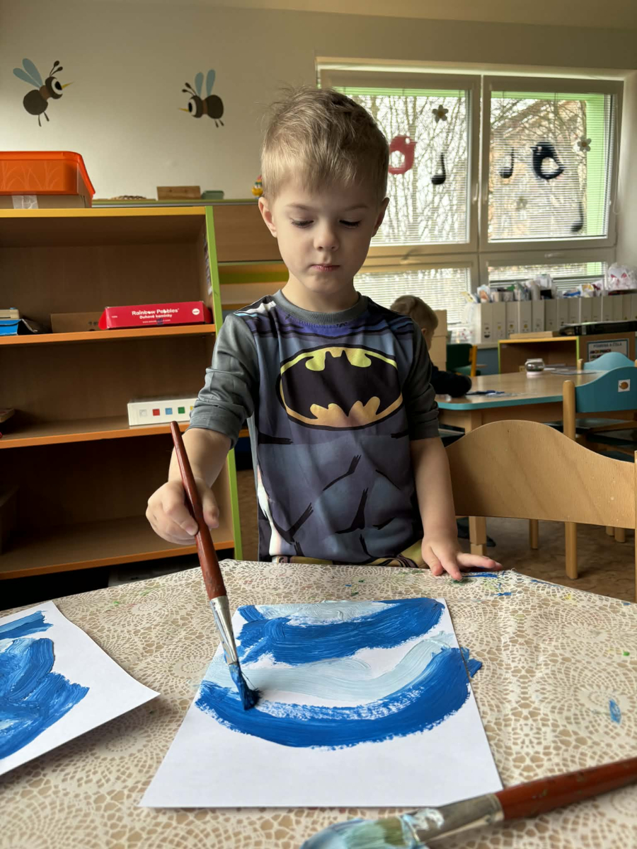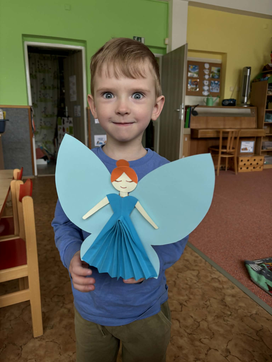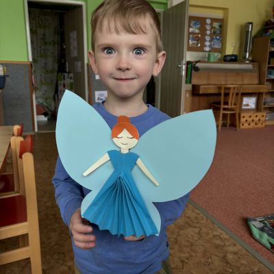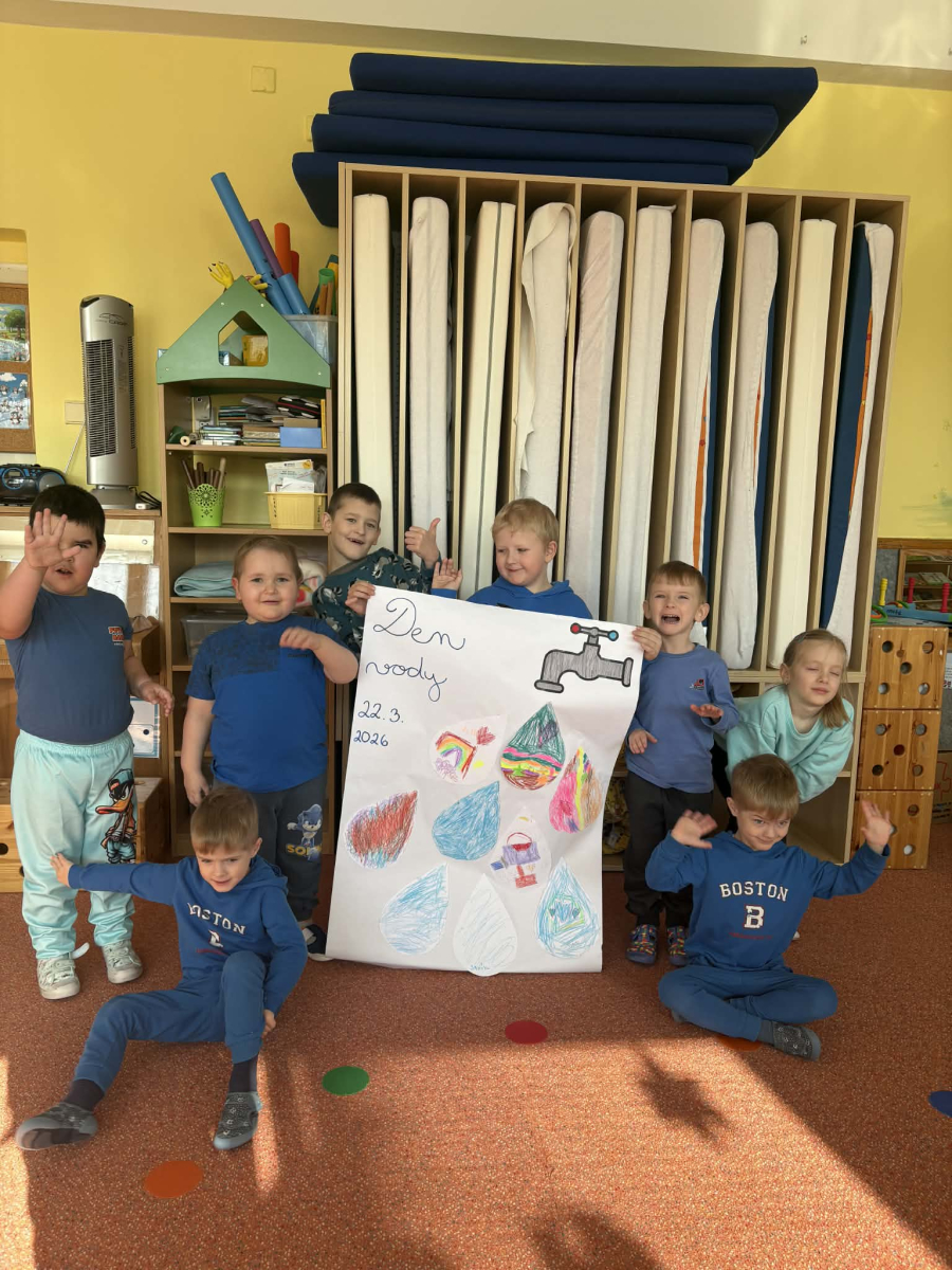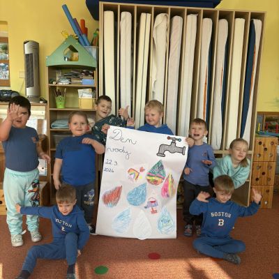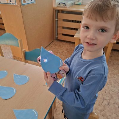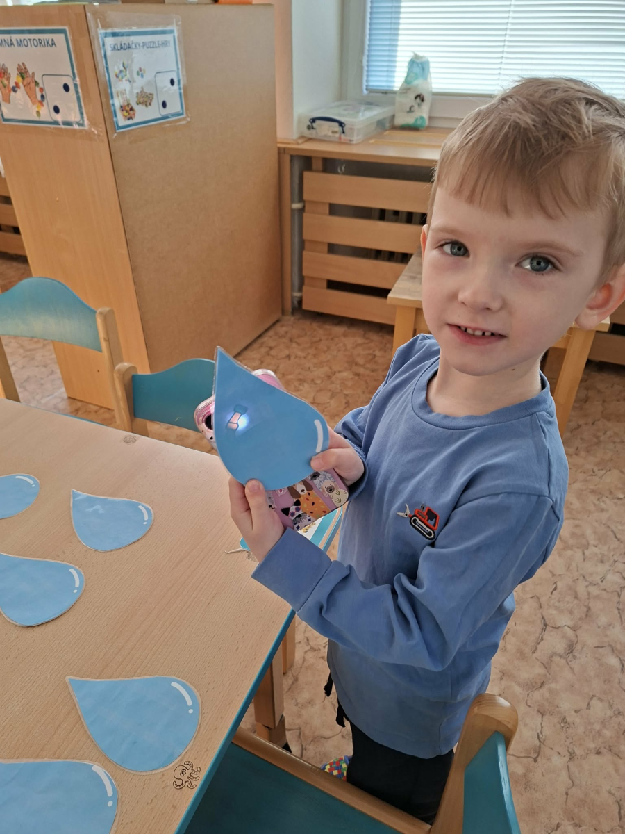 Minulý týden jsme zakončili výletem na Stezku vody v Bělském lese, na který jsme plynule navázali tématem o kapičce. Ta nás provedla týdnem plným aktivit zaměřených na koloběh vody. Společně jsme si stanovili pravidla pro šetření vodou, připomněli si, kde všude ji najdeme a k čemu všemu ji potřebujeme. Nechybělo ani zážitkové učení, vyzkoušeli jsme si nejrůznější pokusy i zábavné výtvarné techniky. Rozvíjeli jsme rytmus, motoriku i kreativitu a uspořádali soutěž o nejhezčí vodní vílu. Julinka a Saša přinesli nádherné postavičky, za které je čeká zasloužená odměna. Celý týden jsme pak zakončili Modrým dnem, kdy se naše třída proměnila v moře kapiček.
