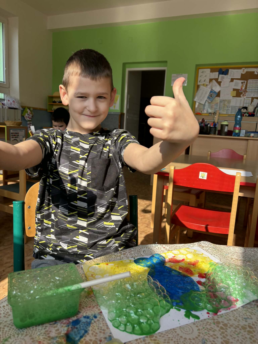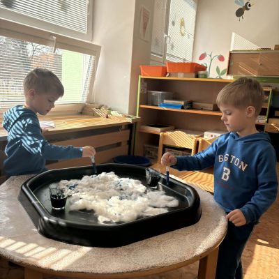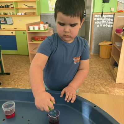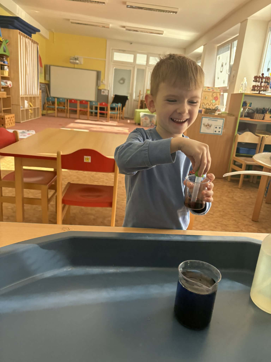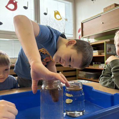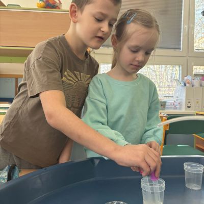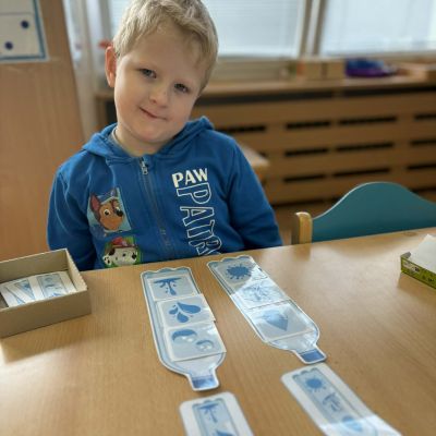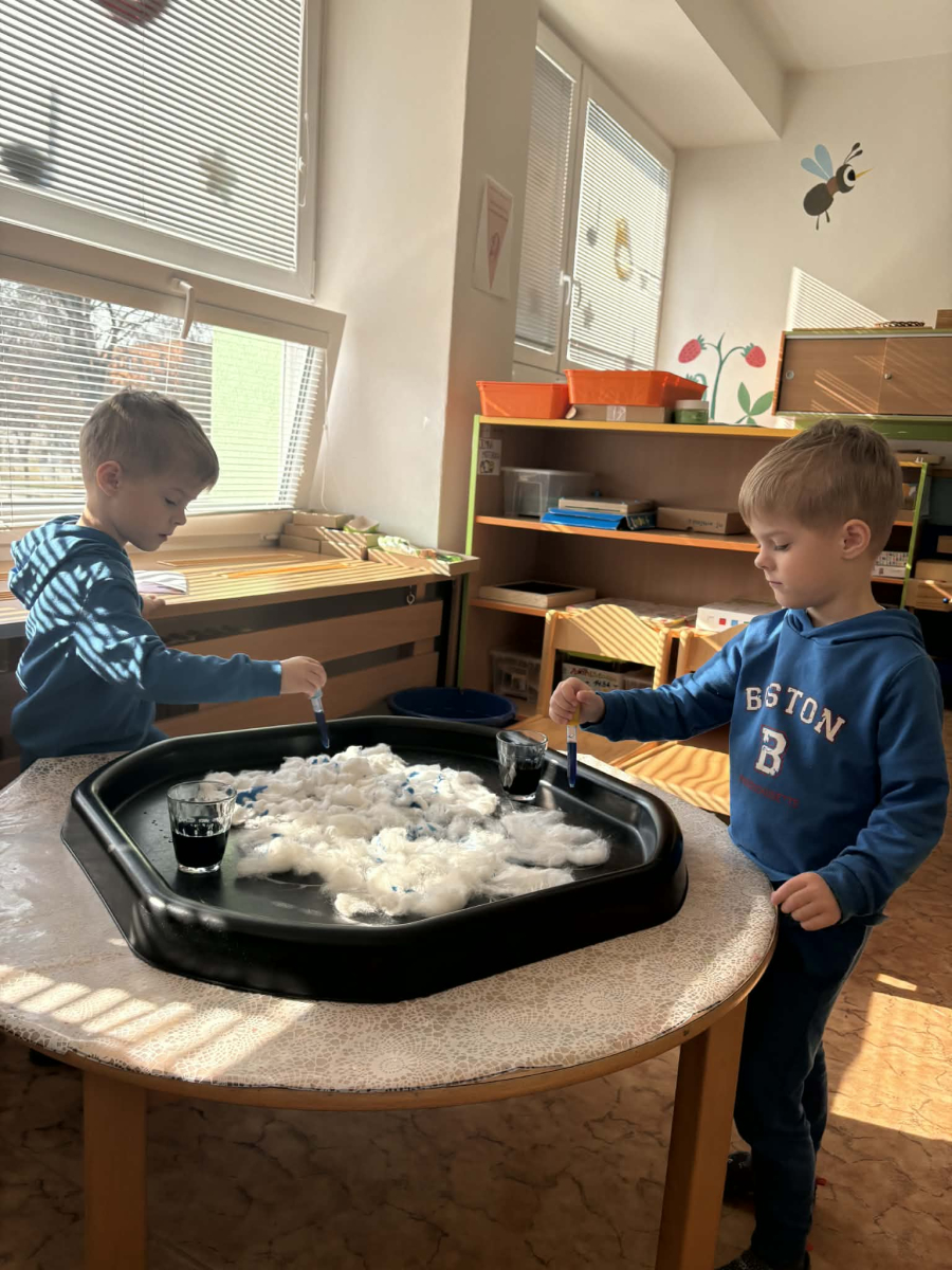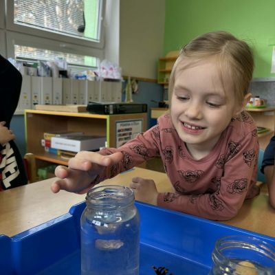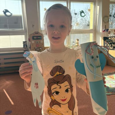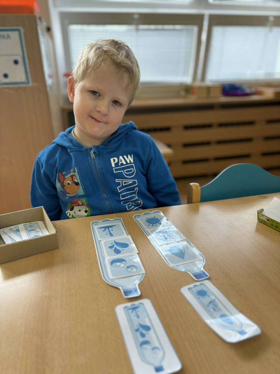 Minulý týden jsme zakončili výletem na Stezku vody v Bělském lese, na který jsme plynule navázali tématem o kapičce. Ta nás provedla týdnem plným aktivit zaměřených na koloběh vody. Společně jsme si stanovili pravidla pro šetření vodou, připomněli si, kde všude ji najdeme a k čemu všemu ji potřebujeme. Nechybělo ani zážitkové učení, vyzkoušeli jsme si nejrůznější pokusy i zábavné výtvarné techniky. Rozvíjeli jsme rytmus, motoriku i kreativitu a uspořádali soutěž o nejhezčí vodní vílu. Julinka a Saša přinesli nádherné postavičky, za které je čeká zasloužená odměna. Celý týden jsme pak zakončili Modrým dnem, kdy se naše třída proměnila v moře kapiček.