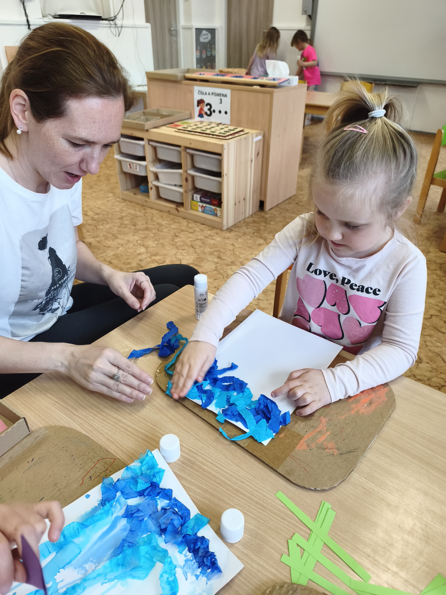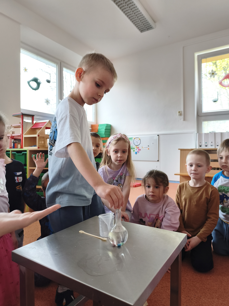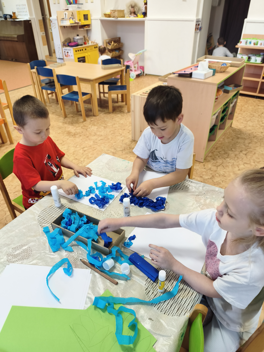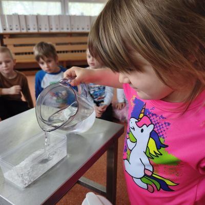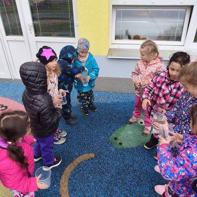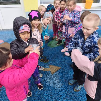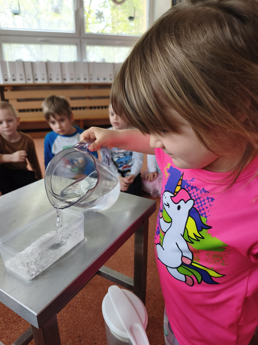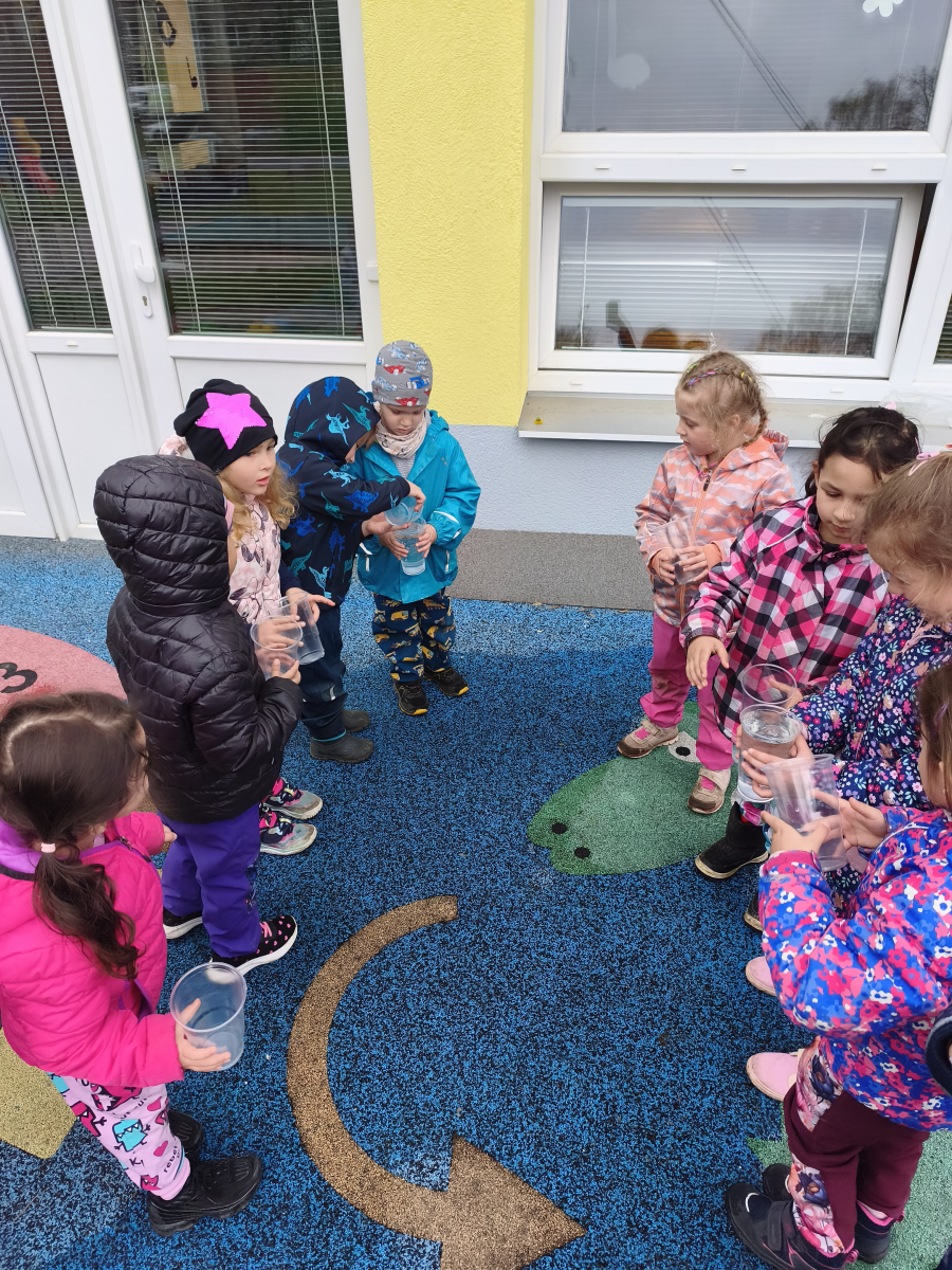 Tento týden jsme pokračovali s tématem Cesta vody. Povídali jsme si o tom, jak je voda důležitá pro naše tělo, zvířátka i rostliny, jak se dostane voda do kohoutku, jak se čistí a co všechno umí. Vyzkoušeli jsme si pokus s rozpouštěním ve vodě, odpařováním a rostoucími kameny. Vyrobili jsme si obrázek, který jsme vodou postříkali, a venku si zahráli soutěž s přeléváním vody. U stolečku jsme určovali, co patří do rybníku a co do moře, skládali jsme puzzle, procvičovali prstíky a určovali, na jaké písmenko začíná slovo kapka, déšť, moře atd. Odpoledne jsme byli čistit studánku v Bělském lese a ve třídě jsme relaxovali za zvuků vody.“