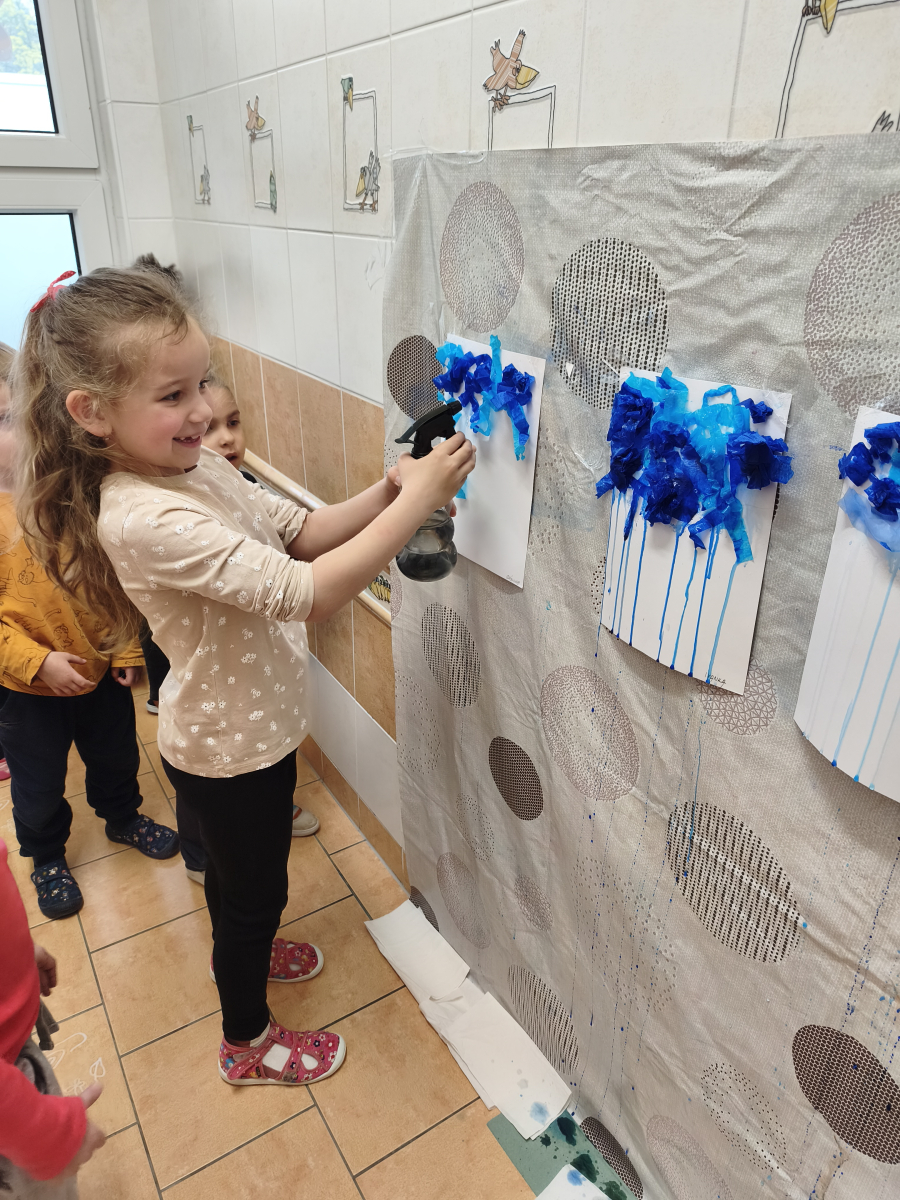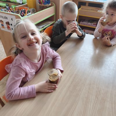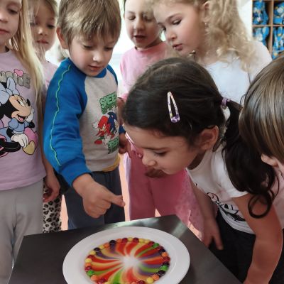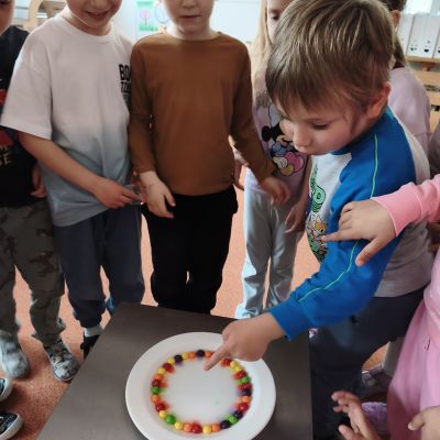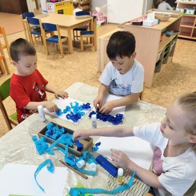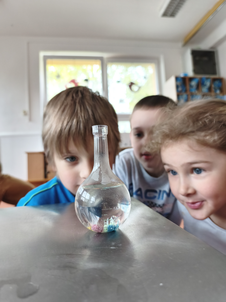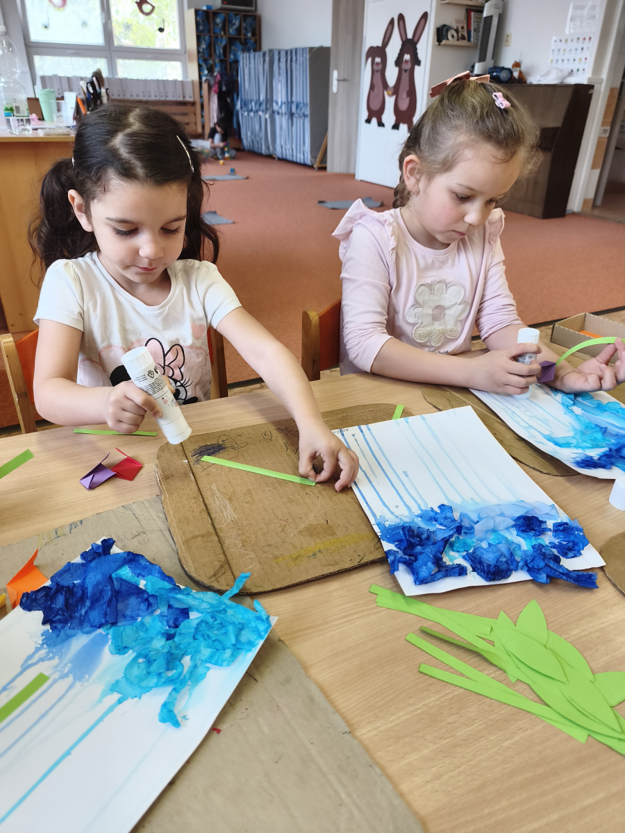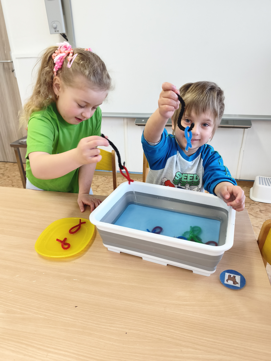 Tento týden jsme pokračovali s tématem Cesta vody. Povídali jsme si o tom, jak je voda důležitá pro naše tělo, zvířátka i rostliny, jak se dostane voda do kohoutku, jak se čistí a co všechno umí. Vyzkoušeli jsme si pokus s rozpouštěním ve vodě, odpařováním a rostoucími kameny. Vyrobili jsme si obrázek, který jsme vodou postříkali, a venku si zahráli soutěž s přeléváním vody. U stolečku jsme určovali, co patří do rybníku a co do moře, skládali jsme puzzle, procvičovali prstíky a určovali, na jaké písmenko začíná slovo kapka, déšť, moře atd. Odpoledne jsme byli čistit studánku v Bělském lese a ve třídě jsme relaxovali za zvuků vody.“