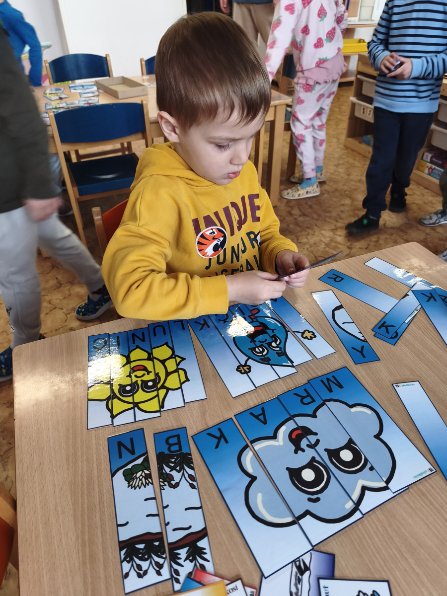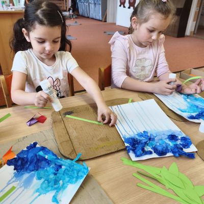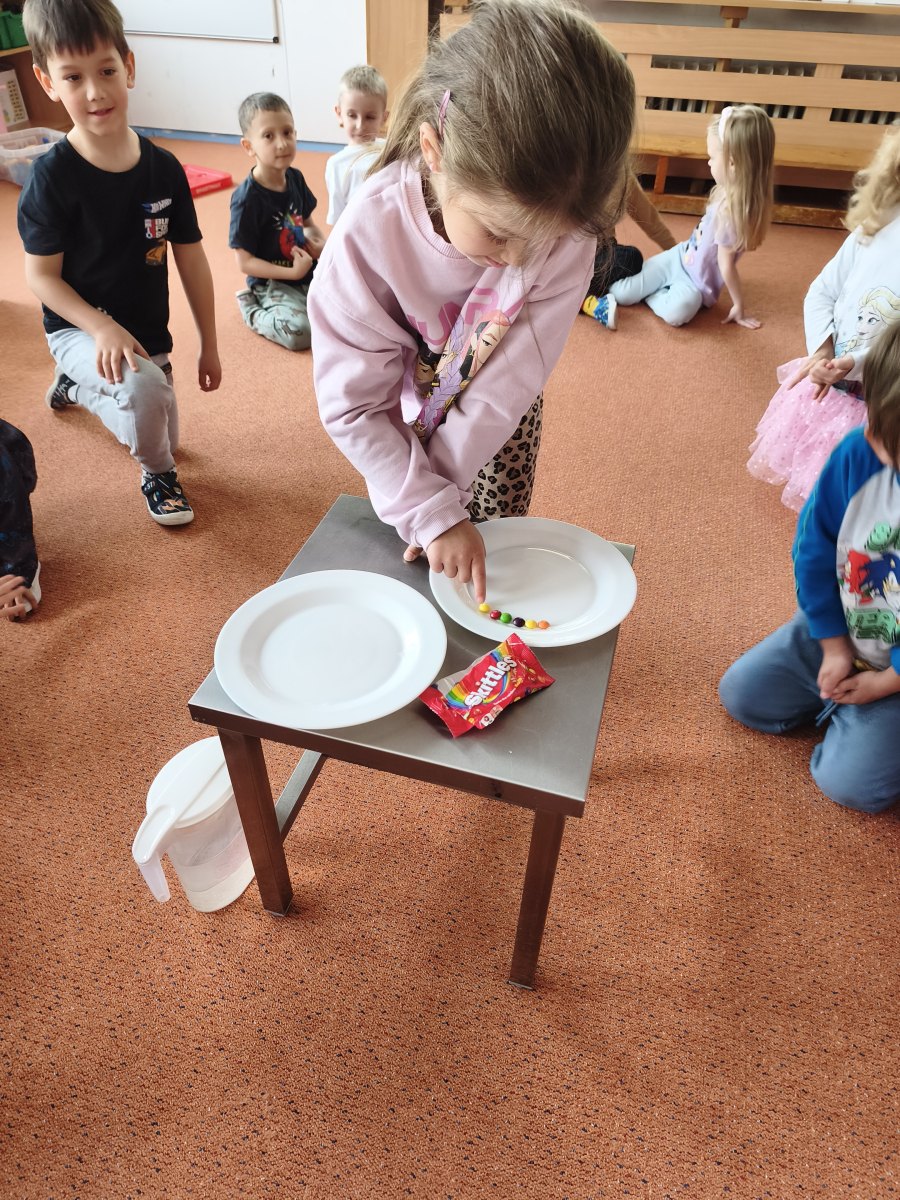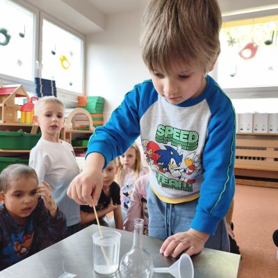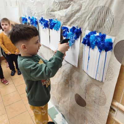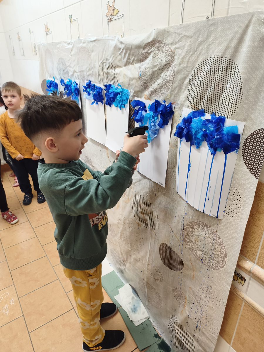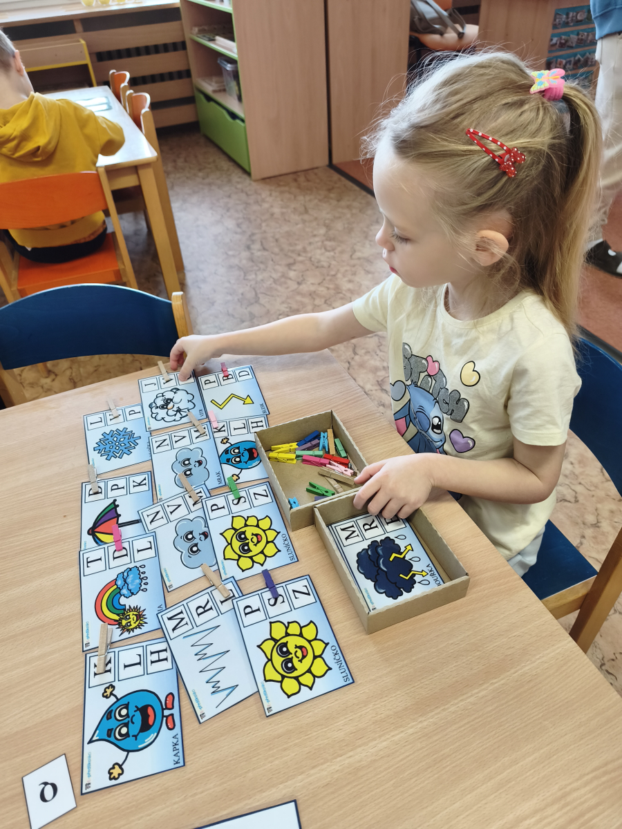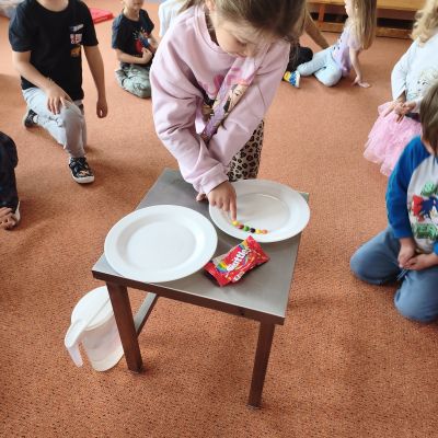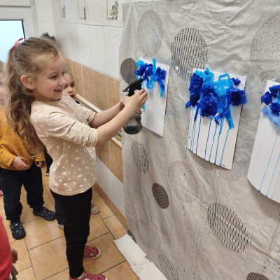 Tento týden jsme pokračovali s tématem Cesta vody. Povídali jsme si o tom, jak je voda důležitá pro naše tělo, zvířátka i rostliny, jak se dostane voda do kohoutku, jak se čistí a co všechno umí. Vyzkoušeli jsme si pokus s rozpouštěním ve vodě, odpařováním a rostoucími kameny. Vyrobili jsme si obrázek, který jsme vodou postříkali, a venku si zahráli soutěž s přeléváním vody. U stolečku jsme určovali, co patří do rybníku a co do moře, skládali jsme puzzle, procvičovali prstíky a určovali, na jaké písmenko začíná slovo kapka, déšť, moře atd. Odpoledne jsme byli čistit studánku v Bělském lese a ve třídě jsme relaxovali za zvuků vody.“