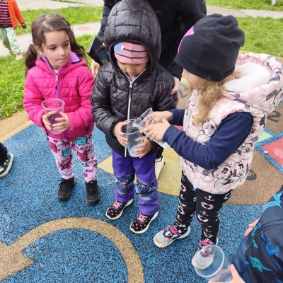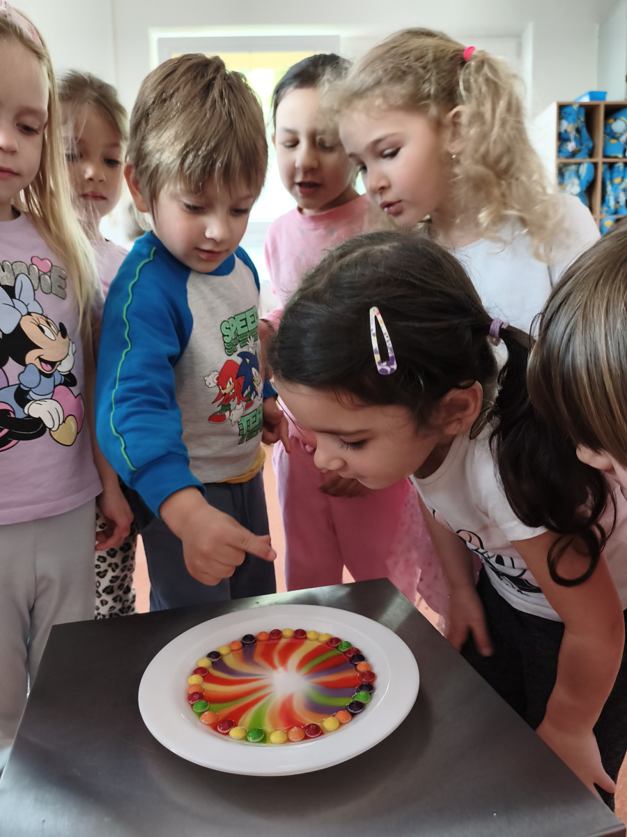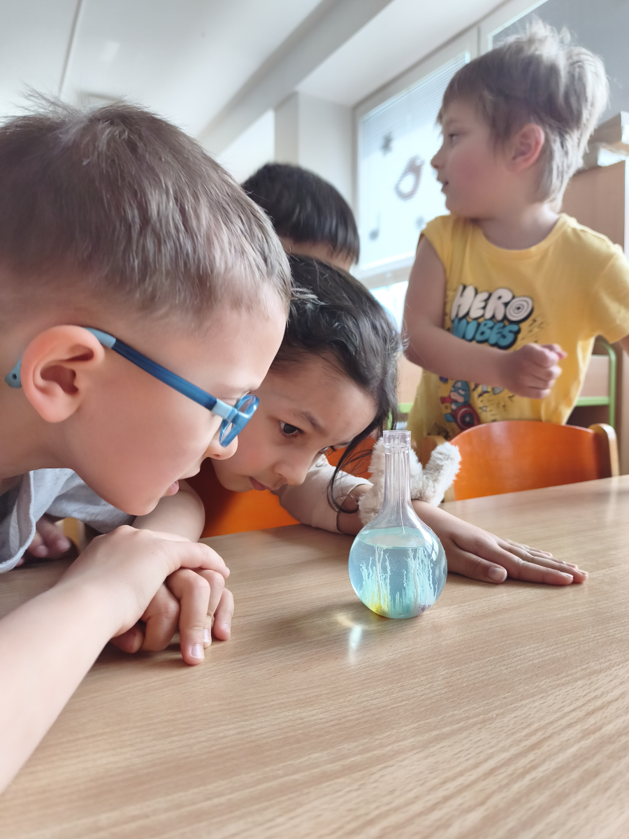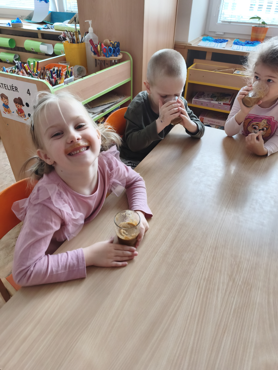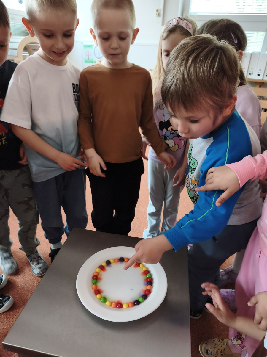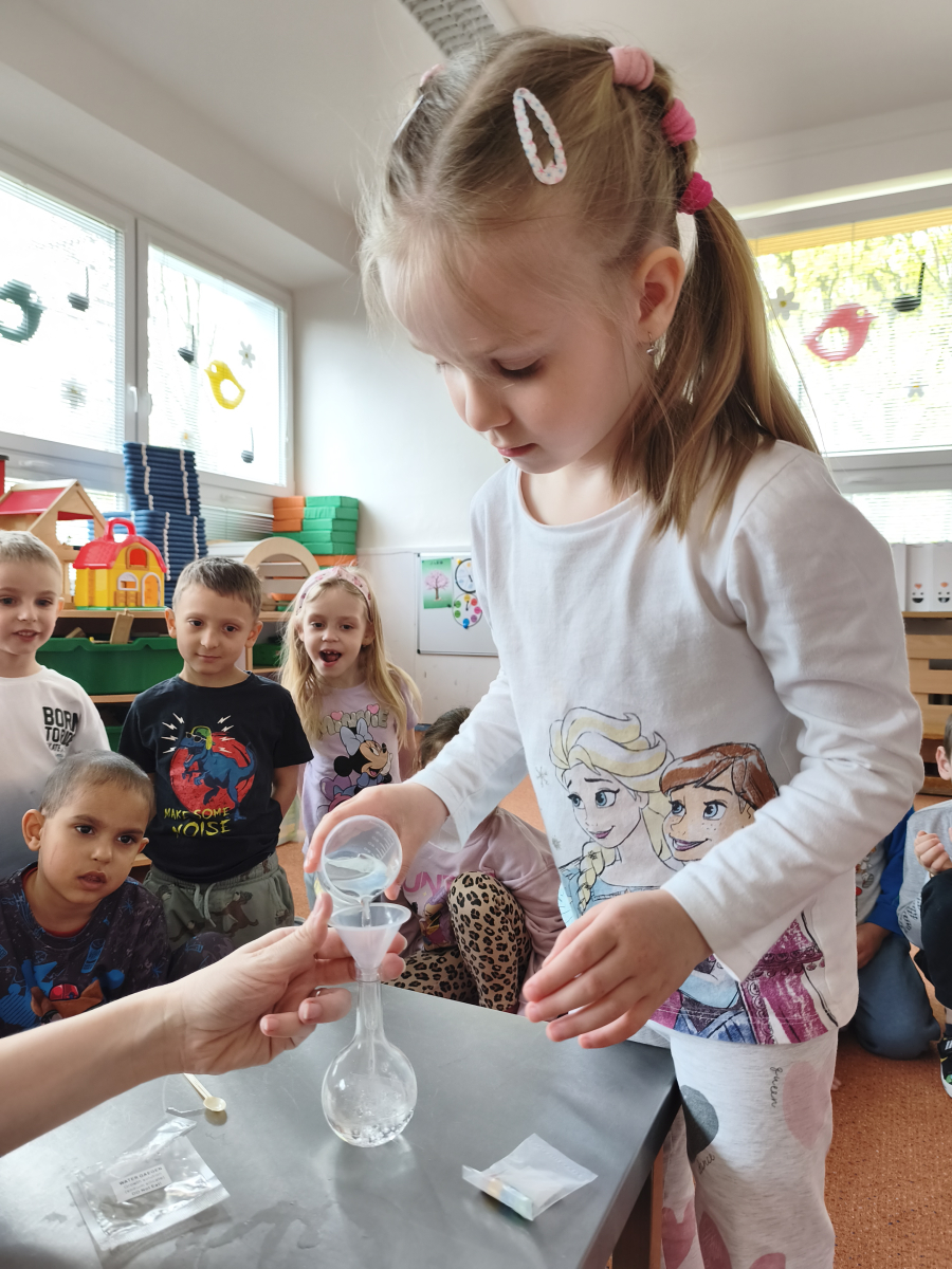 Tento týden jsme pokračovali s tématem Cesta vody. Povídali jsme si o tom, jak je voda důležitá pro naše tělo, zvířátka i rostliny, jak se dostane voda do kohoutku, jak se čistí a co všechno umí. Vyzkoušeli jsme si pokus s rozpouštěním ve vodě, odpařováním a rostoucími kameny. Vyrobili jsme si obrázek, který jsme vodou postříkali, a venku si zahráli soutěž s přeléváním vody. U stolečku jsme určovali, co patří do rybníku a co do moře, skládali jsme puzzle, procvičovali prstíky a určovali, na jaké písmenko začíná slovo kapka, déšť, moře atd. Odpoledne jsme byli čistit studánku v Bělském lese a ve třídě jsme relaxovali za zvuků vody.“