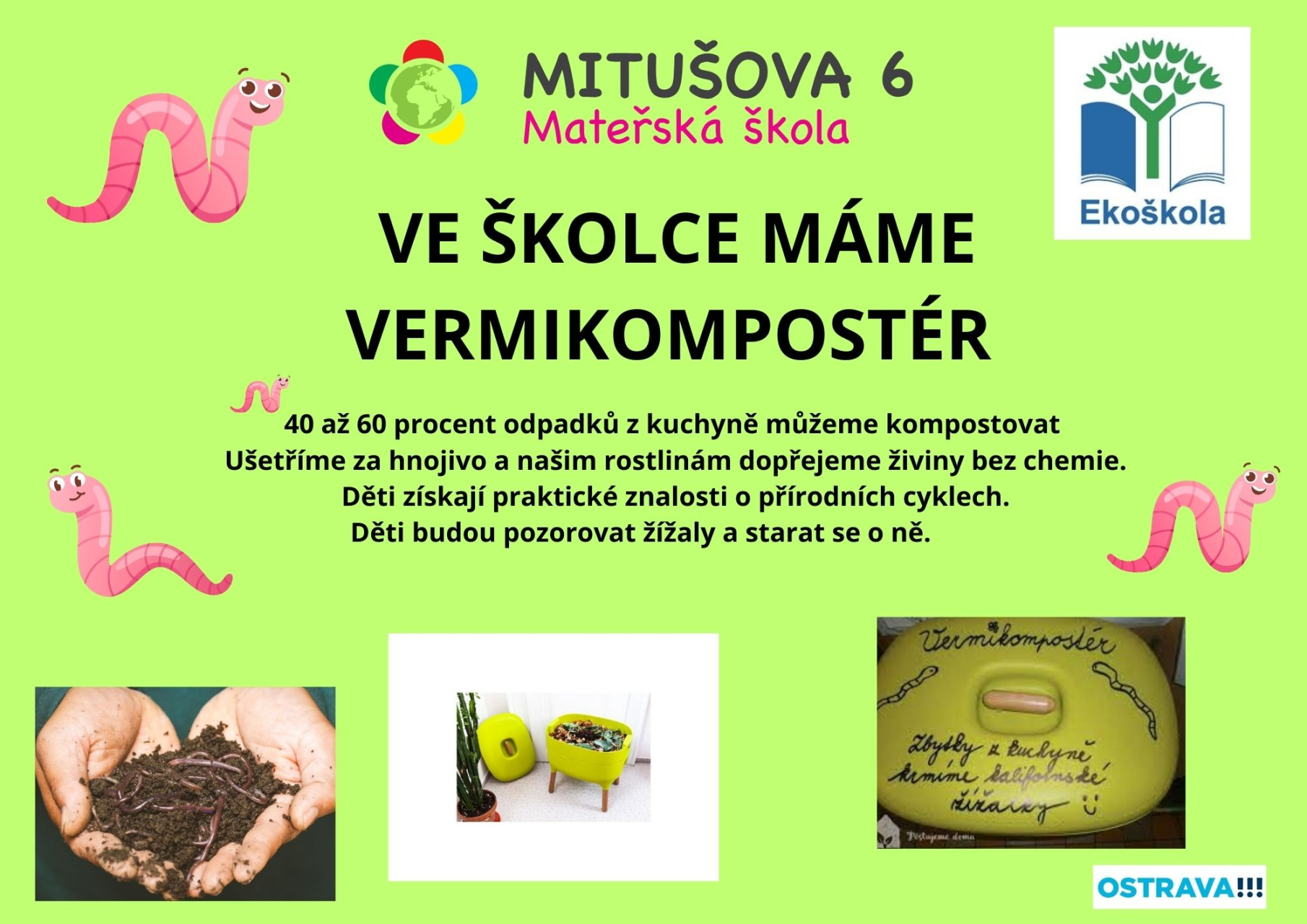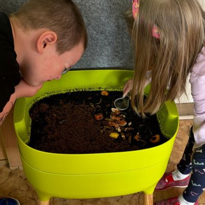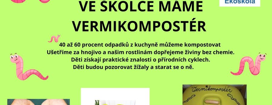 Ve školce se nám rozmožily žížaly. Naštěstí se třída Pejsků nabídla, že je vezme pod své ochrané křídla. a tak žížaly našly nový domov. Od teď nám žížaly pomáhají rozkládat zbytky z kuchyně na kvalitní přírodní hnojivo. Díky nim se bioodpad mění na výživný kompost, který prospívá rostlinám. Vermikompostér je skvělý i pro děti – učí je, jak funguje koloběh v přírodě a proč je důležité neplýtvat.